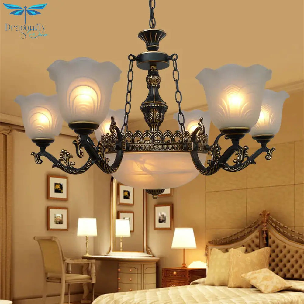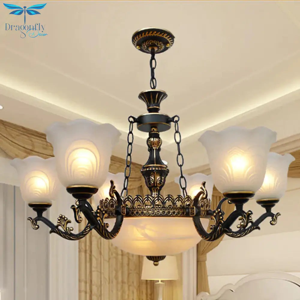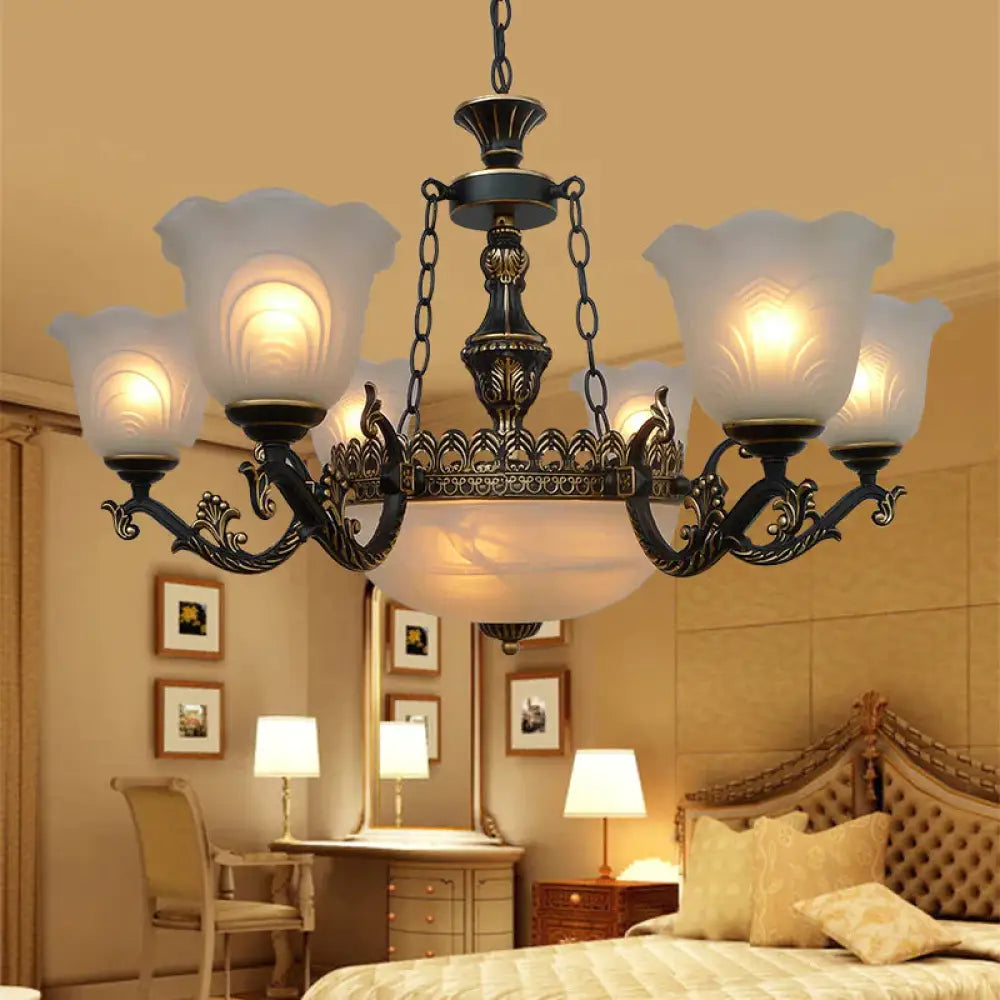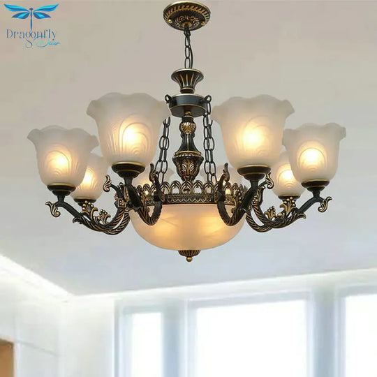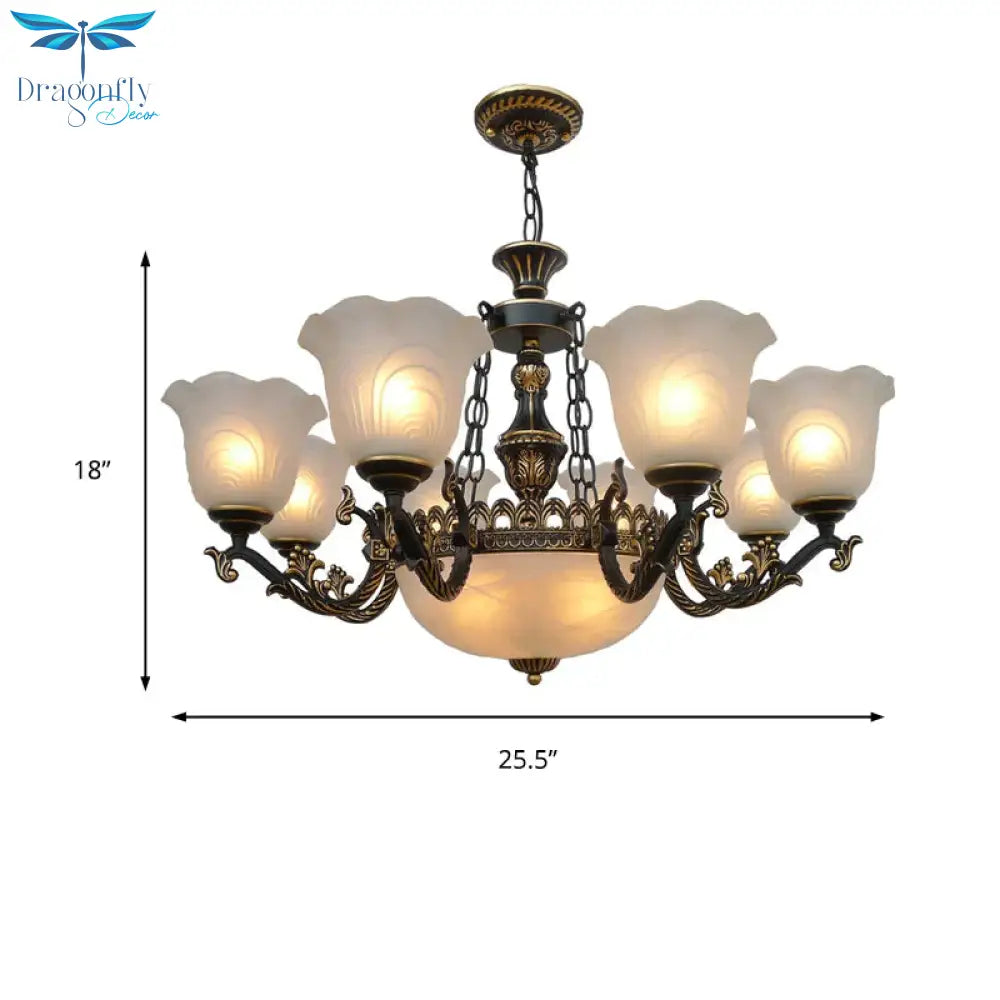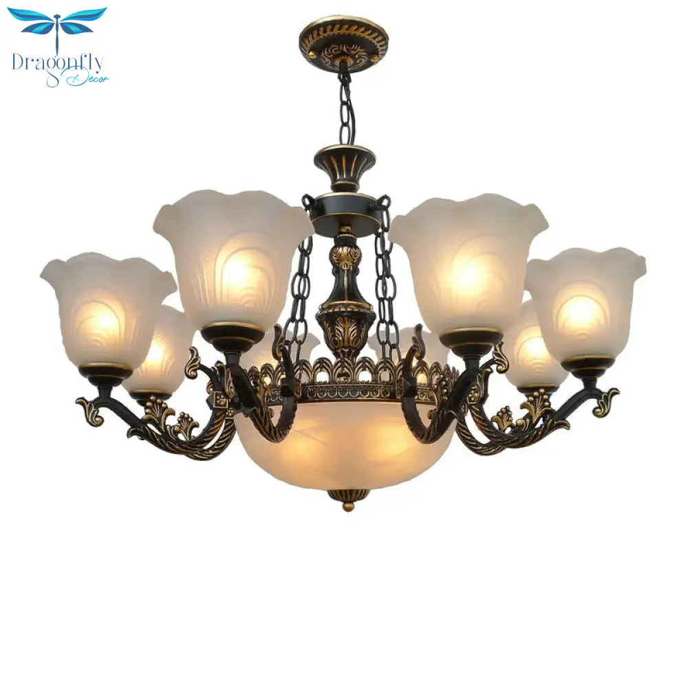 Bronze Flared Pendant Lighting Traditional Frosted Textured Glass 9/11 Light Living Room Chandelier