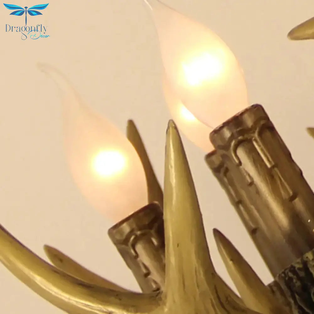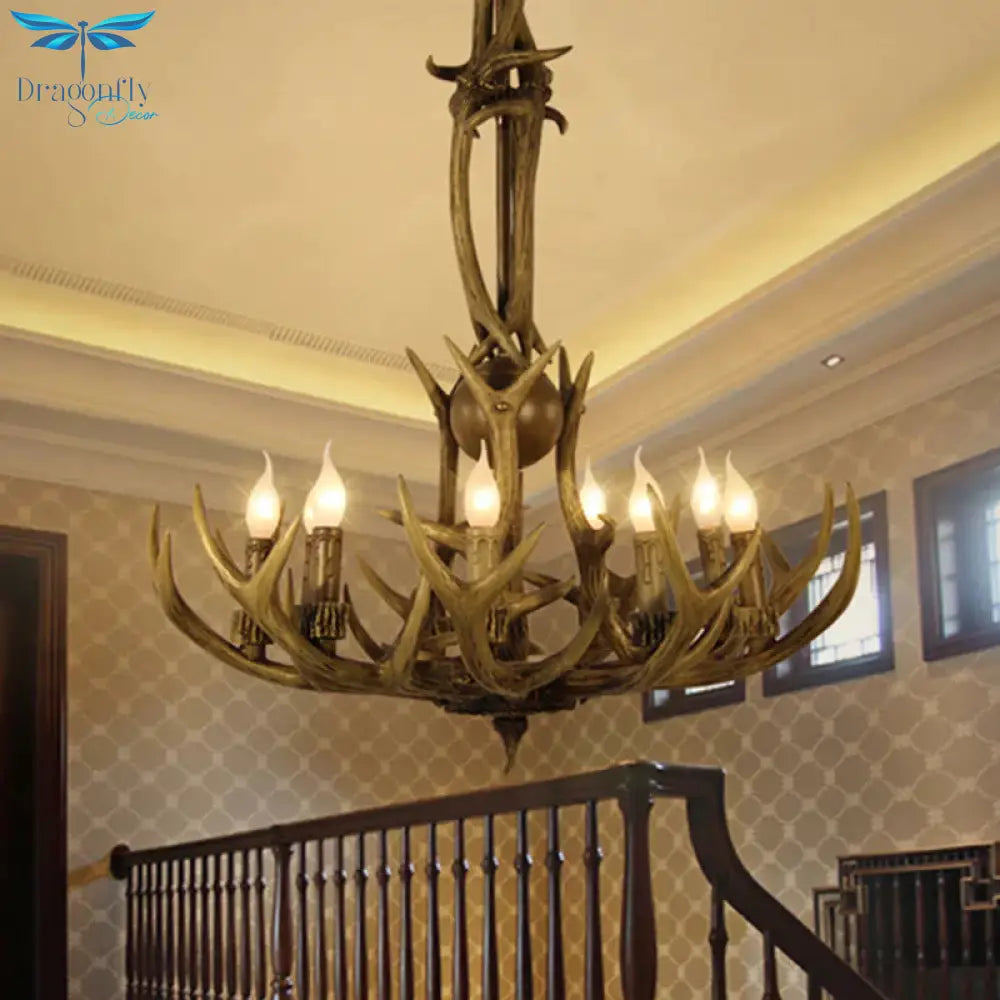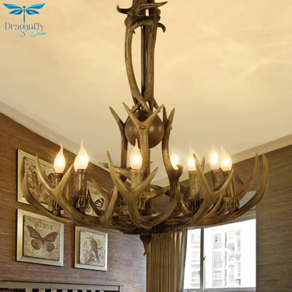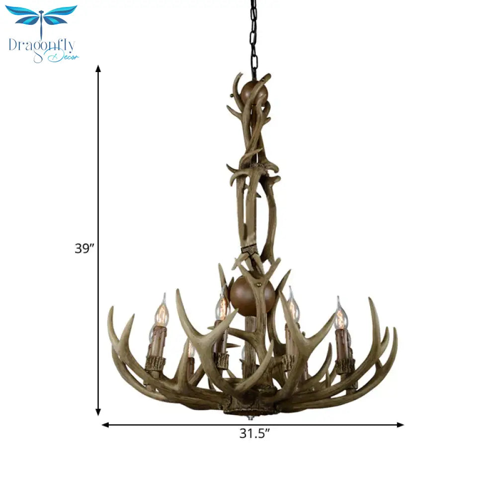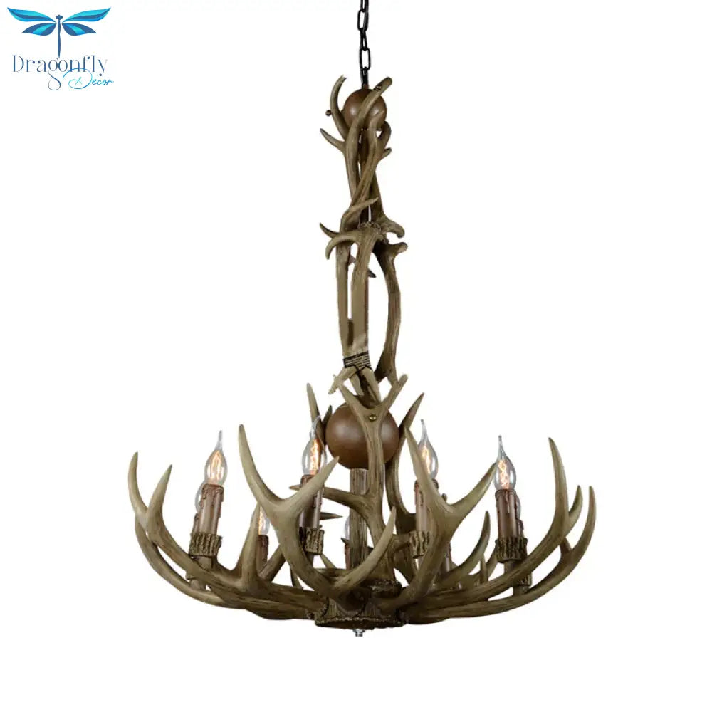 Brown 9 Lights Hanging Chandelier Rustic Resin Candle Ceiling Suspension Lamp with Antler Design