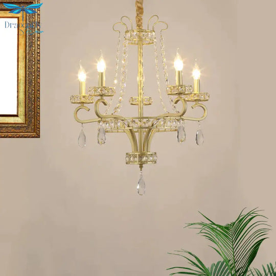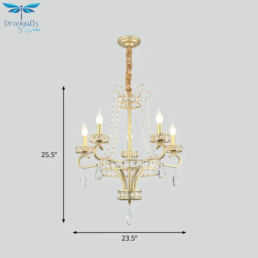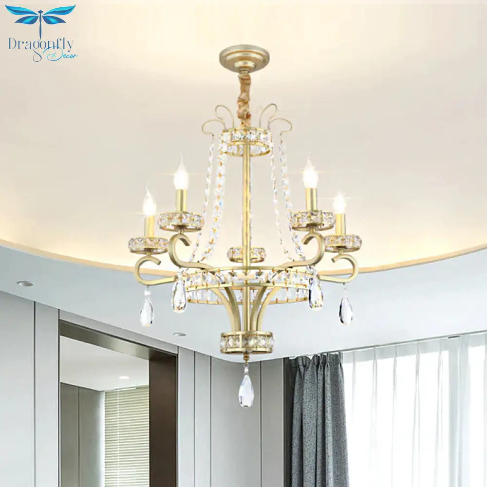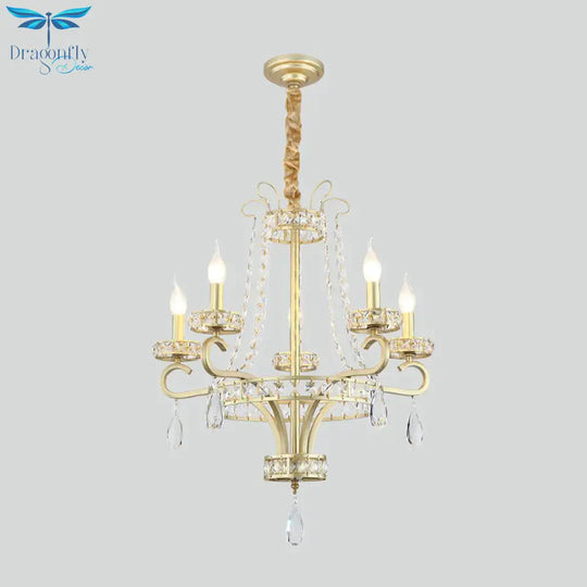 Candle Crystal Teardrops Chandelier Traditional 5 Bulbs Dinning Room Suspension Light In Gold