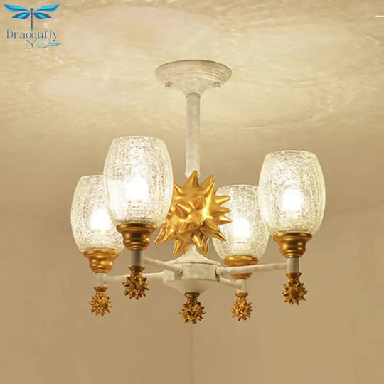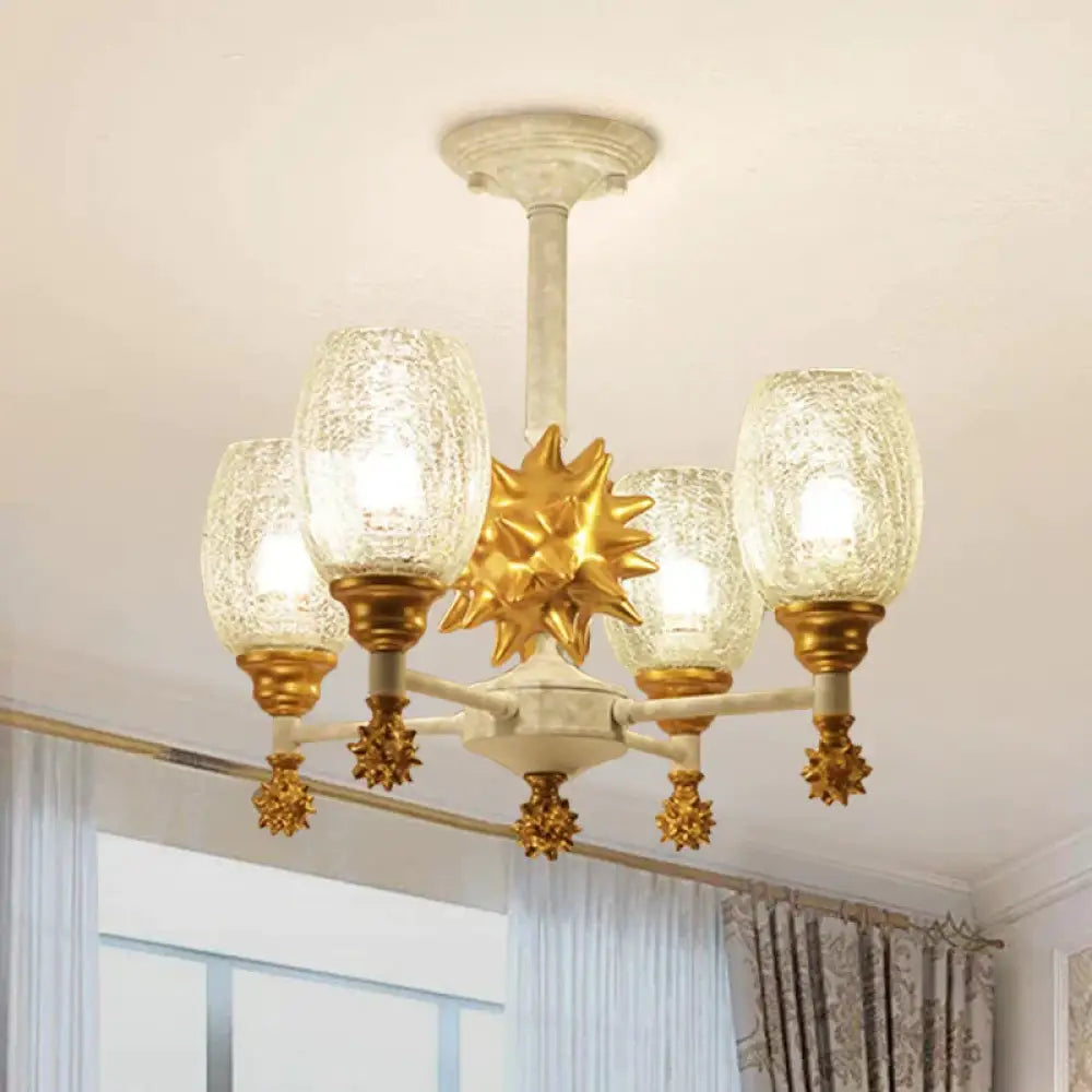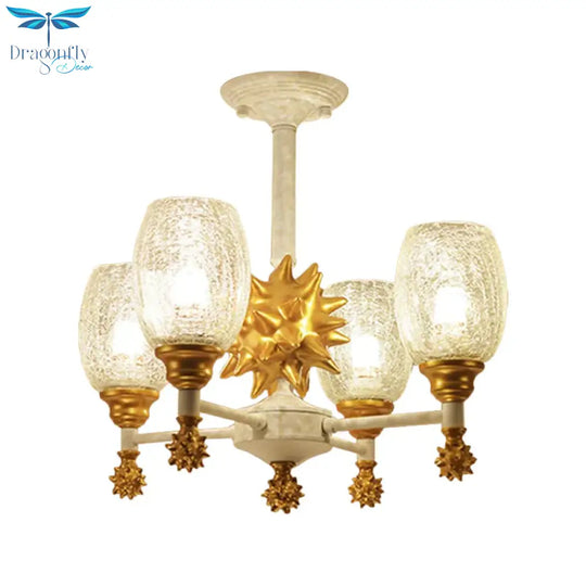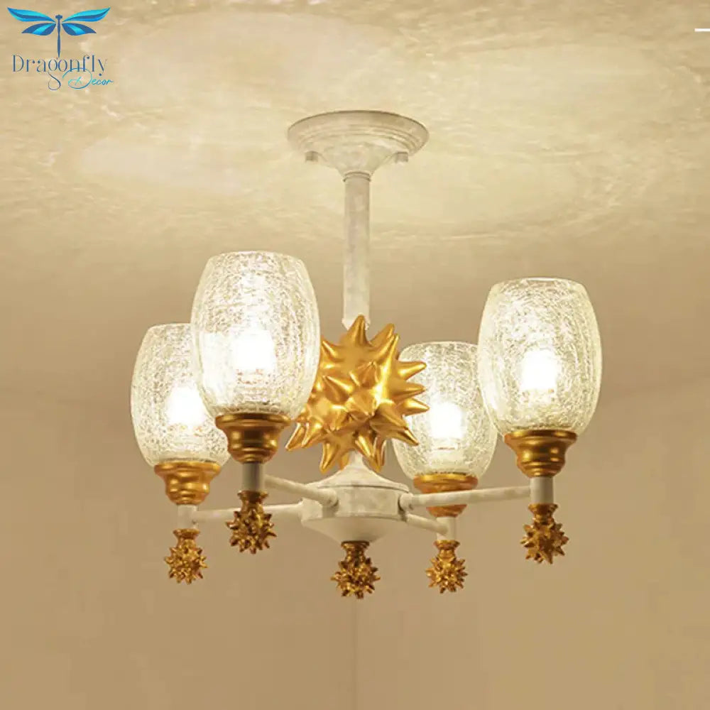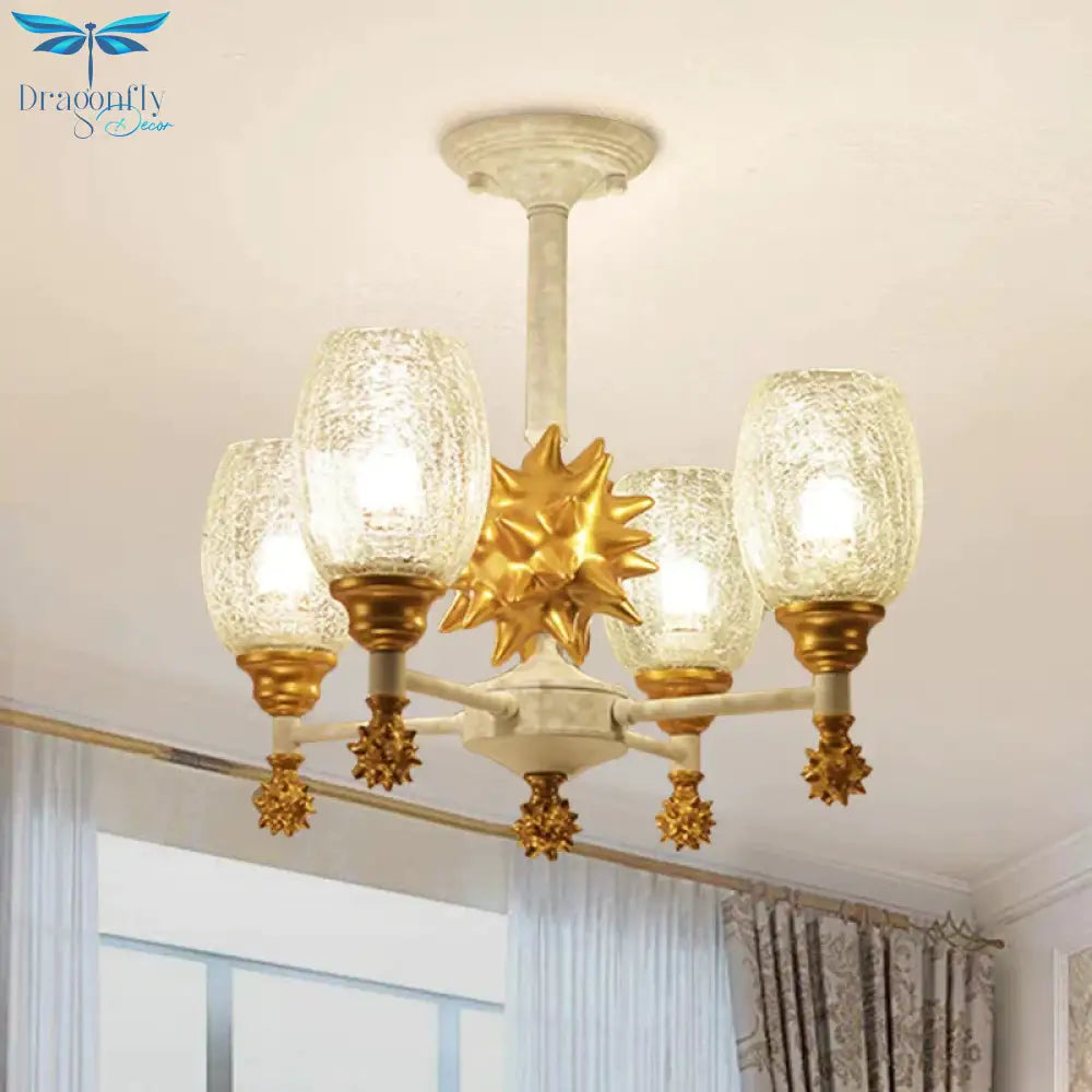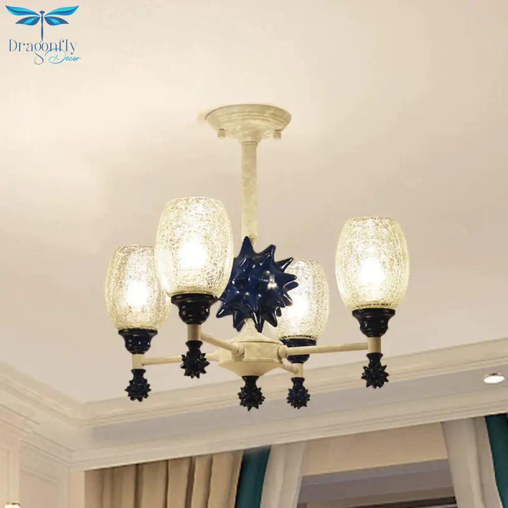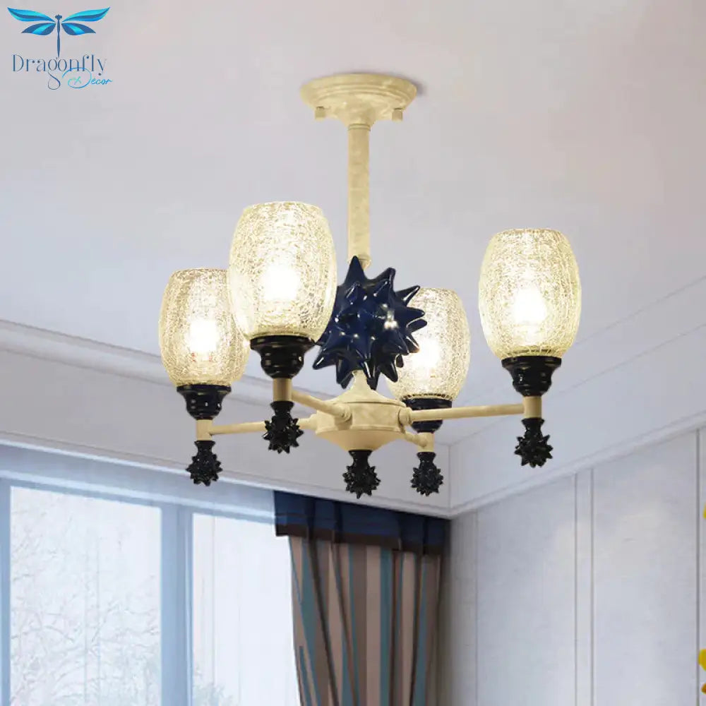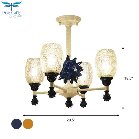 Clear Crackle Glass Cup-Like Pendant Coastal 4-Bulb Gold/Dark Blue Chandelier Lighting with Sea Urchin Design