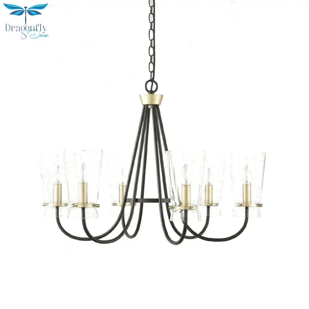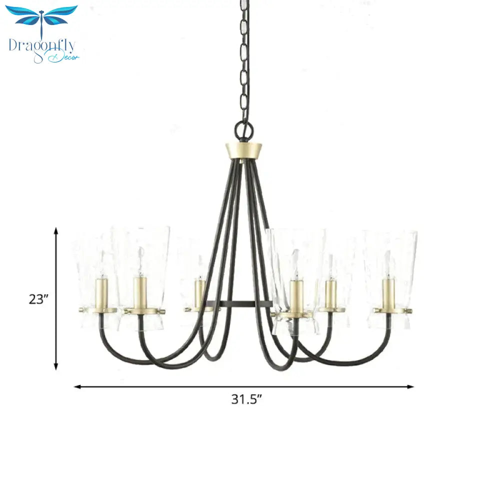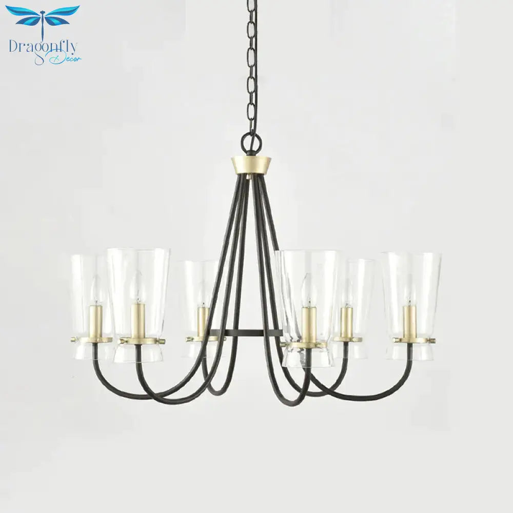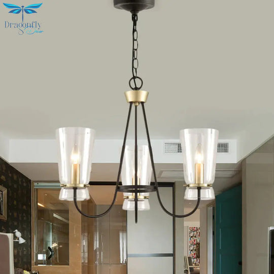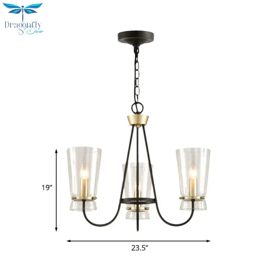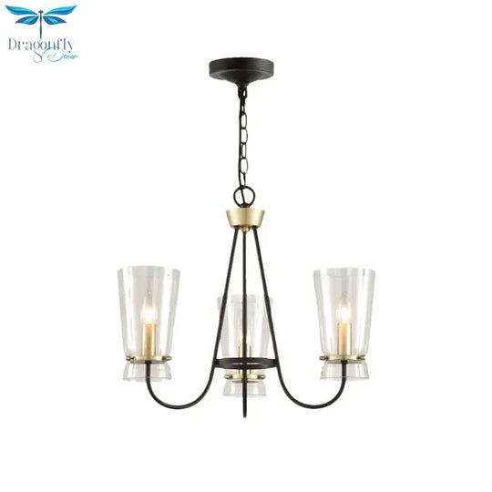 Clear Glass Cone Hanging Chandelier Vintage 3/6 Lights Bedroom Suspension Lamp in Black with Curving Arm