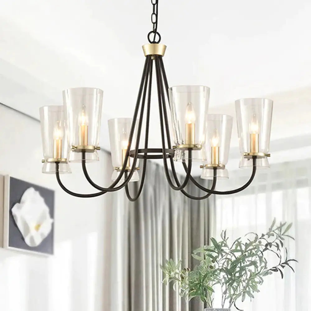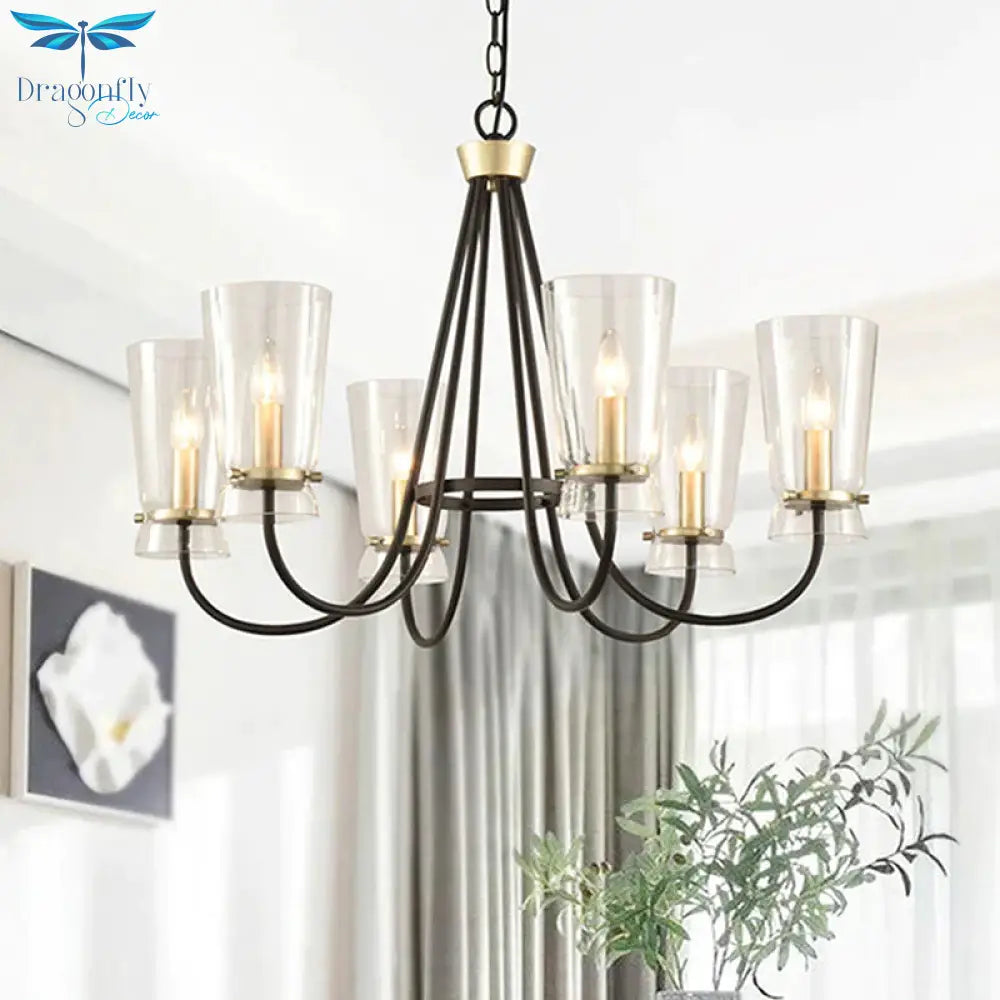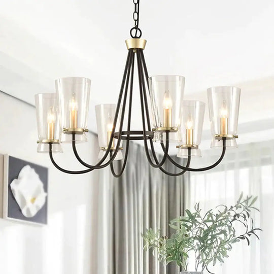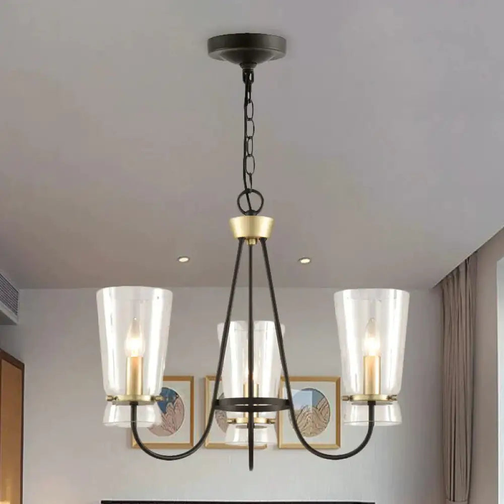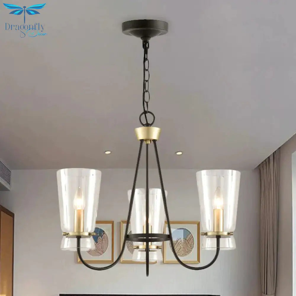Clear Glass Cone Hanging Chandelier Vintage 3/6 Lights Bedroom Suspension Lamp in Black with Curving Arm