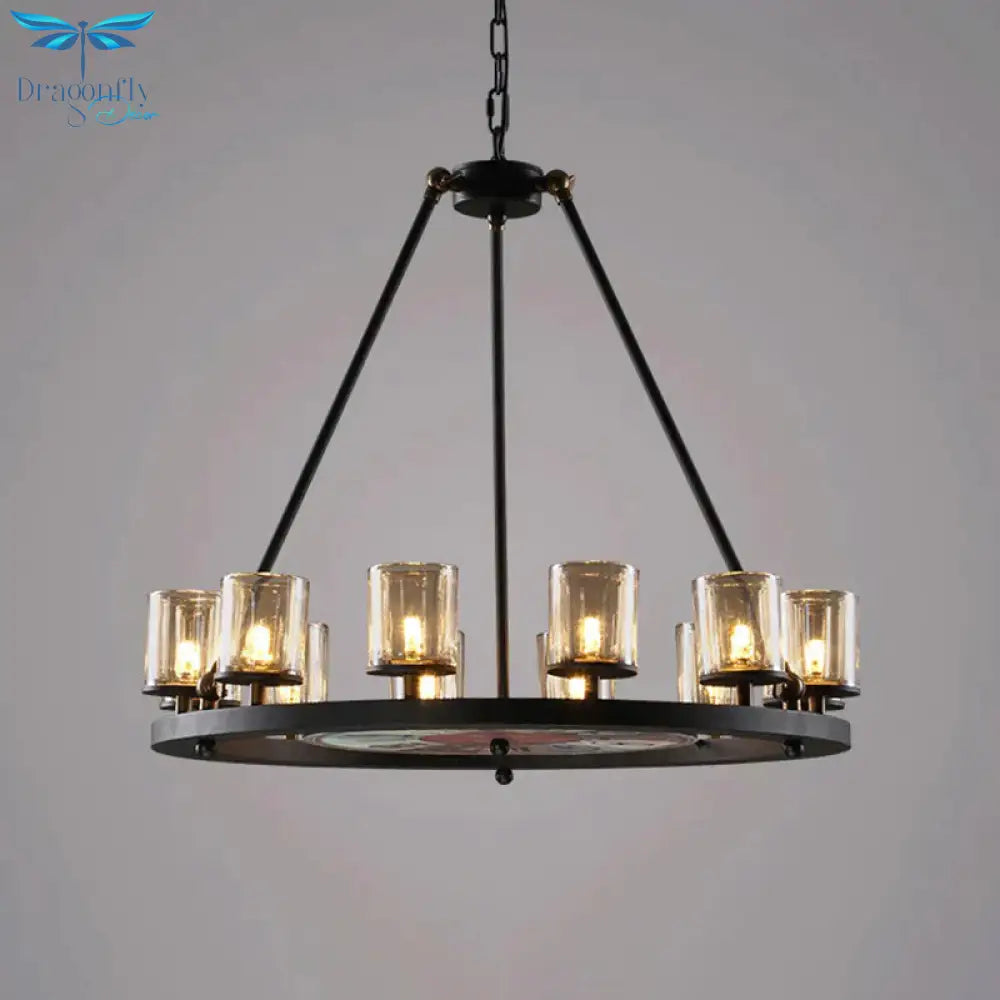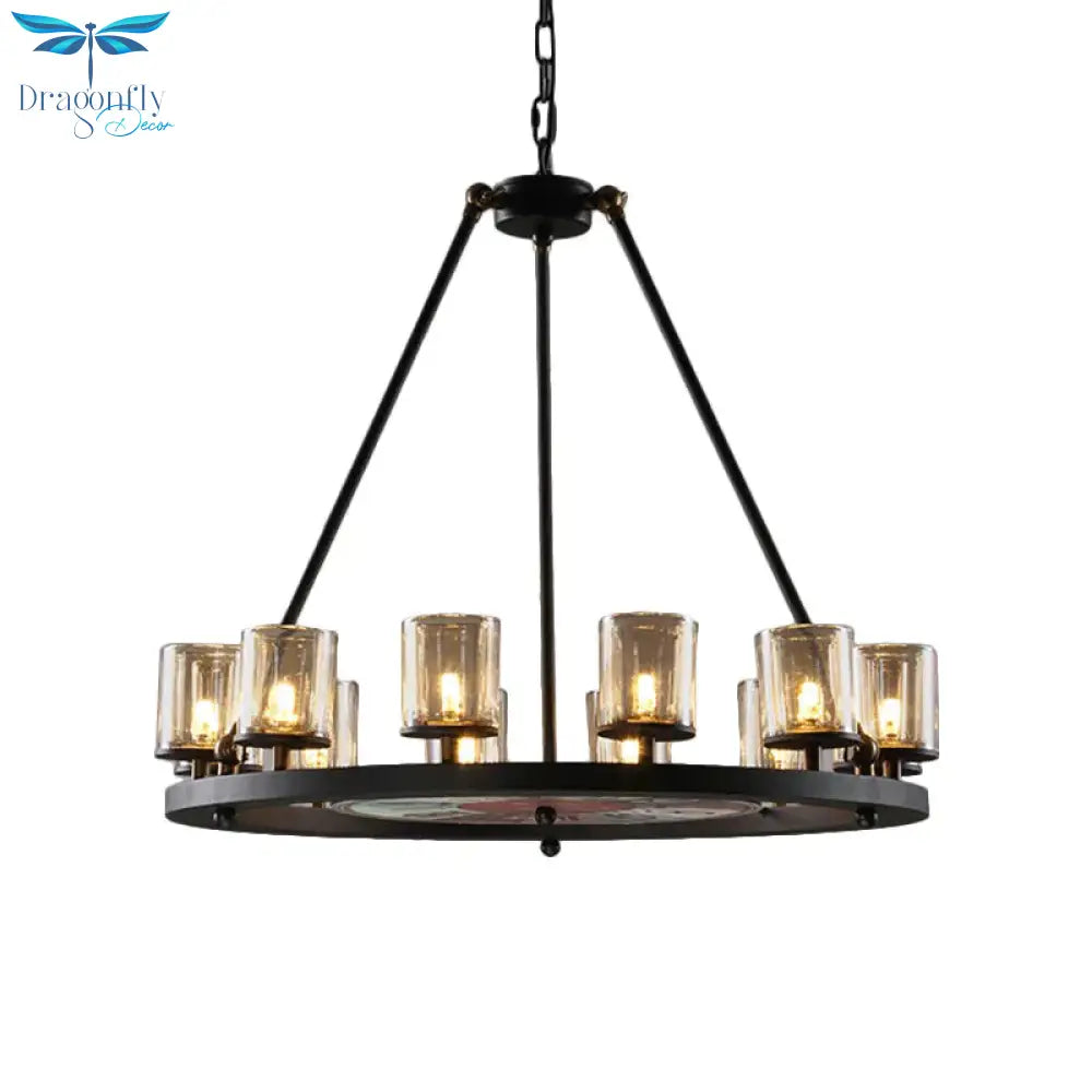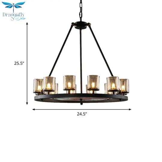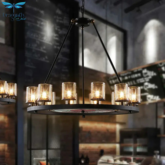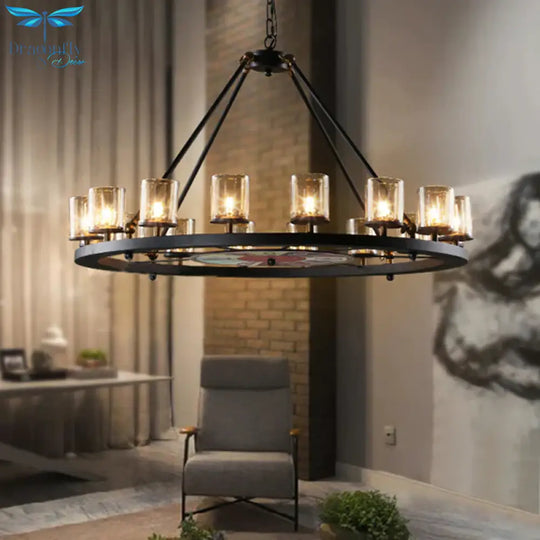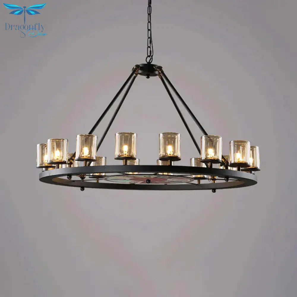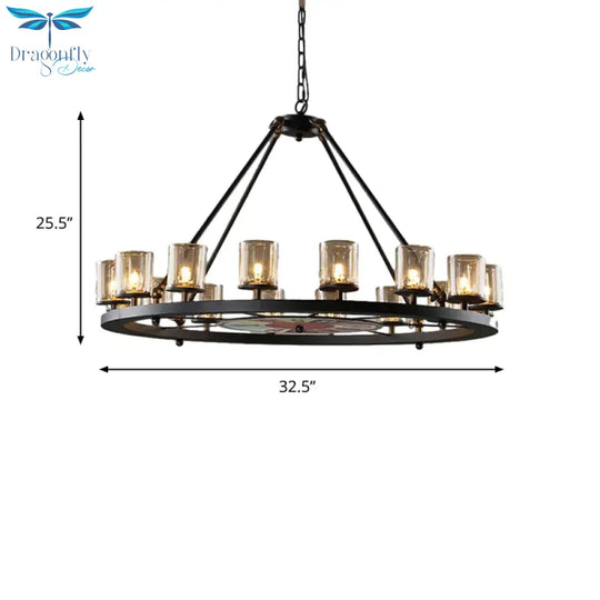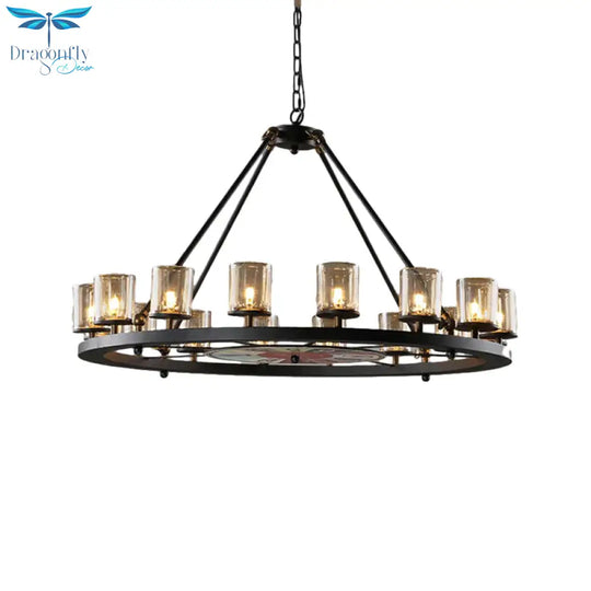 Clear Glass Wagon Wheel Hanging Chandelier Classic 12/16 Lights Living Room Pendant Light with Cylinder Shade