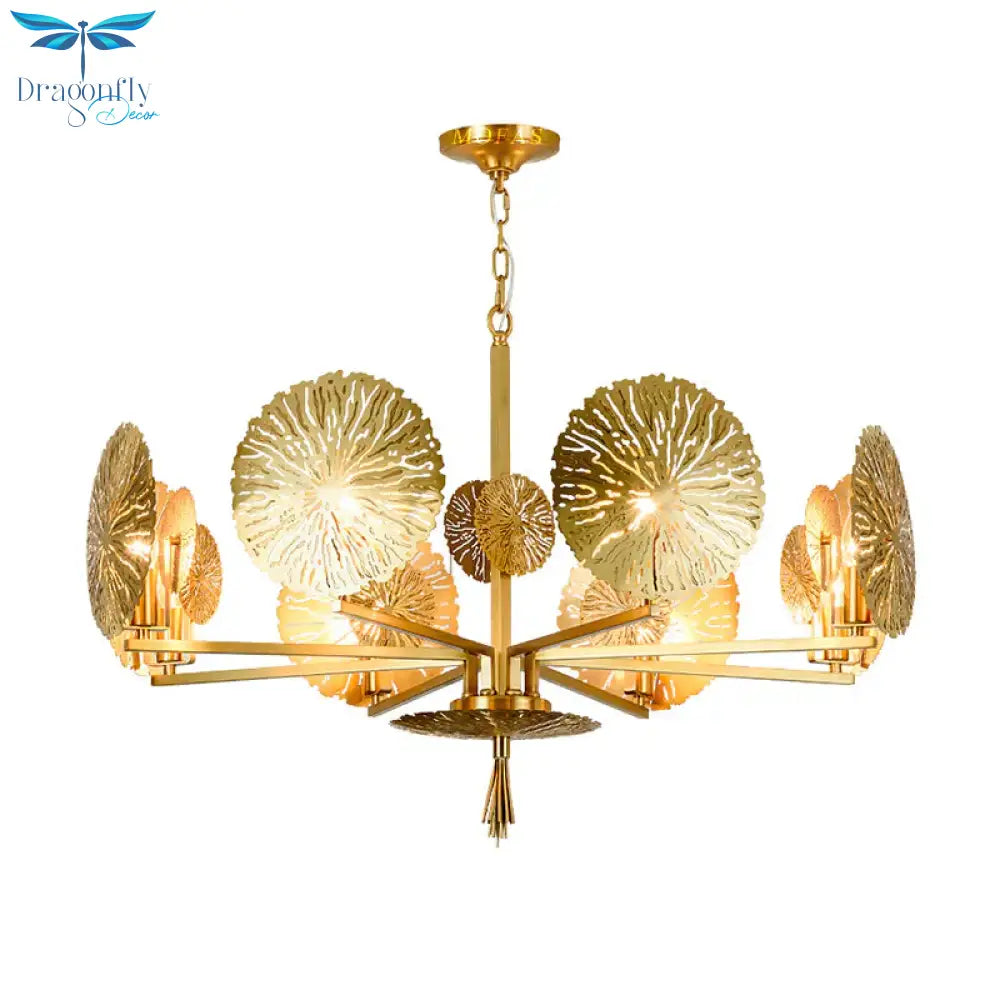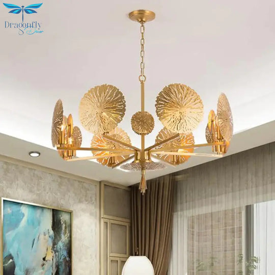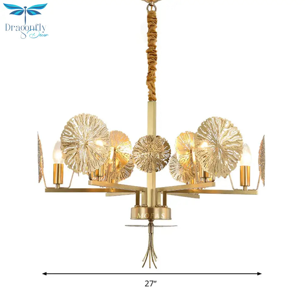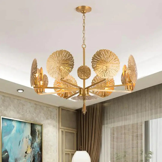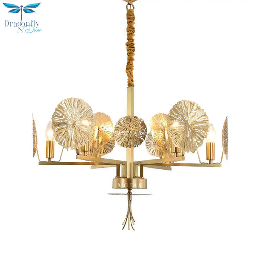 Colonial Lotus Pendant Ceiling Light 6/8 Heads Metal Chandelier Lighting Fixture in Gold for Living Room