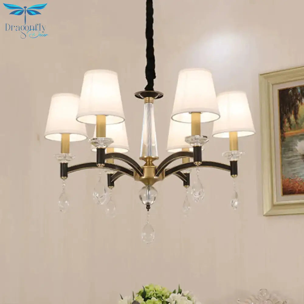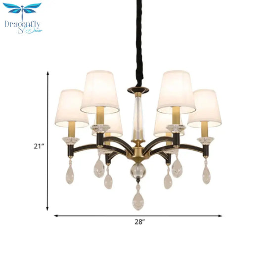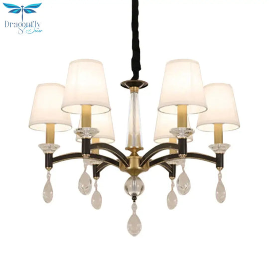 Conical Fabric Hanging Chandelier Vintage 6-Bulb Dining Room Pendant Light Fixture in White with Crystal Accent