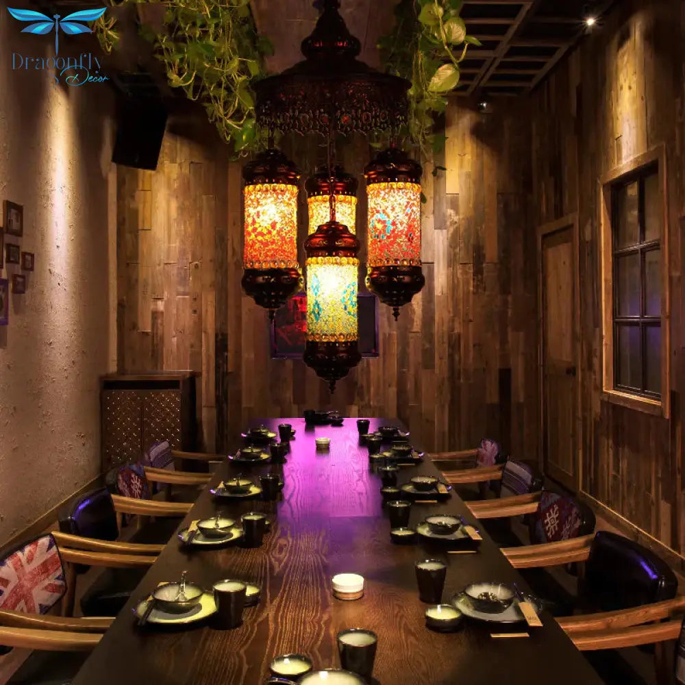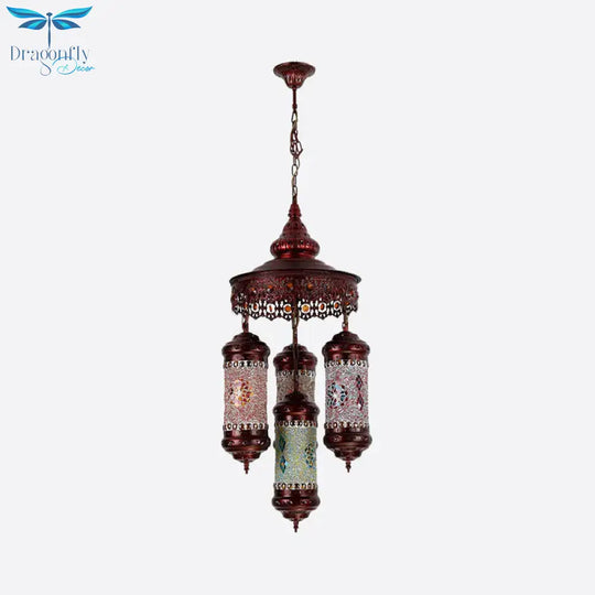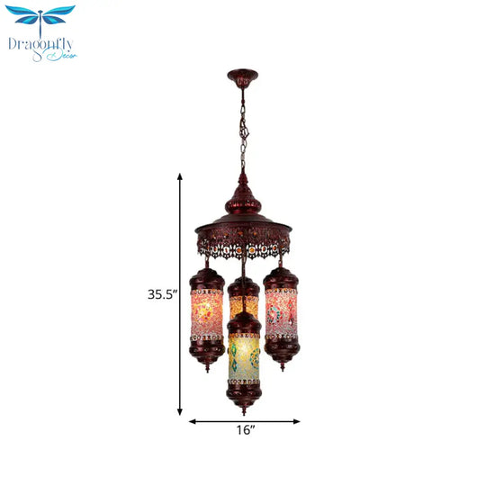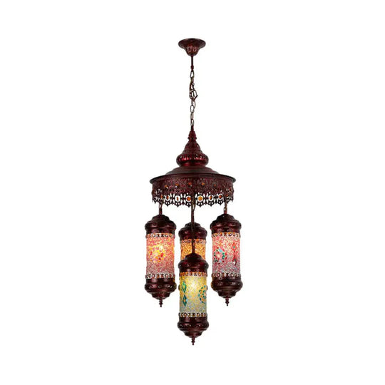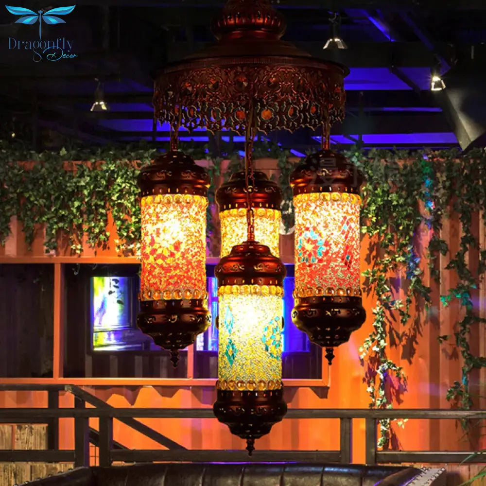 Copper Cylinder Chandelier Lighting Art Deco Stained Glass 4 Lights Bar Hanging Pendant Lamp
