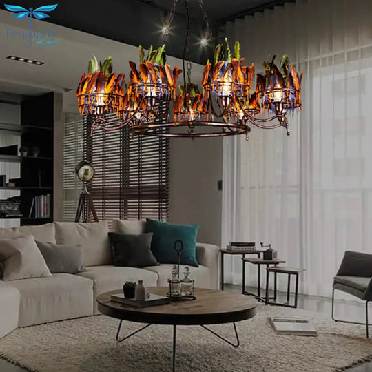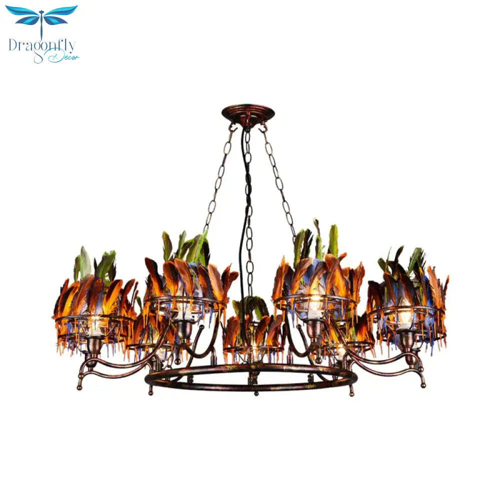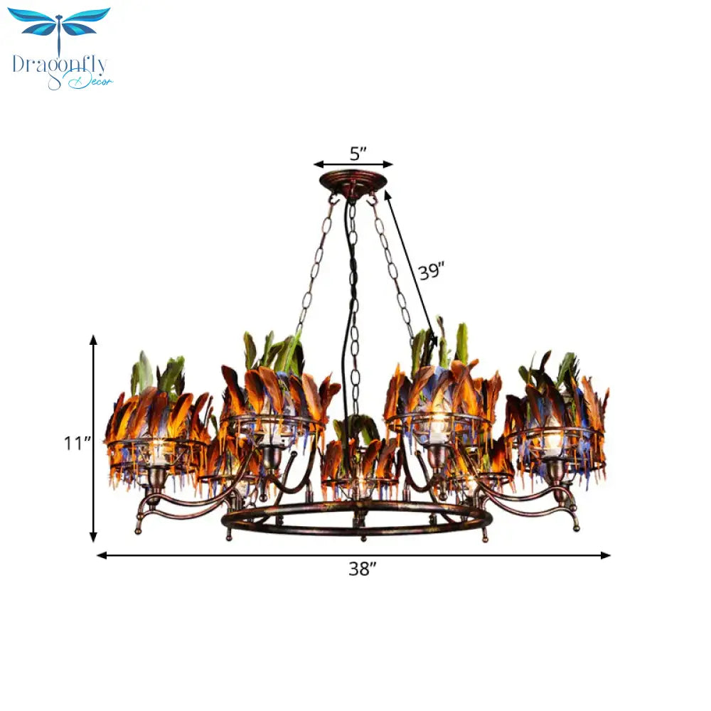 Copper Finish 9 - Head Traditional Chandelier Lamp With Indian Feather Headwear Element
