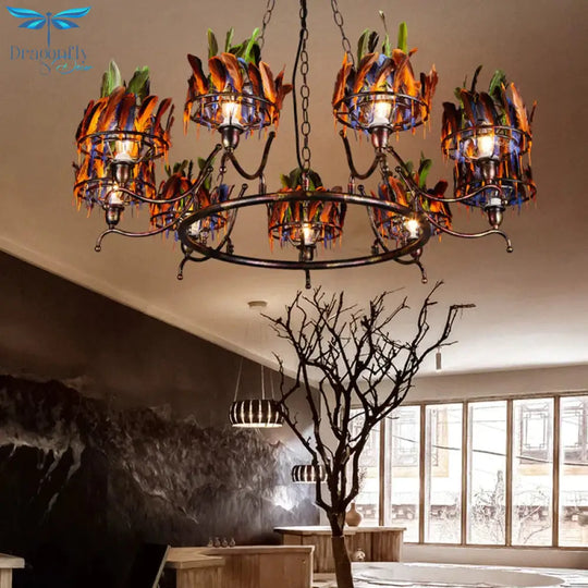 Copper Finish 9-Head Traditional Chandelier Lamp with Indian Feather Headwear Element