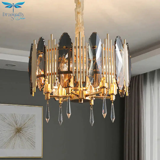 Crystal Block Gold Chandelier Light Fixture Round 6 Heads Traditional Pendant Lighting
