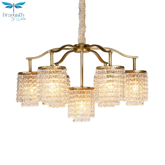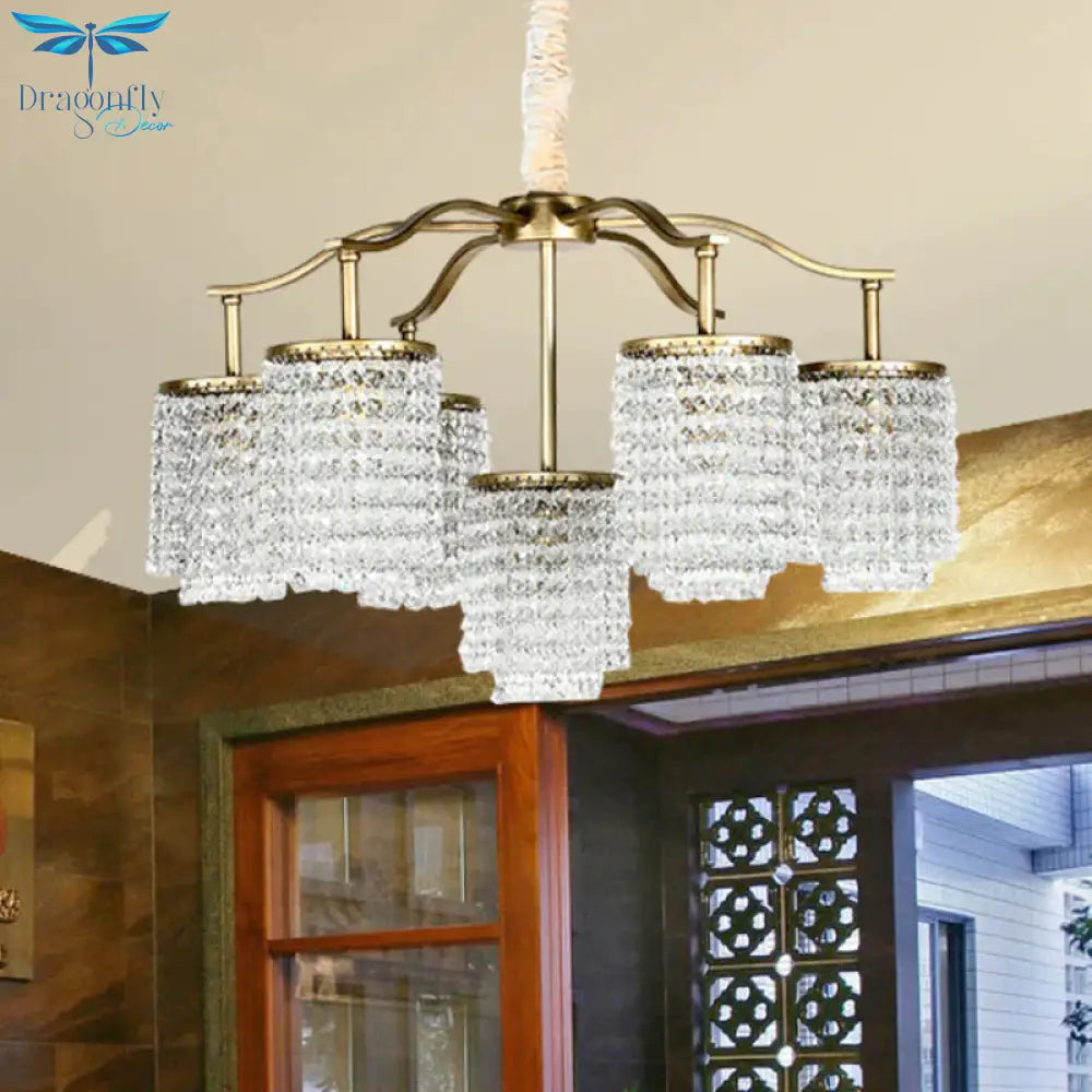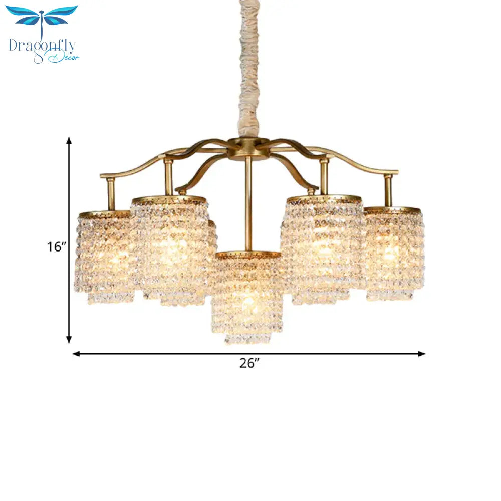 Crystal Cylinder Chandelier Light Fixture Rural 7 Heads Dining Room Ceiling Pendant in Brass