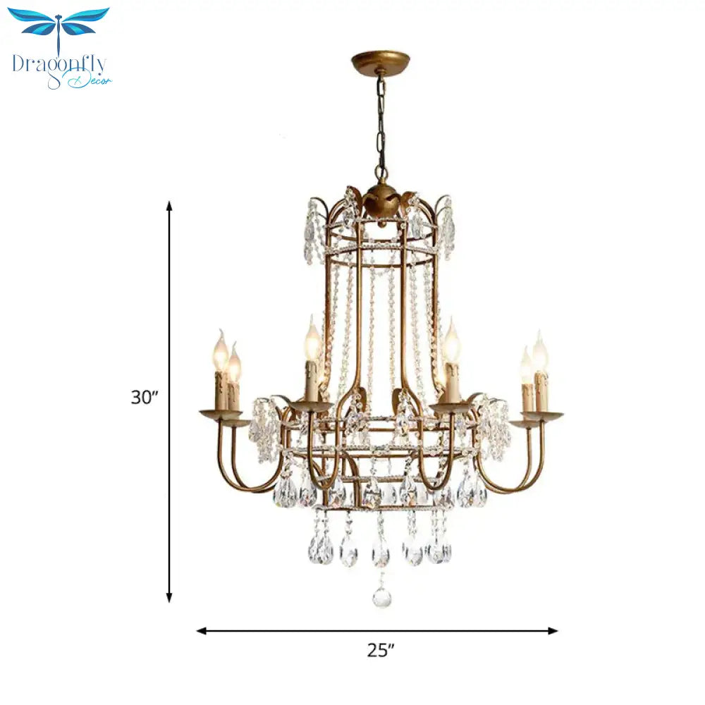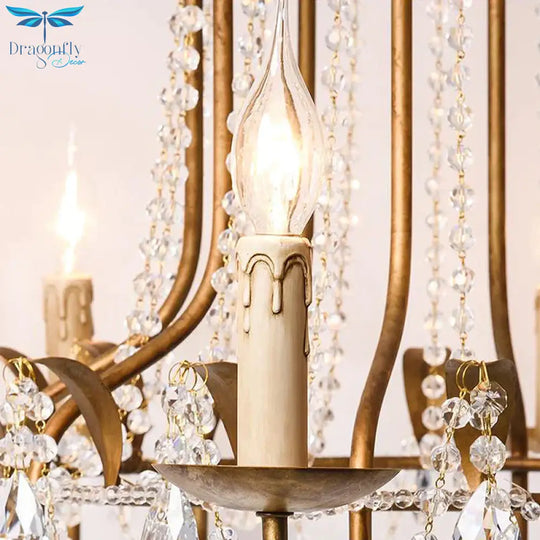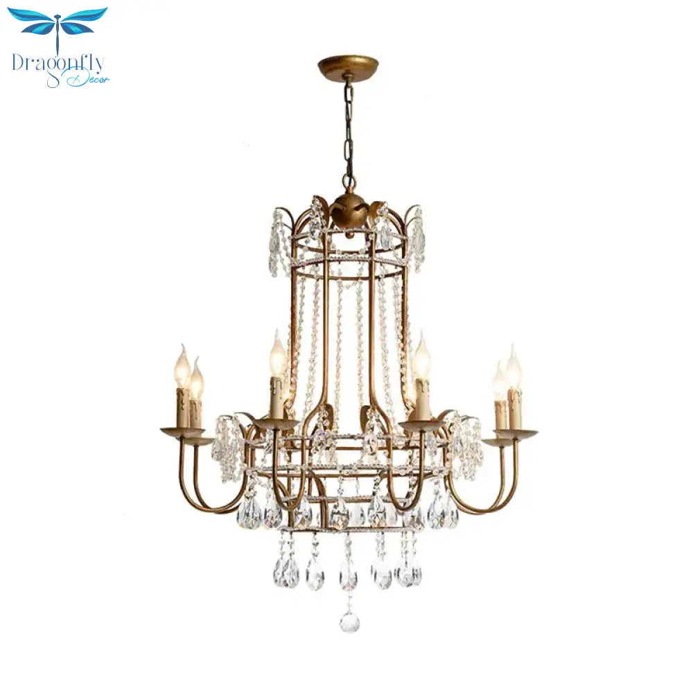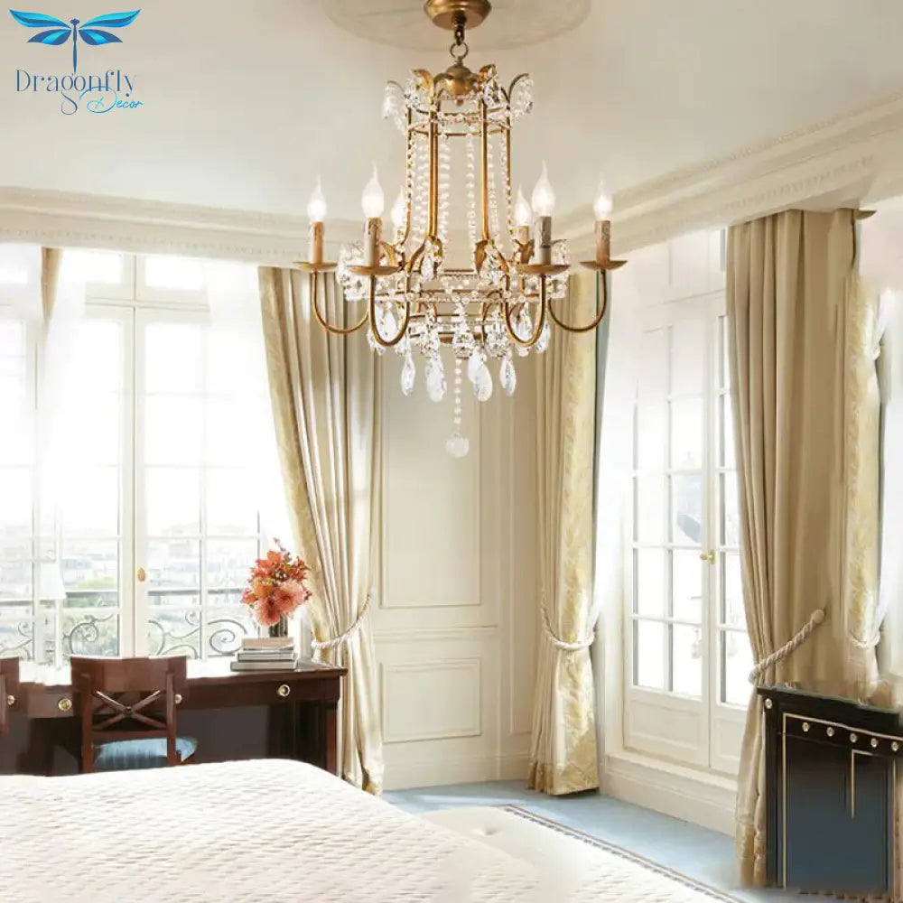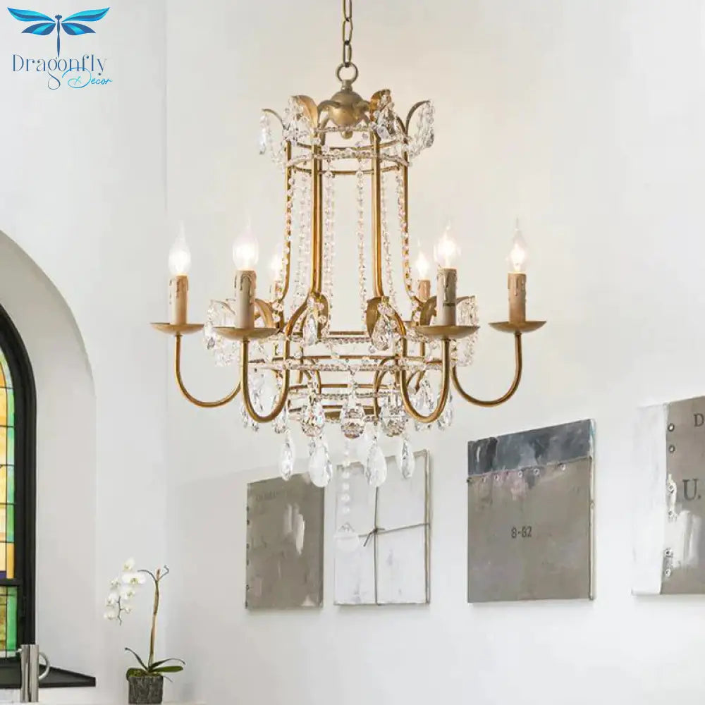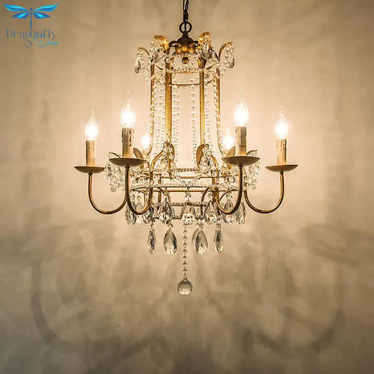 Curved Arm Metal Chandelier Lamp Traditionary 6 Heads Brass Hanging Pendant Light with Clear Crystal Drop