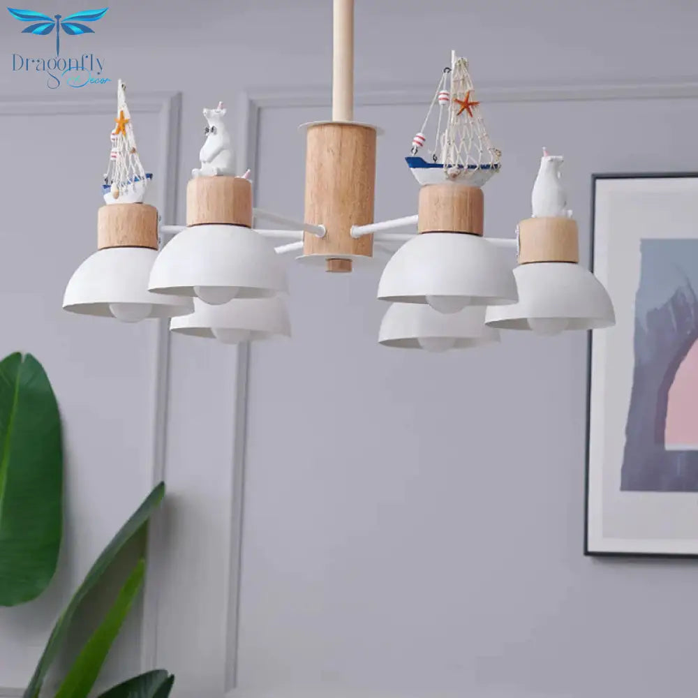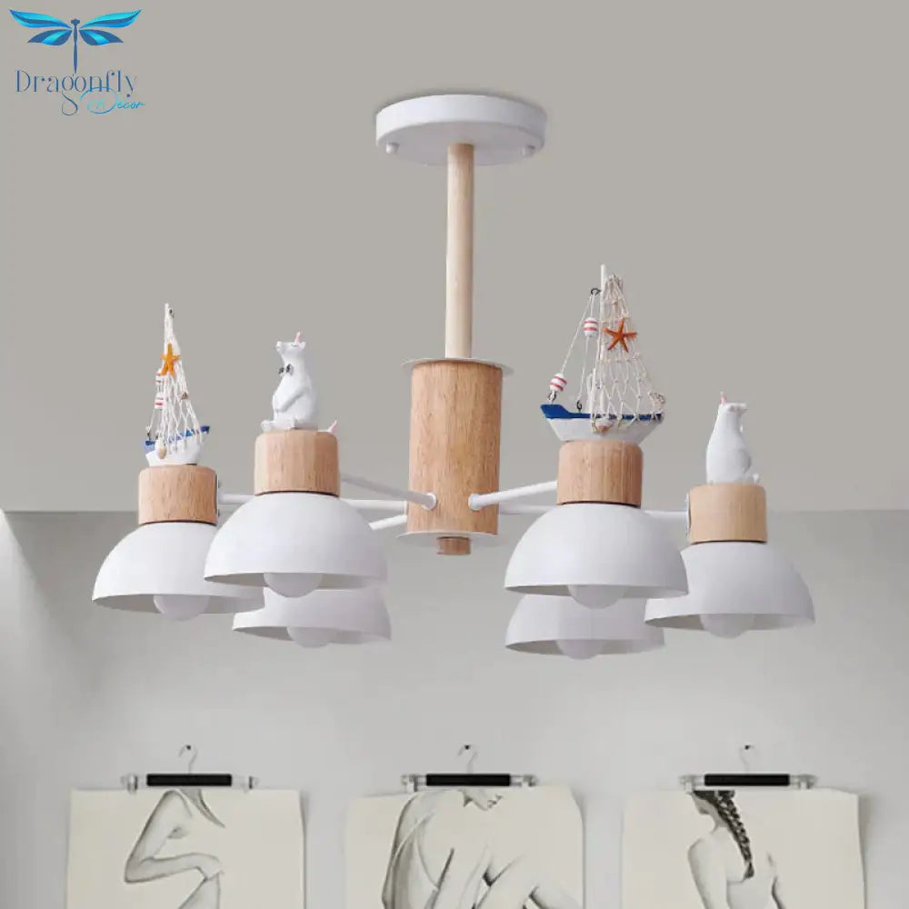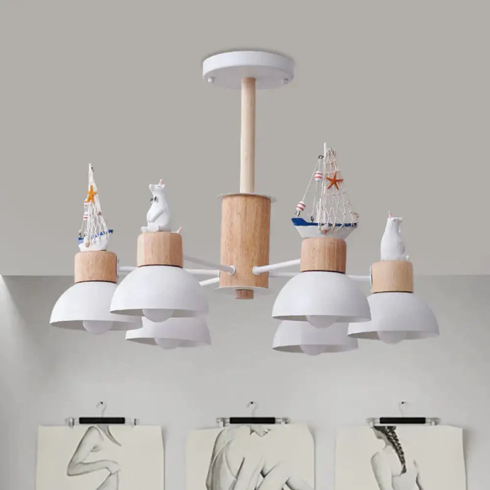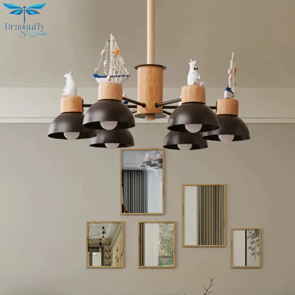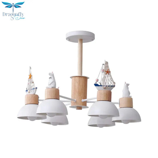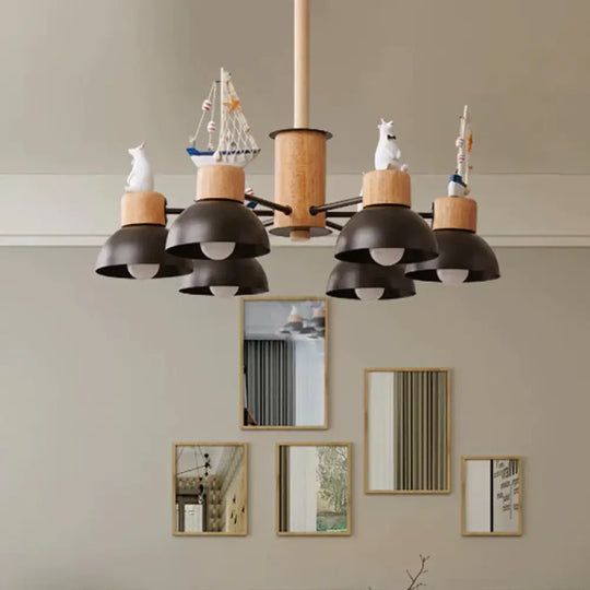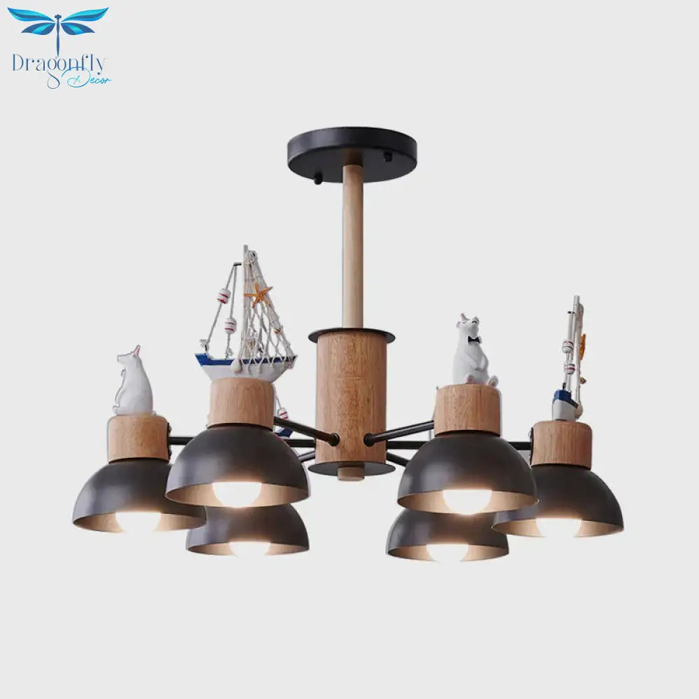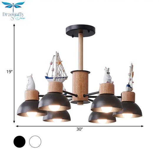Dome Metallic Chandelier Lighting Cartoon 6 Bulbs Black/White Hanging Ceiling Light with Bear and Ship Design