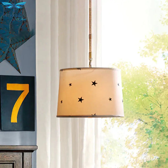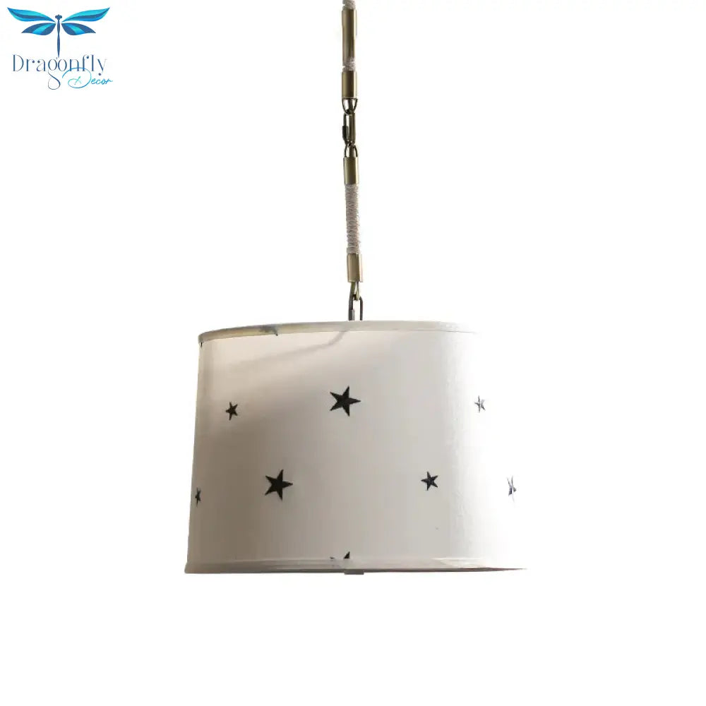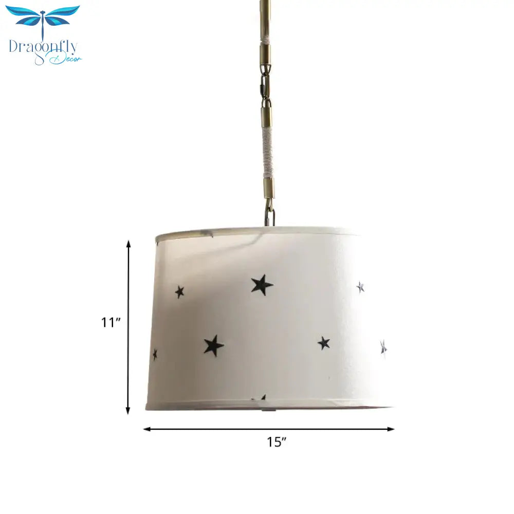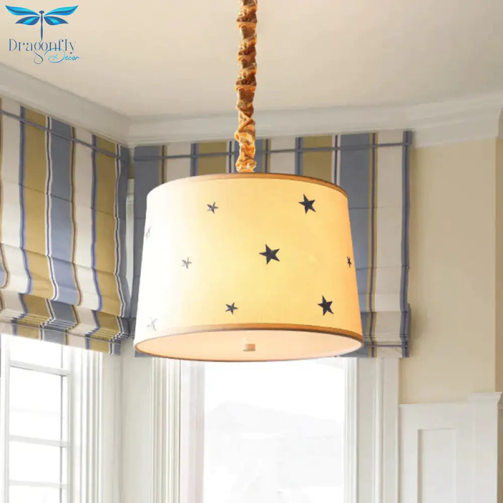 Drum Fabric Chandelier Light Fixture Kids 5 Bulbs Beige Suspension Lighting with Star Pattern for Bedroom