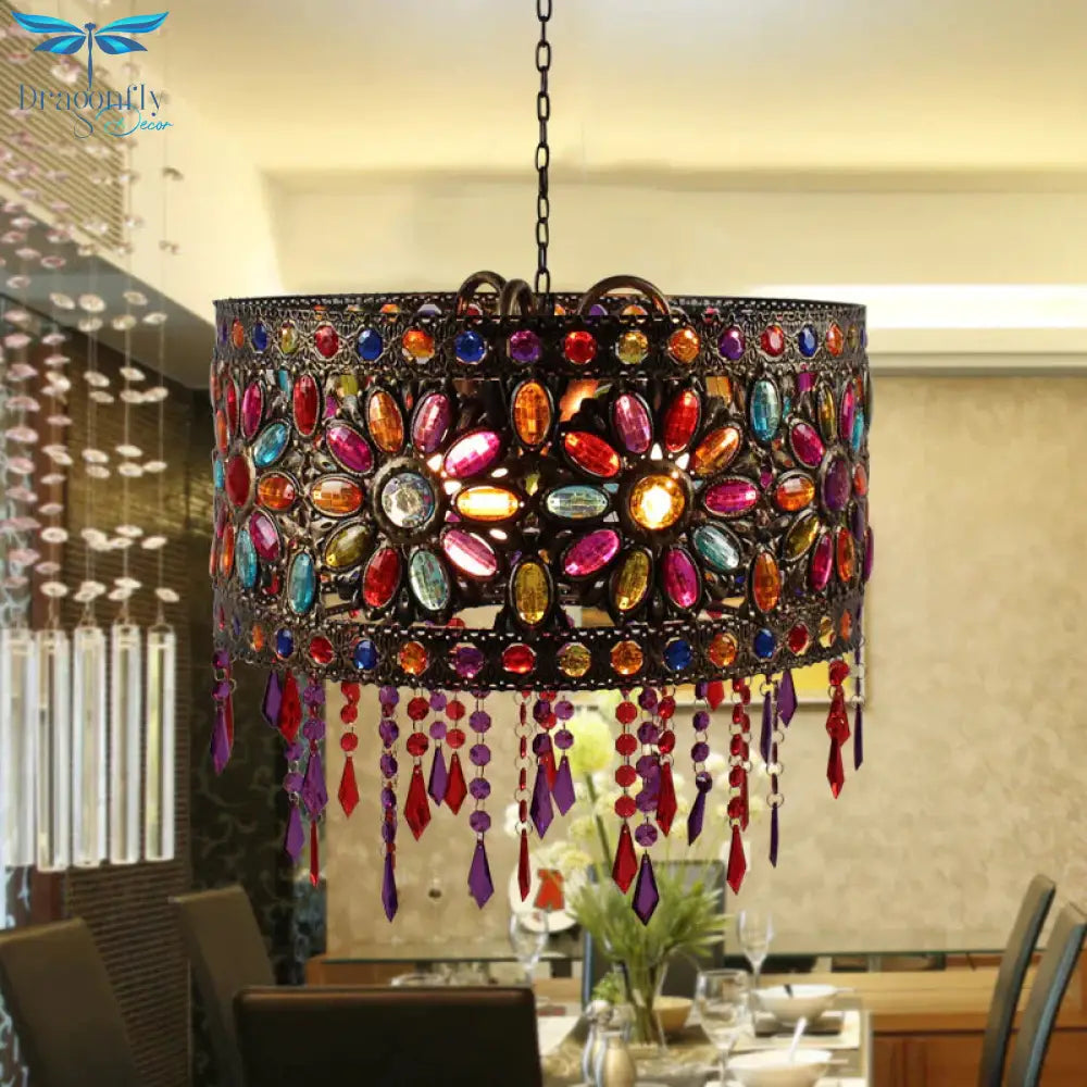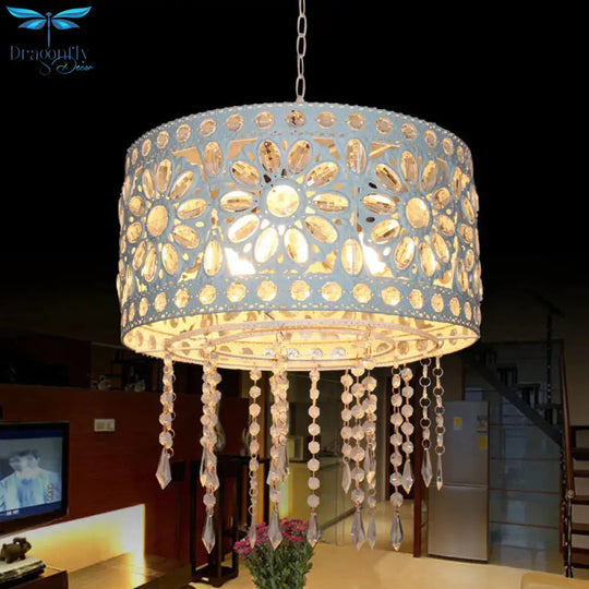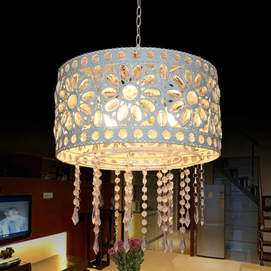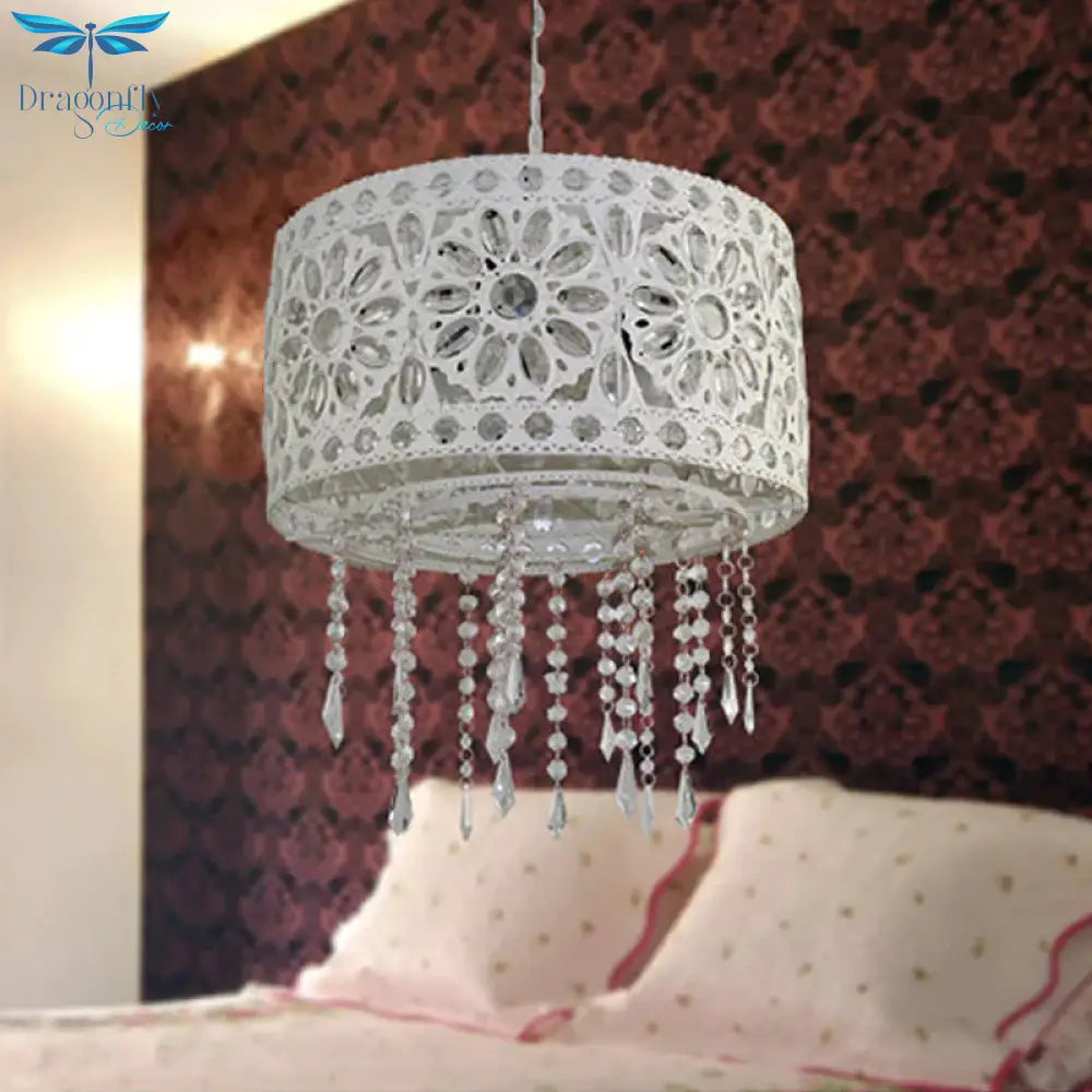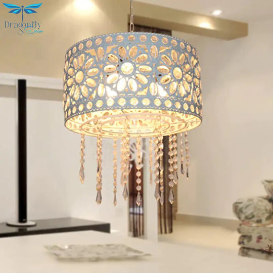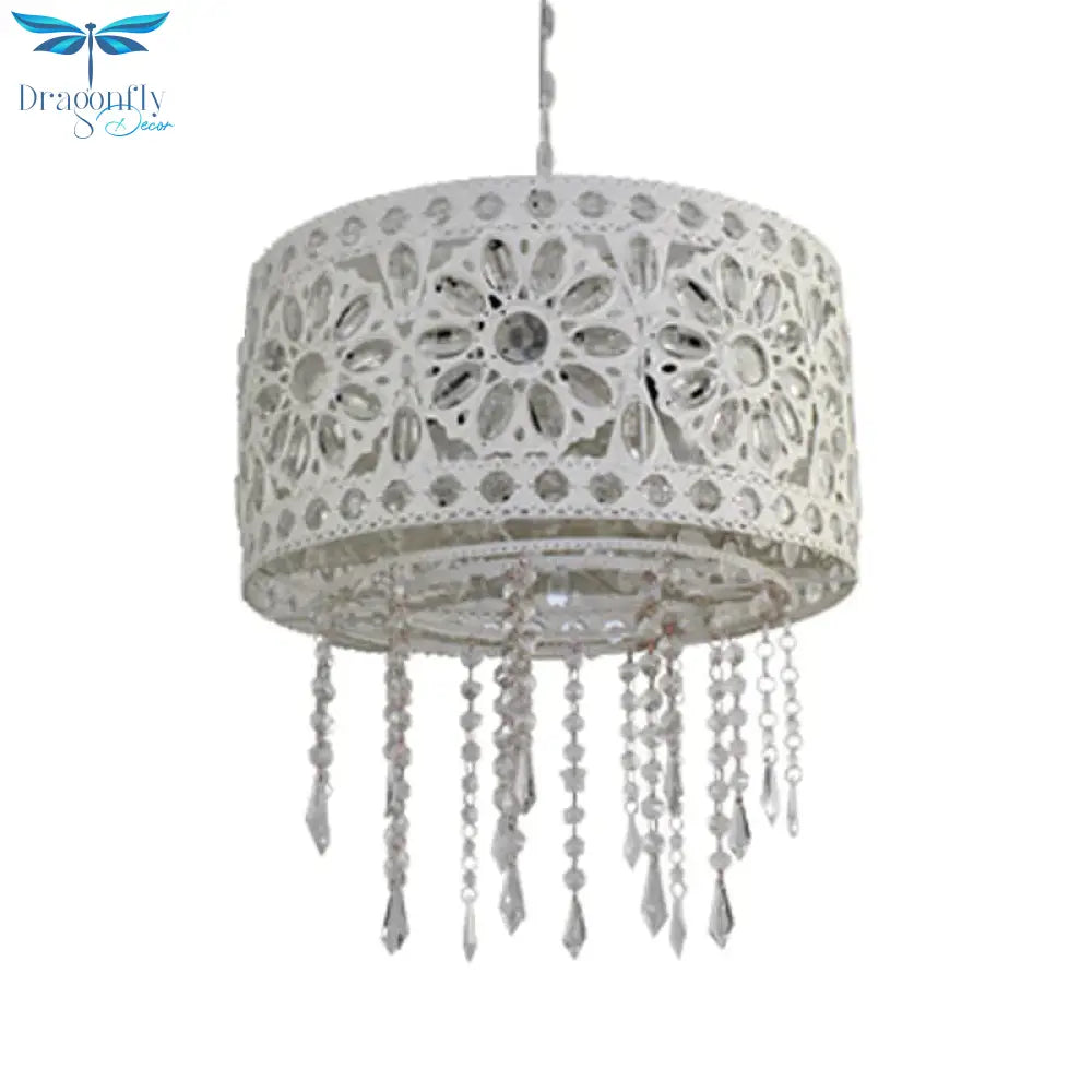 Drum Restaurant Chandelier Lighting Art Deco Metal 3 Bulbs White/Black Pendant Light Fixture with Crystal Accent