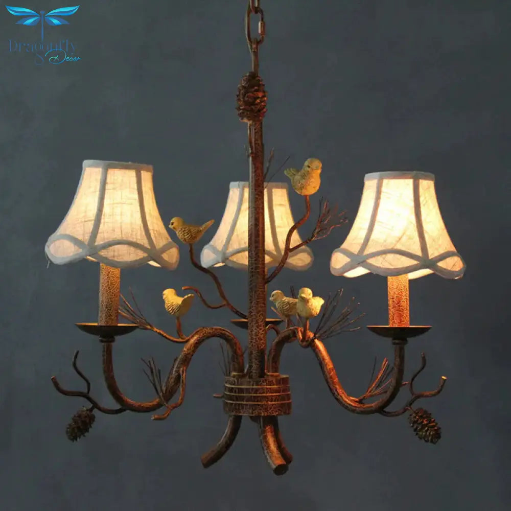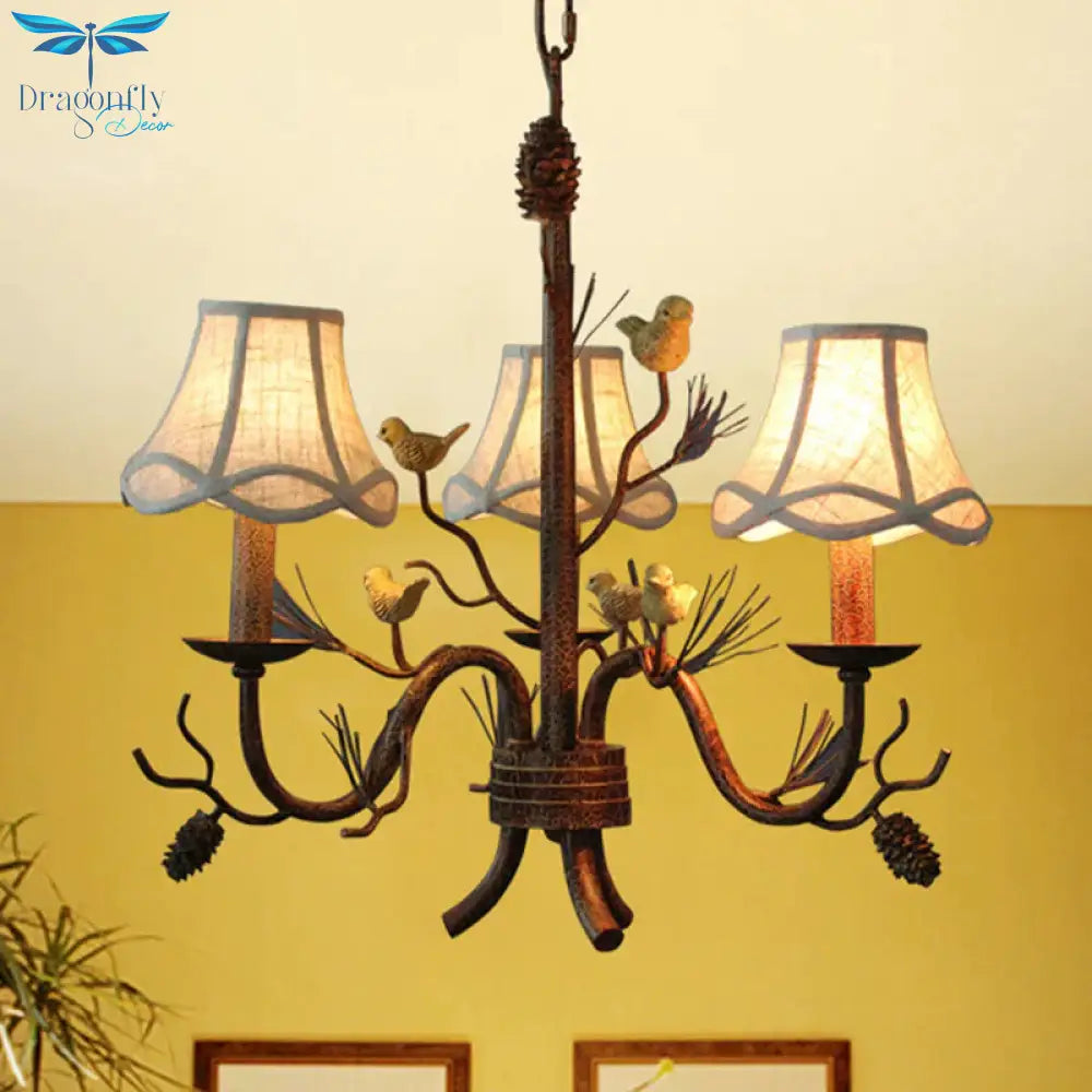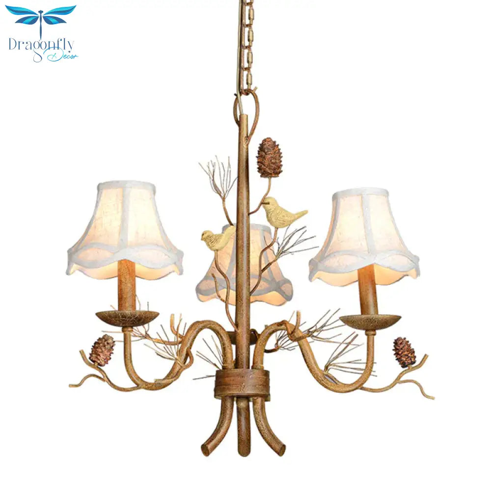 Flared Fabric Hanging Chandelier Rural 3-Light Dining Room Pendant with Bird and Pinecone Decoration in Brown