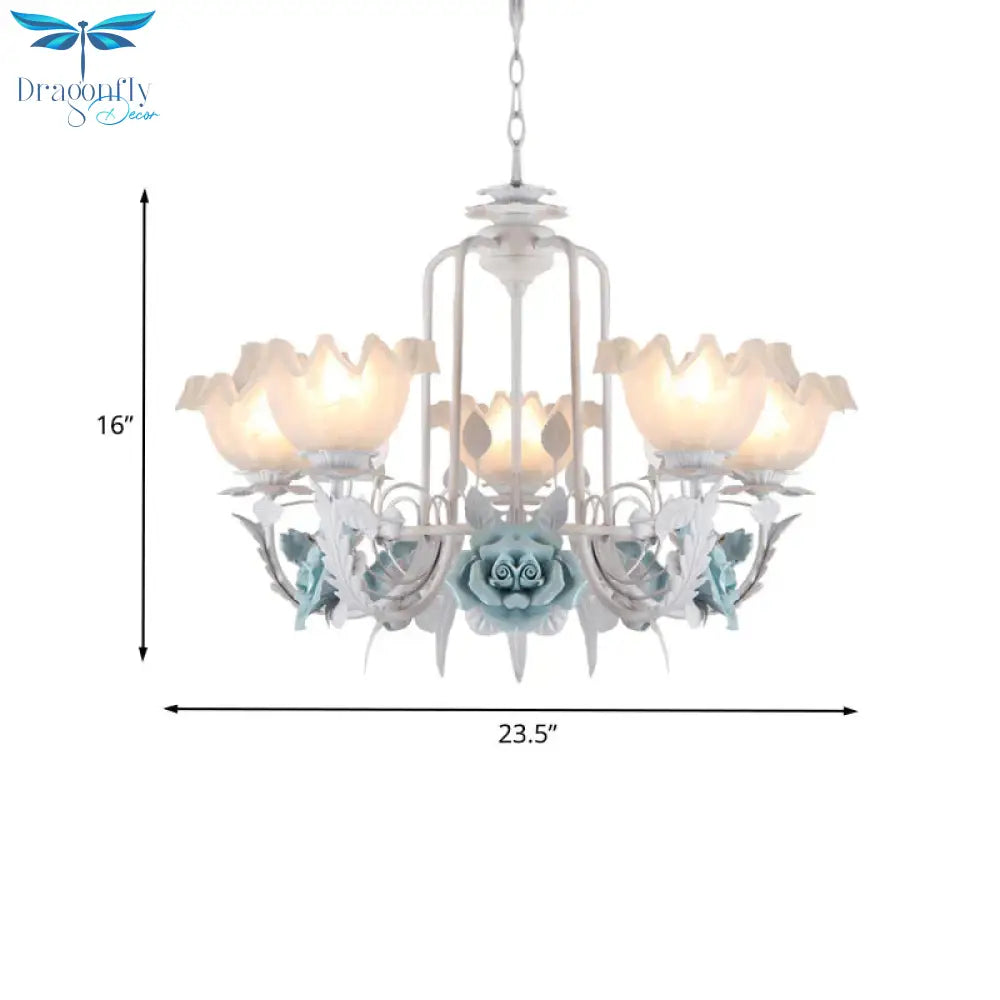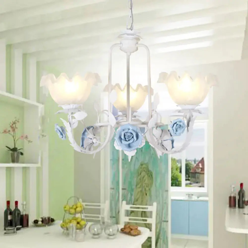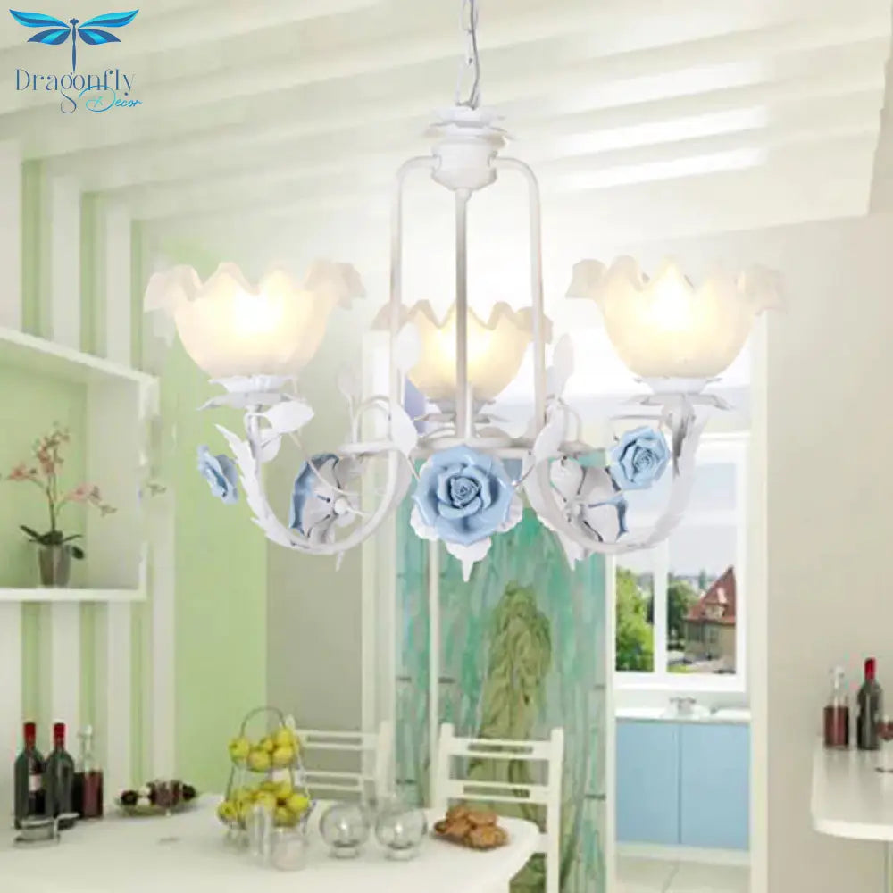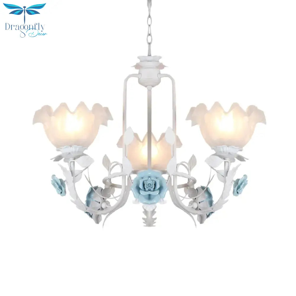Floral White Glass Pendant Chandelier Pastoral Style 3/5 Bulbs Living Room LED Drop Lamp in Blue