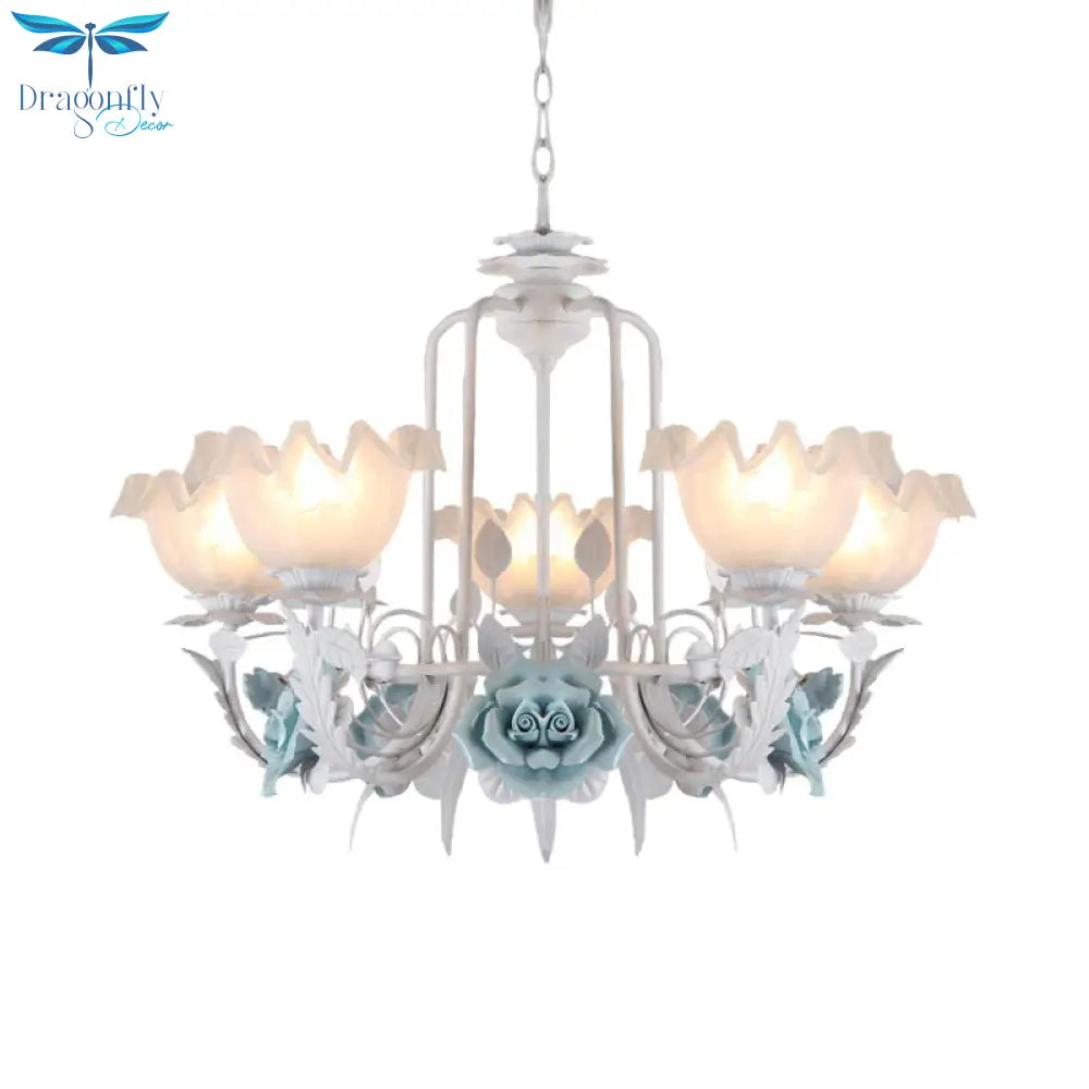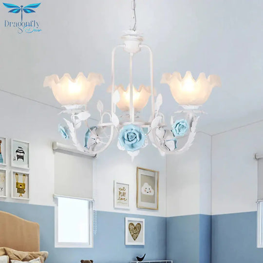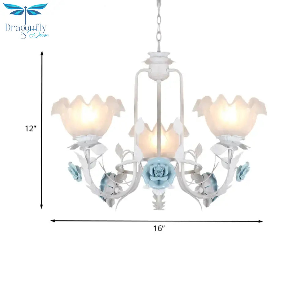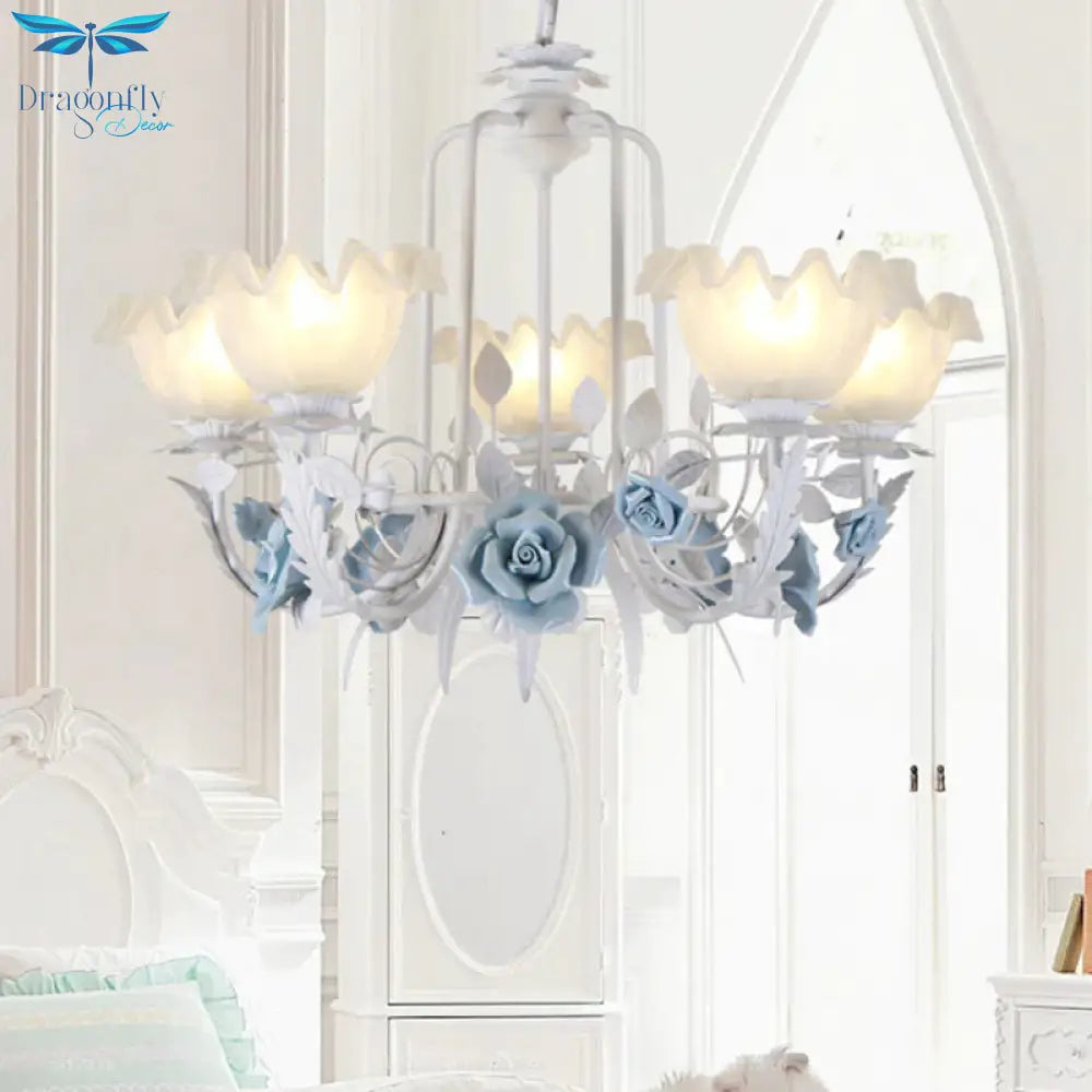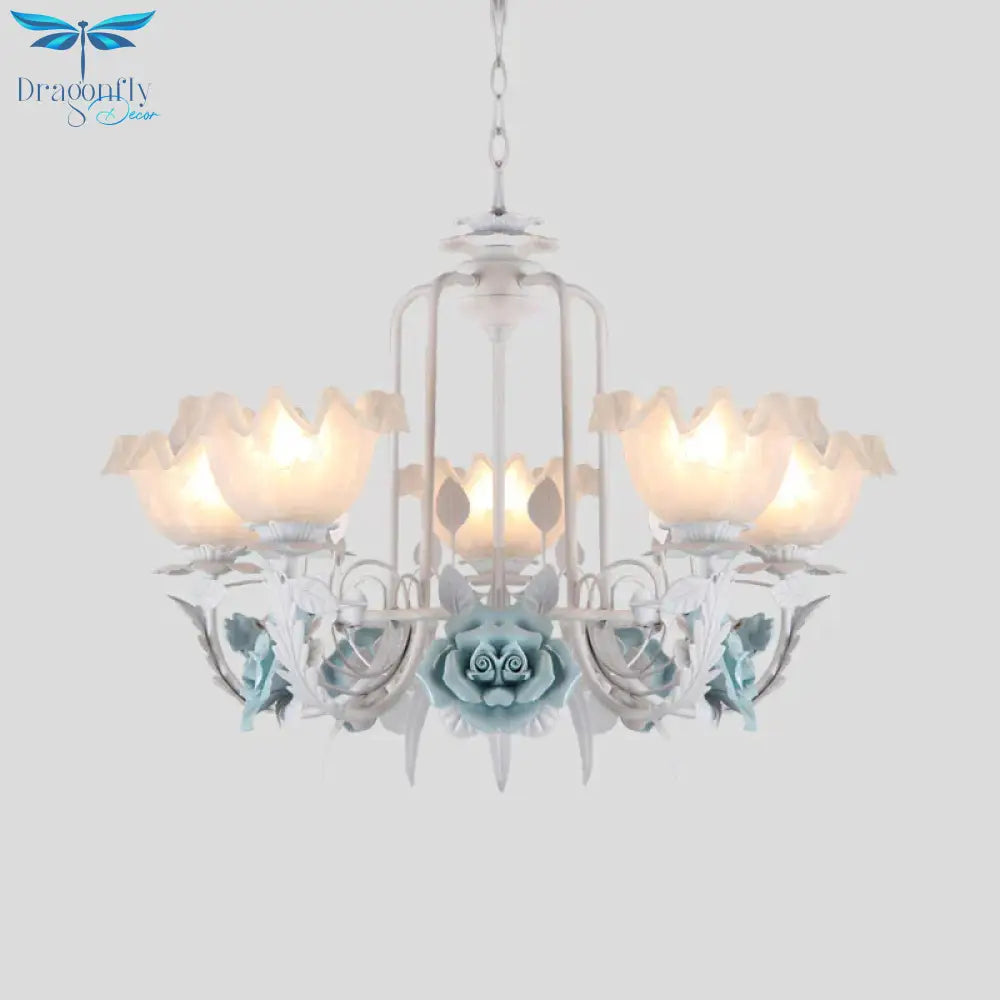 Floral White Glass Pendant Chandelier Pastoral Style 3/5 Bulbs Living Room LED Drop Lamp in Blue