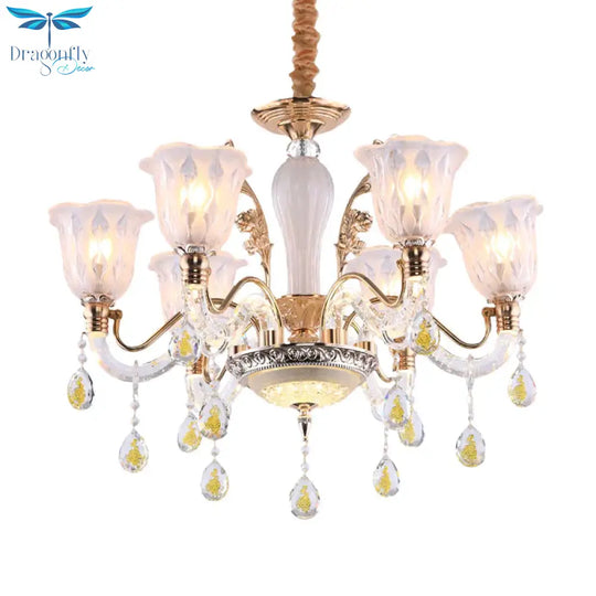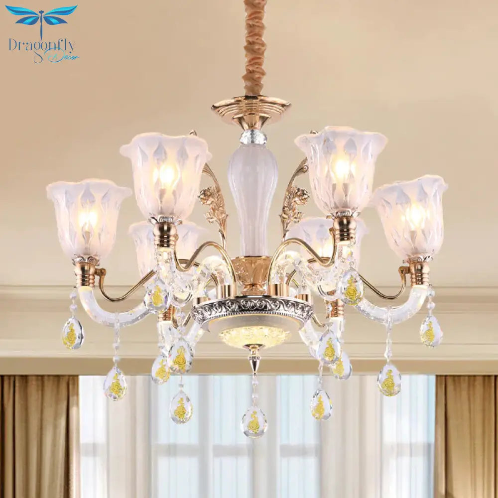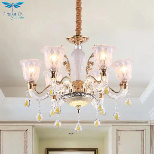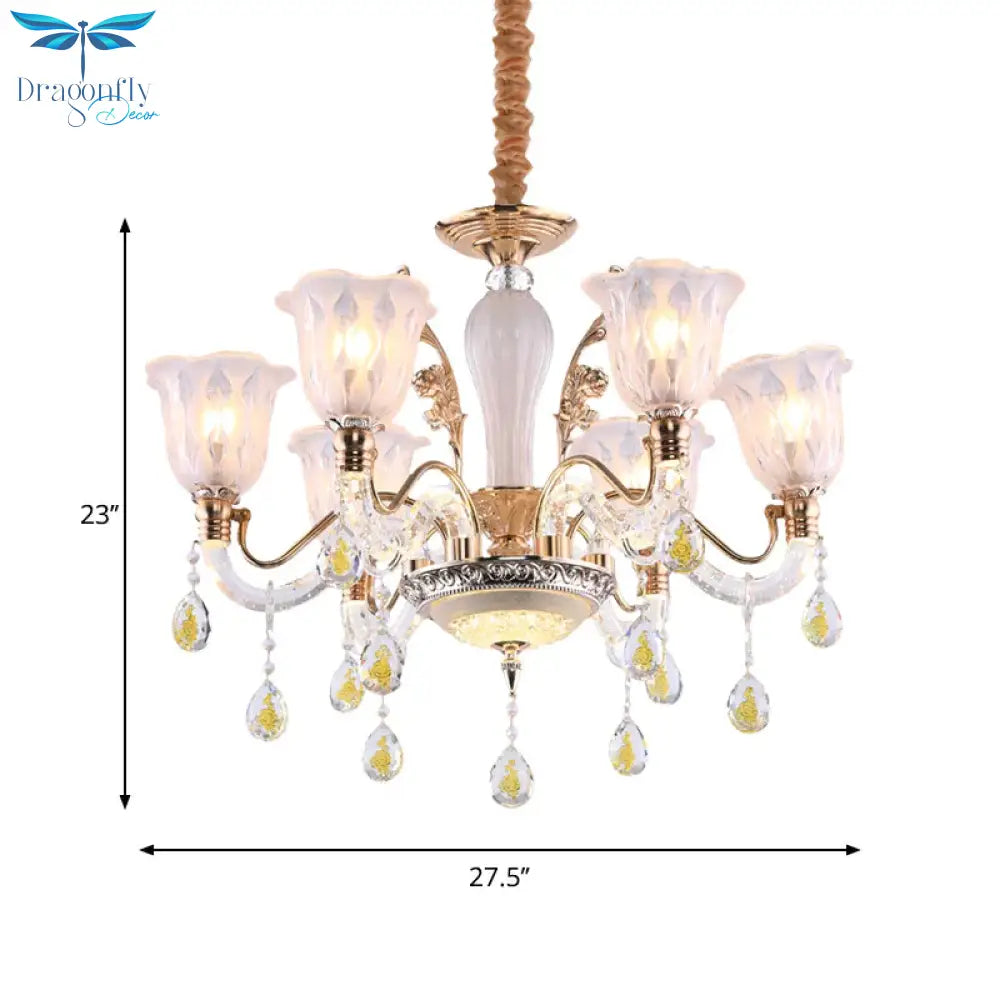 Flower Crystal Water Drops Hanging Light Kit Traditional 6 Bulbs Dinning Room Chandelier in Gold