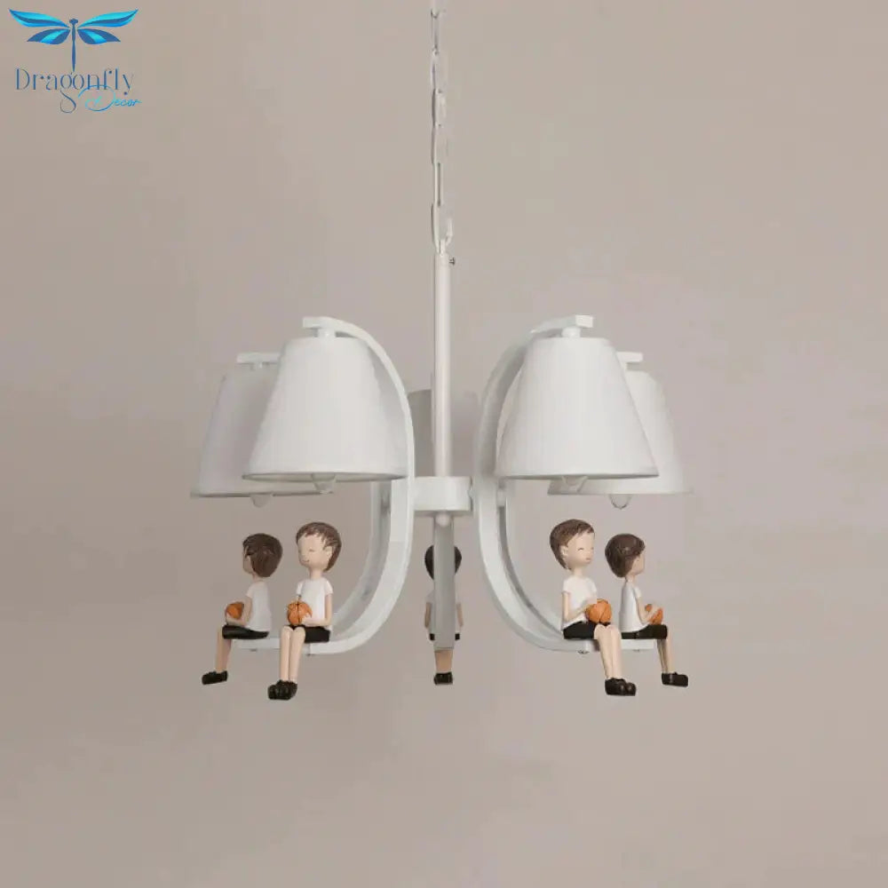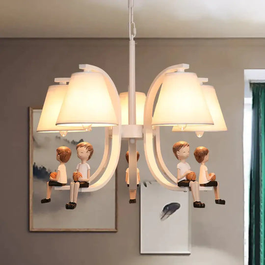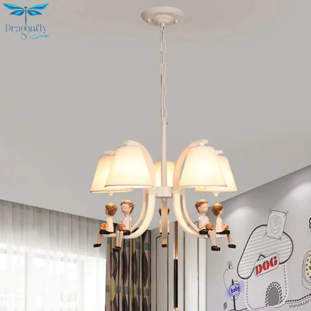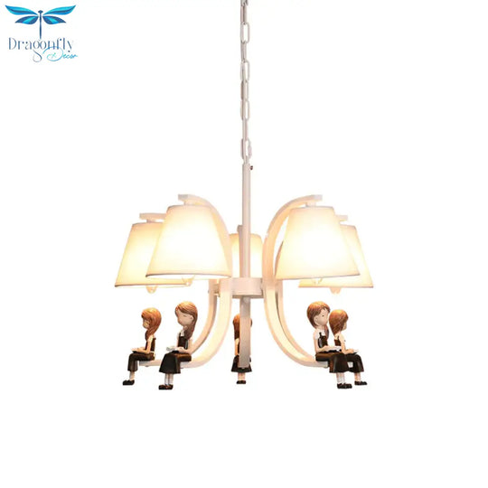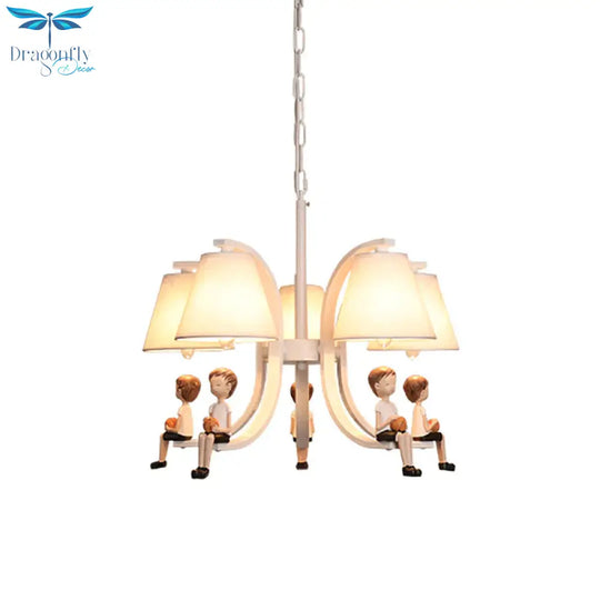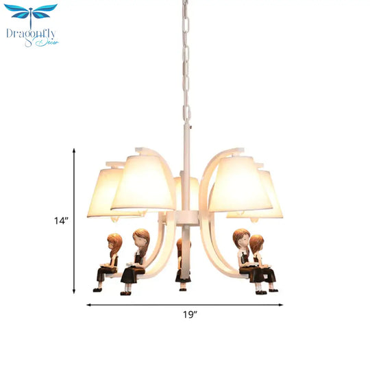 Girl/Boy Statue Suspension Light Kids Iron 5-Bulb Bedroom Pendant Chandelier with Cone Fabric Lampshade in White