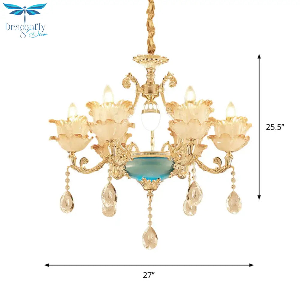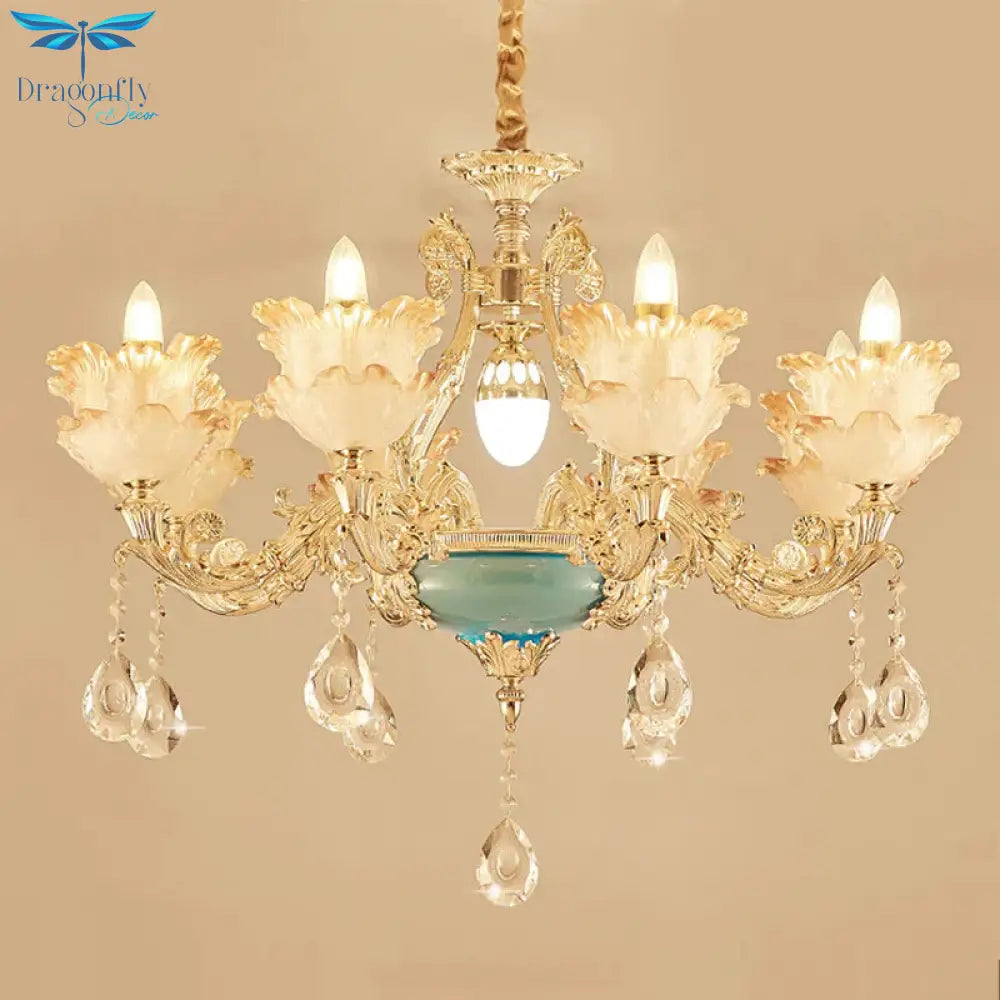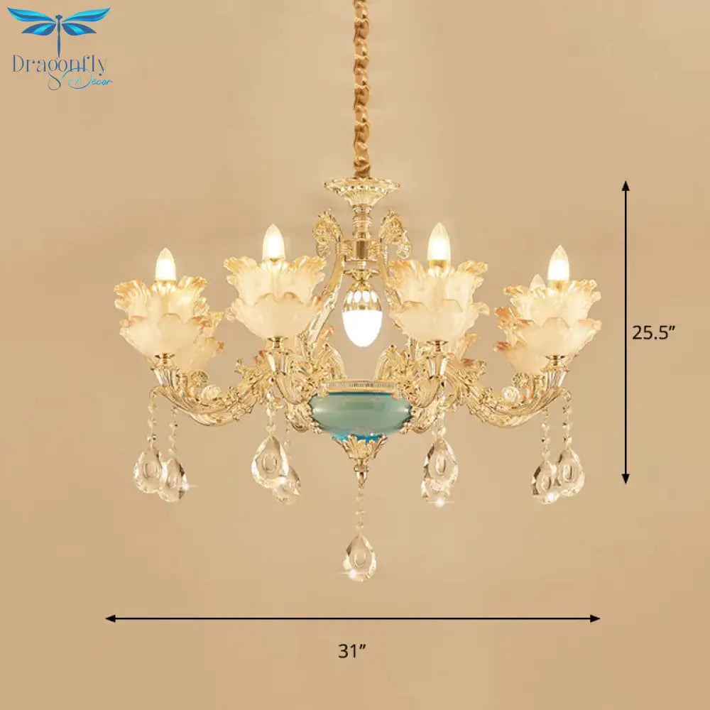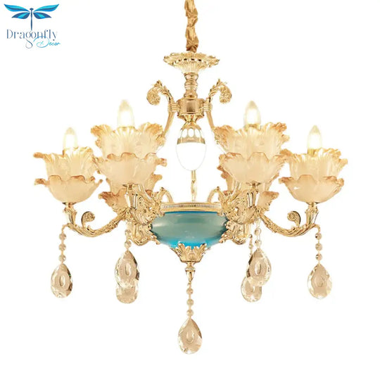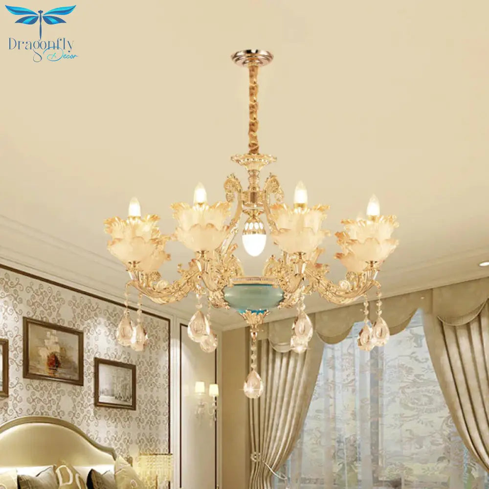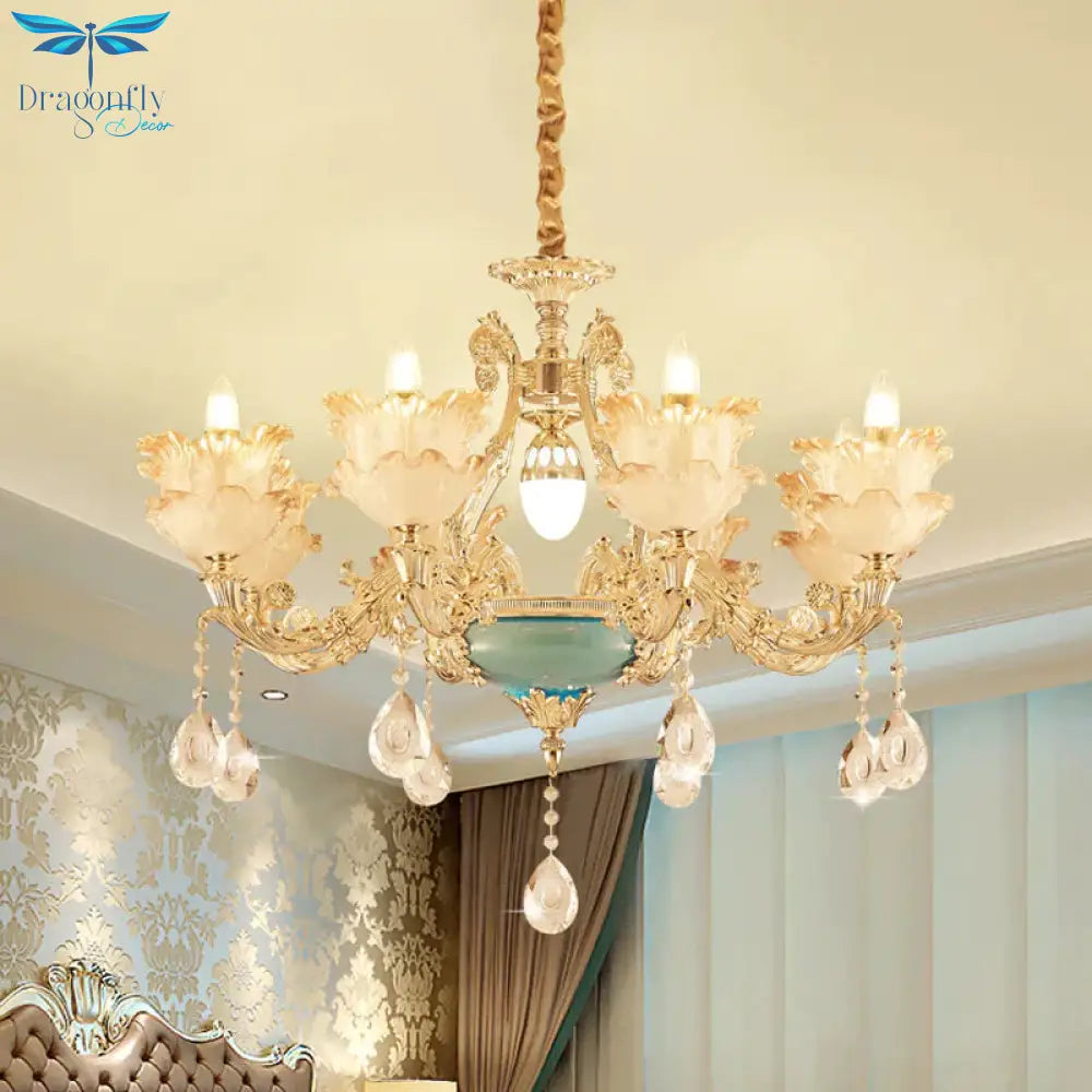Gold Floral Chandelier Lighting Mid Century Frosted Glass 6/8 Heads Bedroom Pendant with Crystal Drop