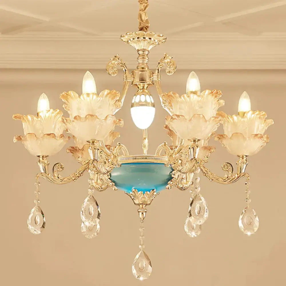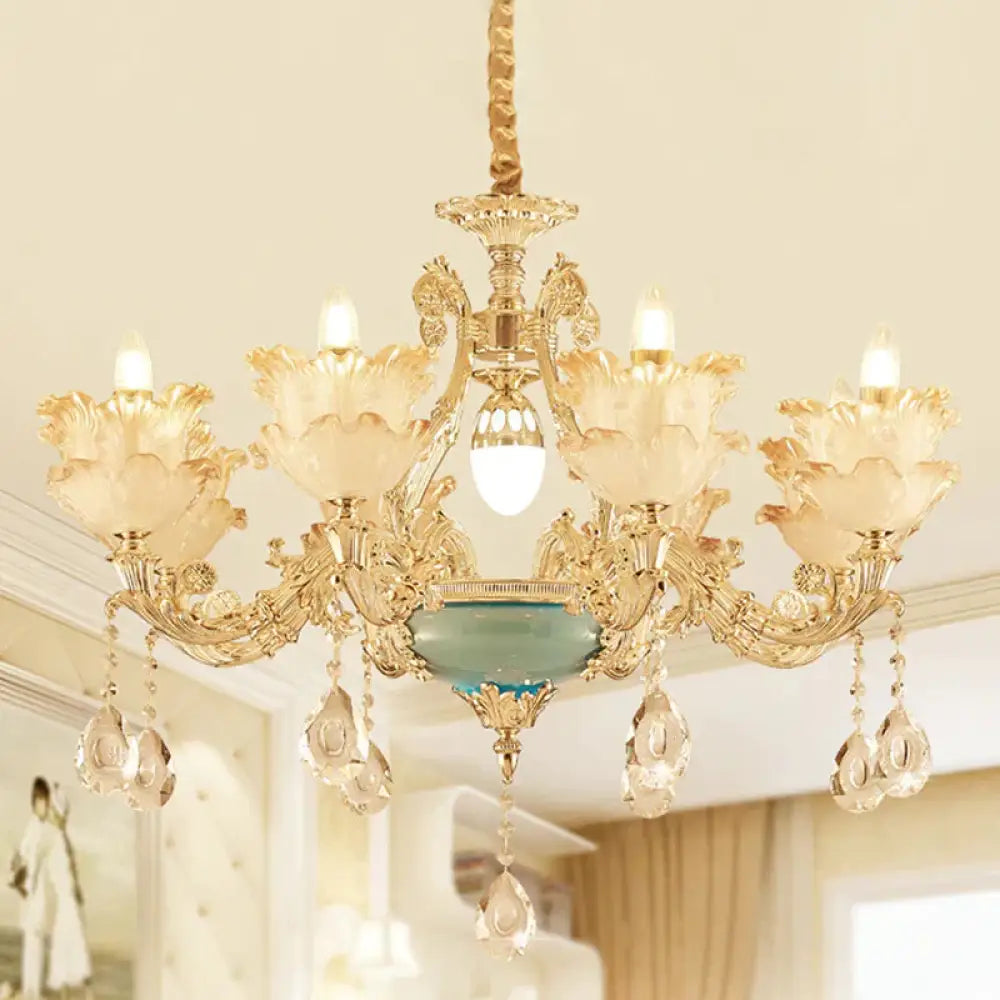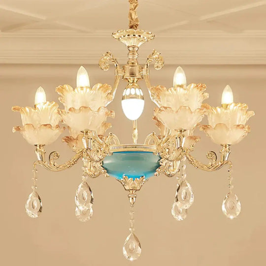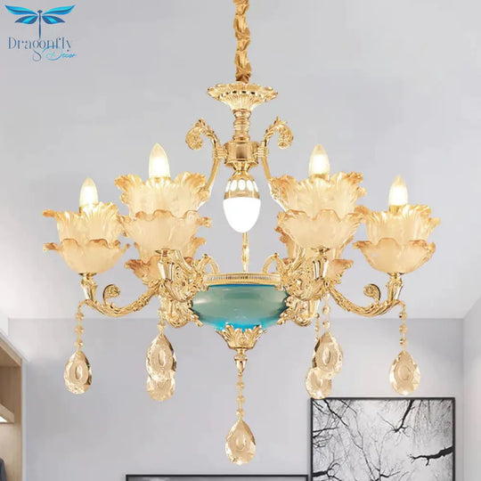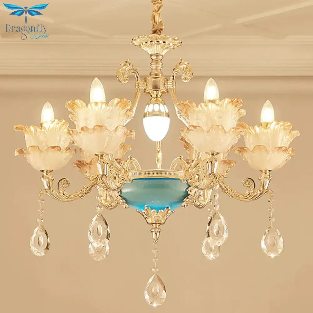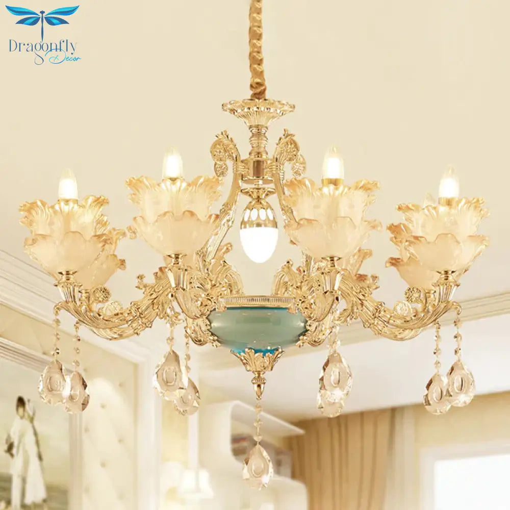 Gold Floral Chandelier Lighting Mid Century Frosted Glass 6/8 Heads Bedroom Pendant with Crystal Drop