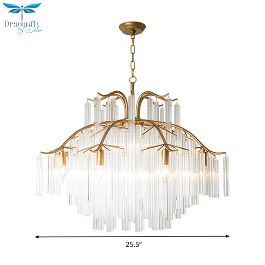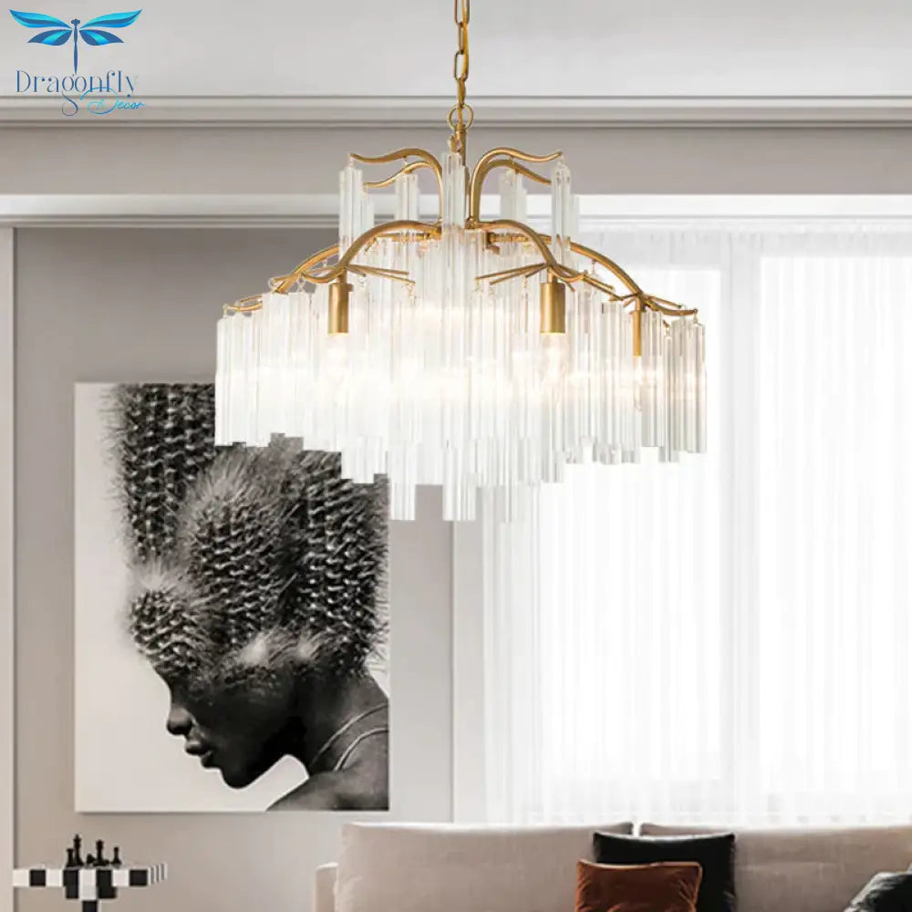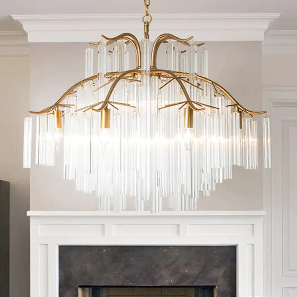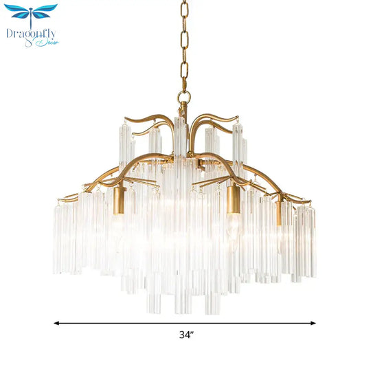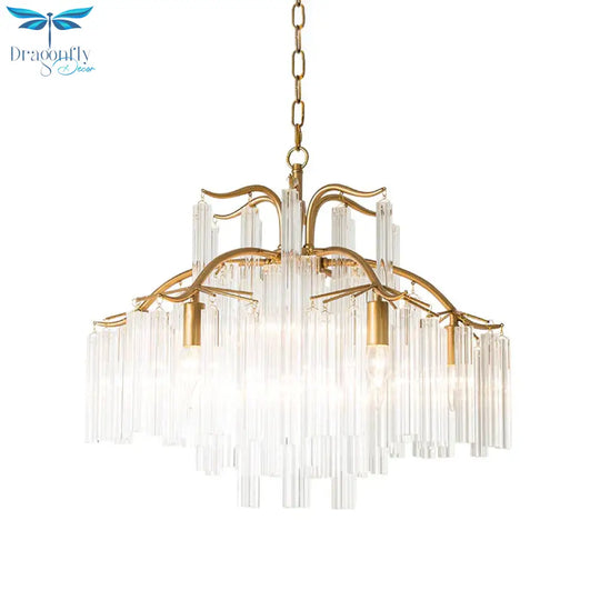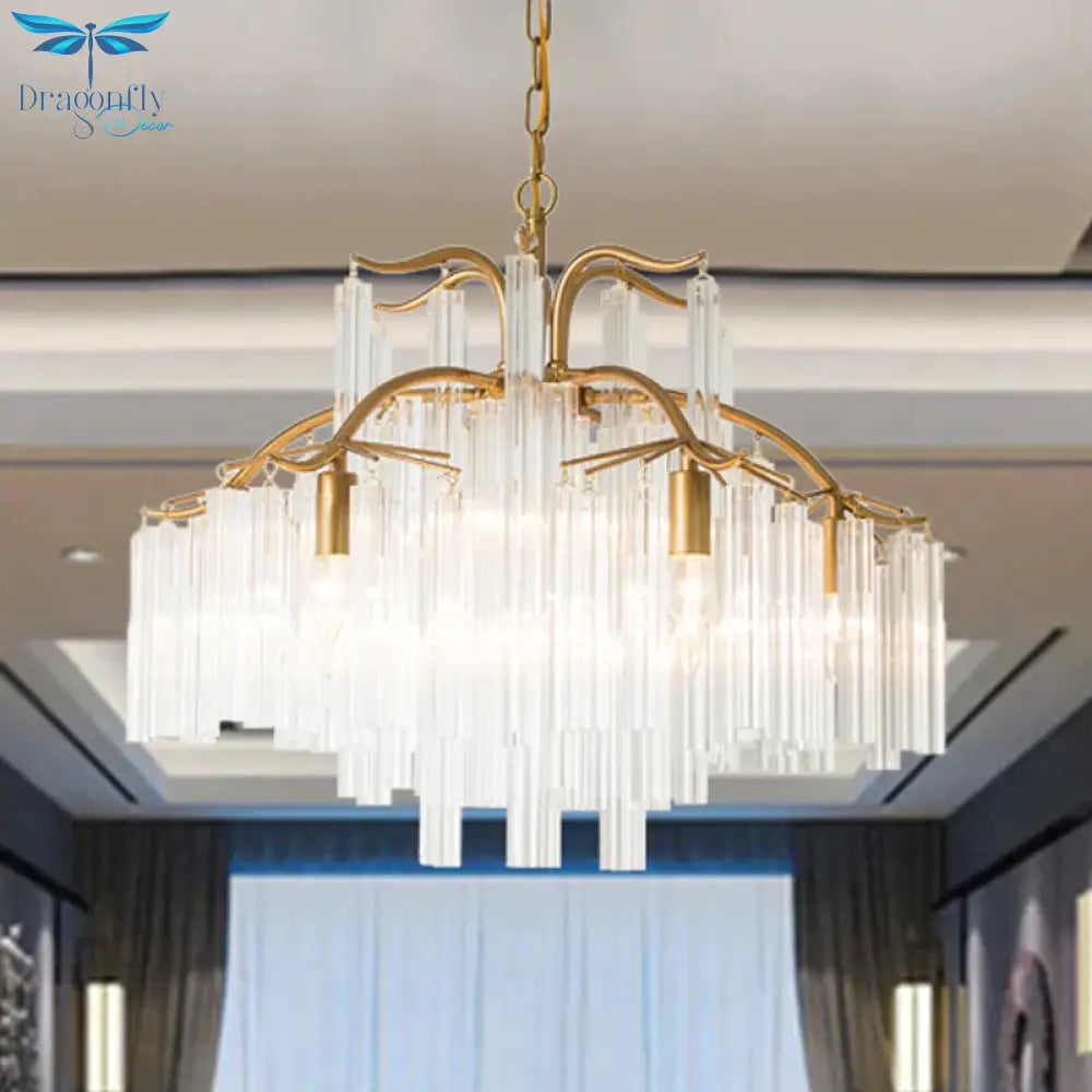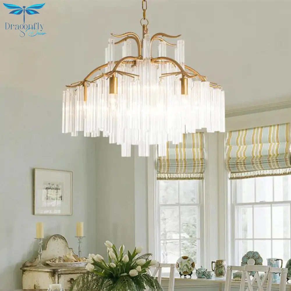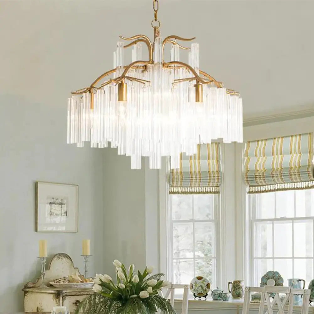 Gold Tube Chandelier Lamp Countryside Crystal 7/9 Lights Living Room H
