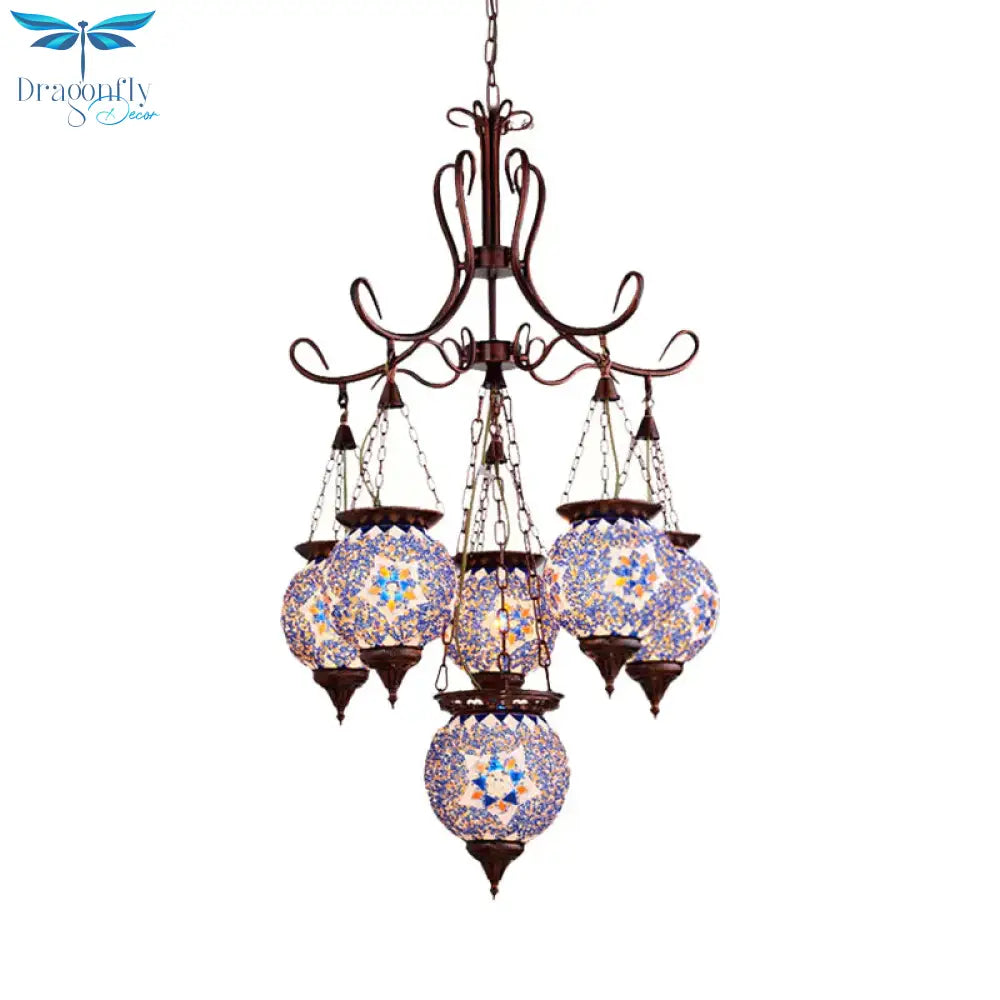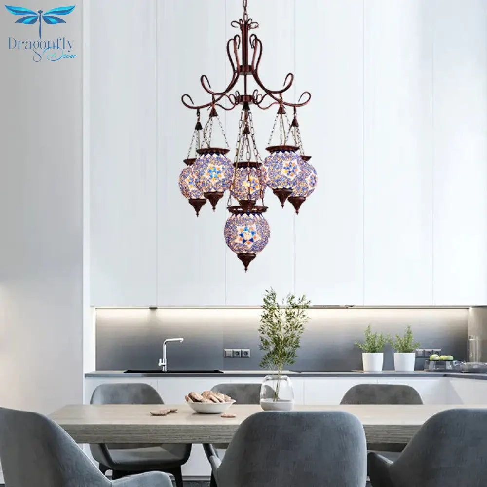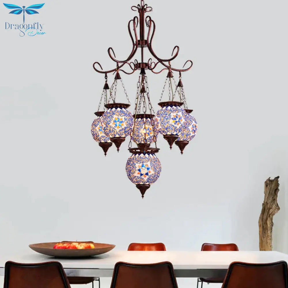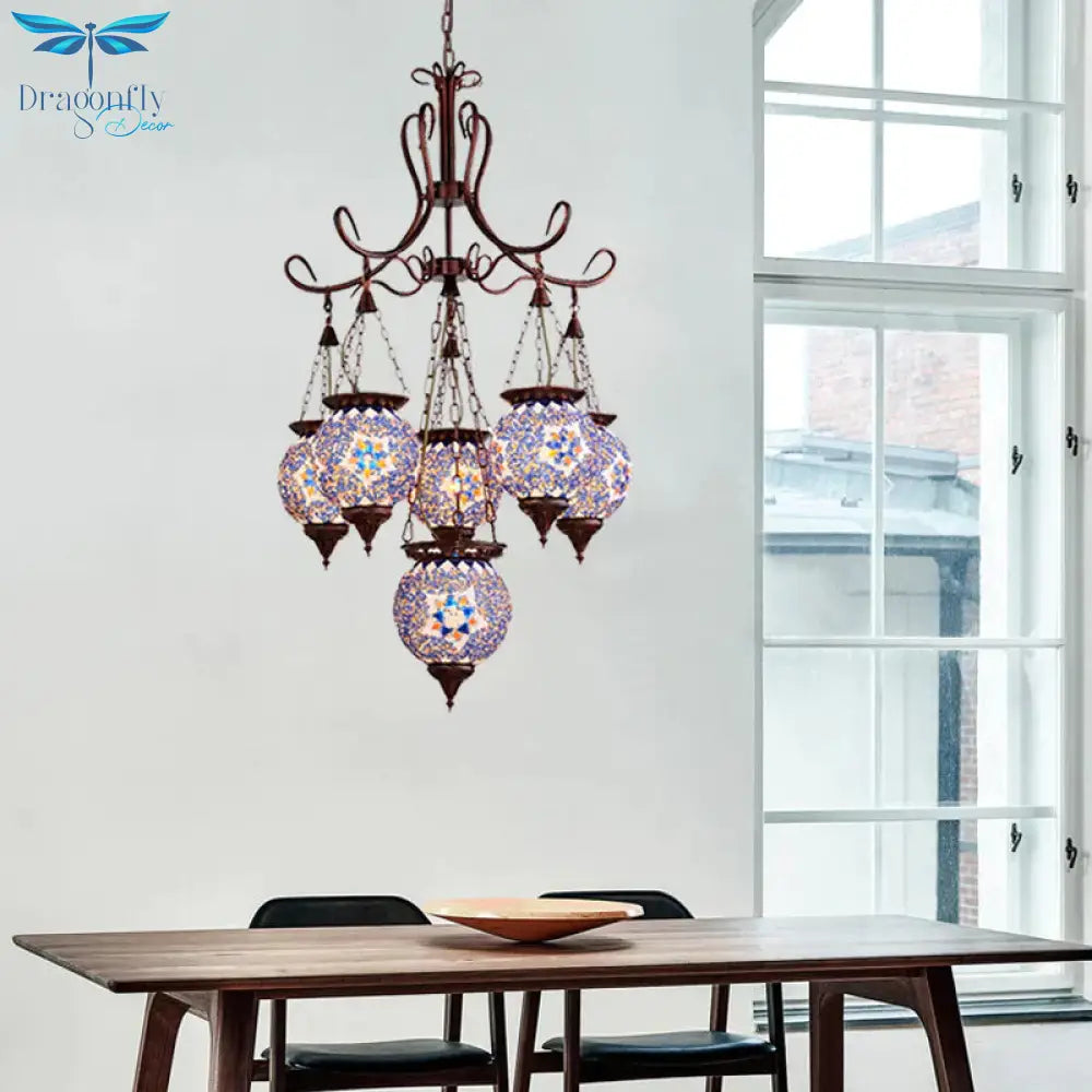 Hand Cut Glass Copper Chandelier Global 6-Light Turkish Pendant Ceiling Light for Dining Room