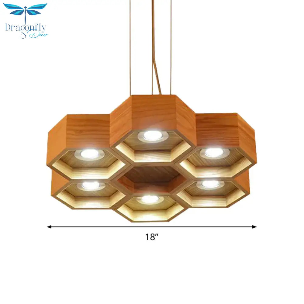 Honeycomb Wood Chandelier Light Contemporary 6 Heads Beige Hanging Pendant Light