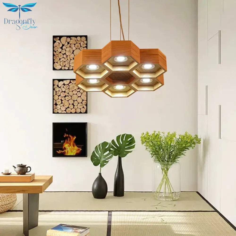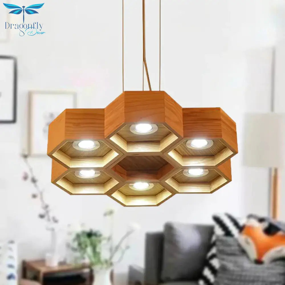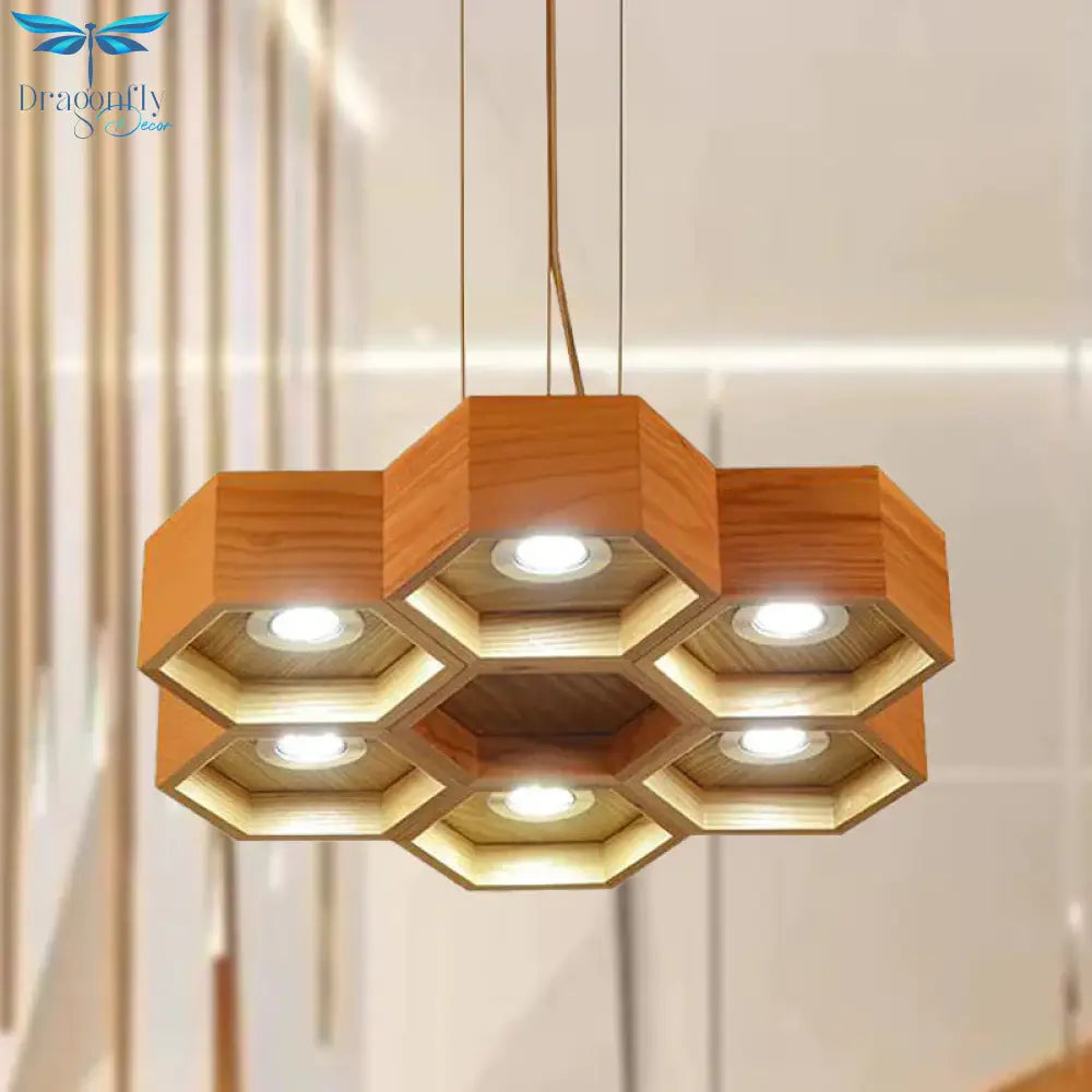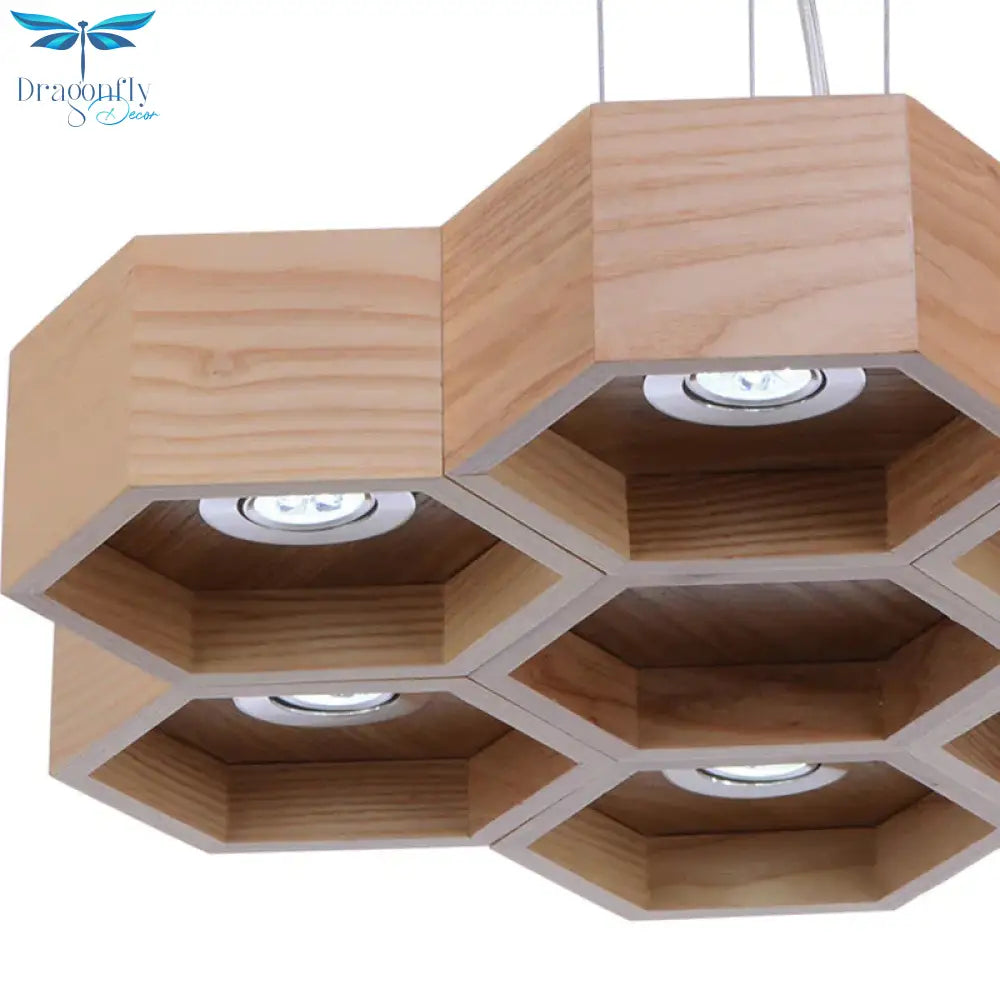 Honeycomb Wood Chandelier Light Contemporary 6 Heads Beige Hanging Pen