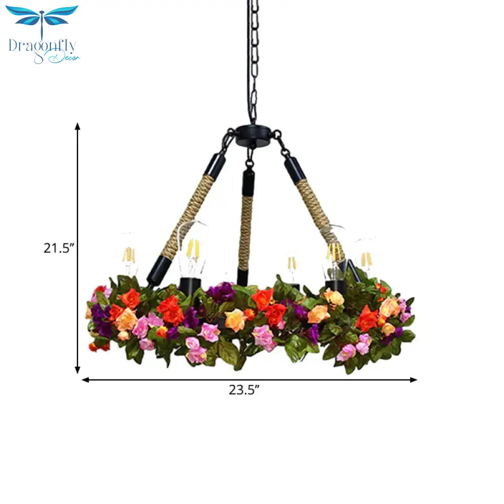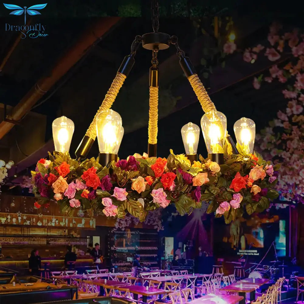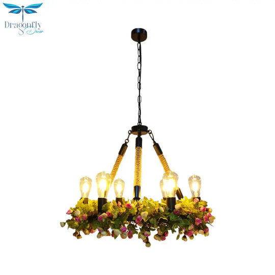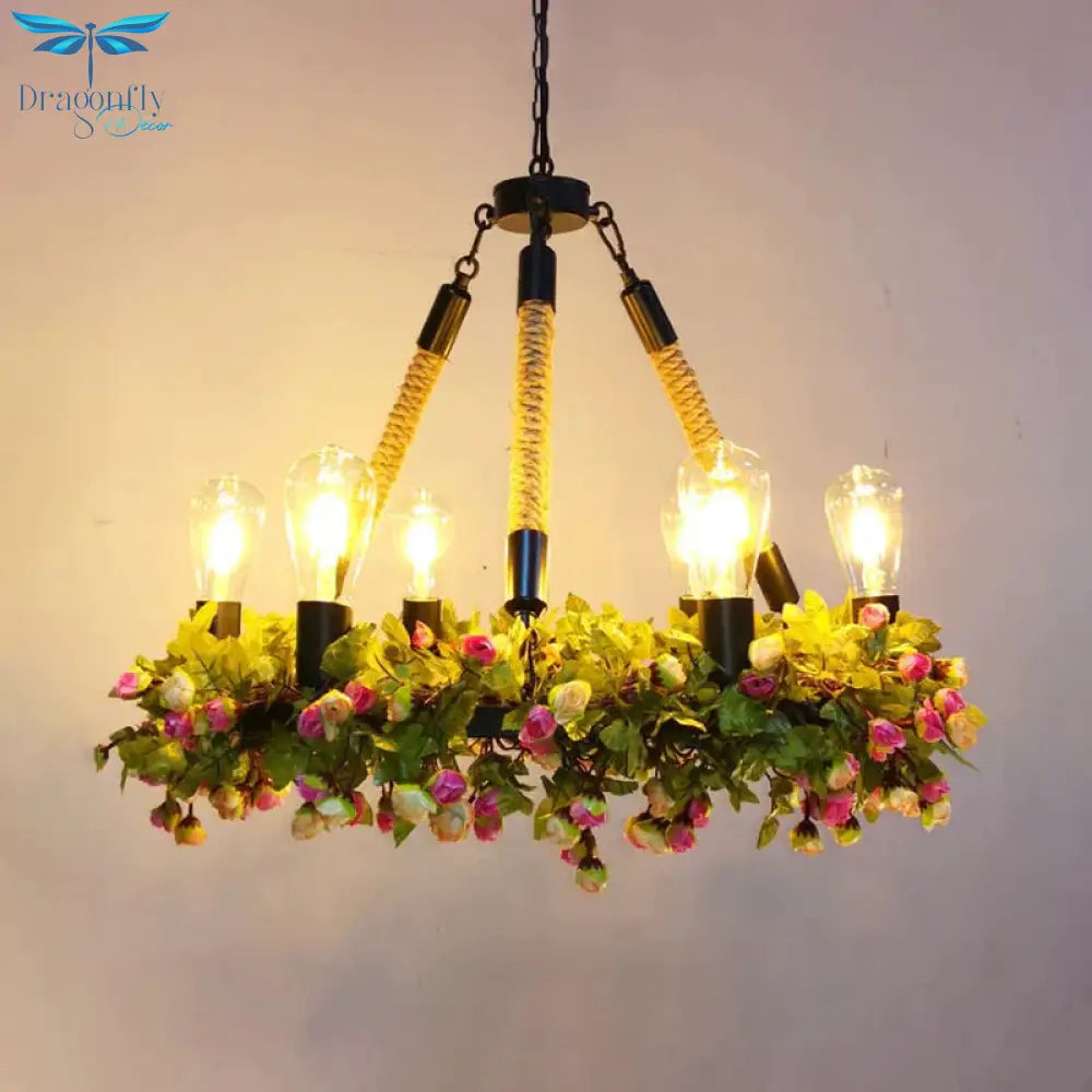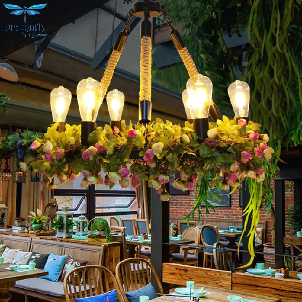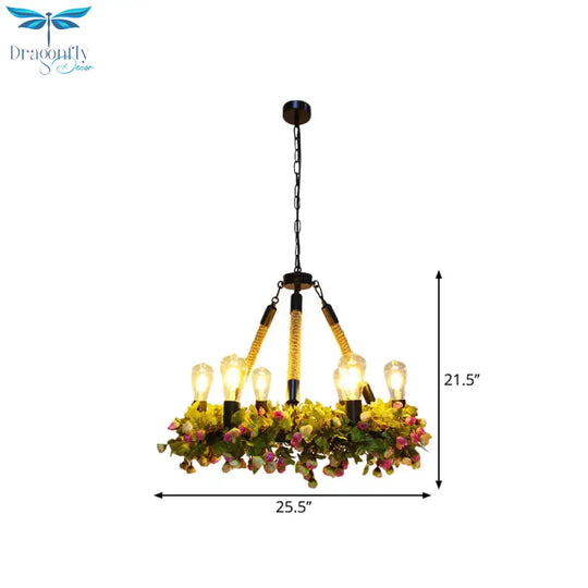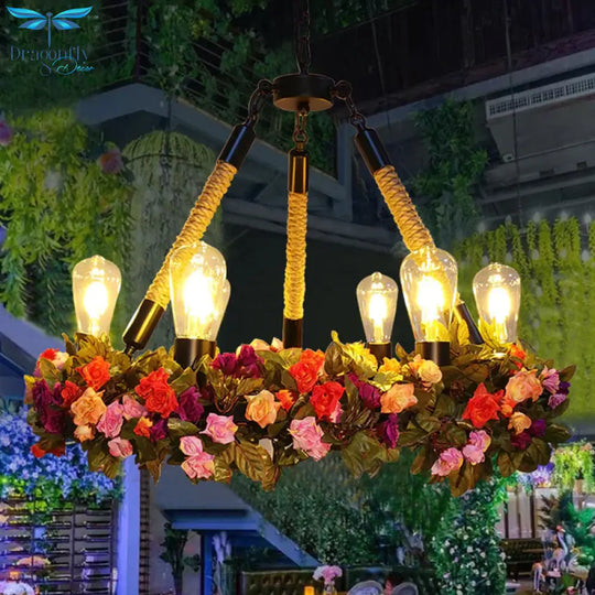 Metal Exposed Bulb Pendant Chandelier Industrial 6-Light Restaurant Pendulum Light with Pink/Green Artificial Floral Deco