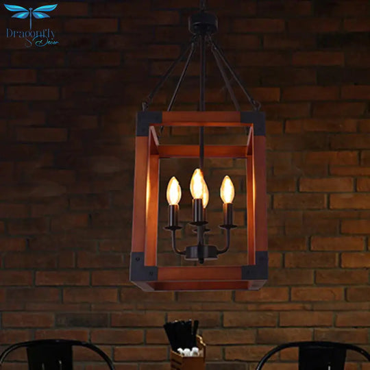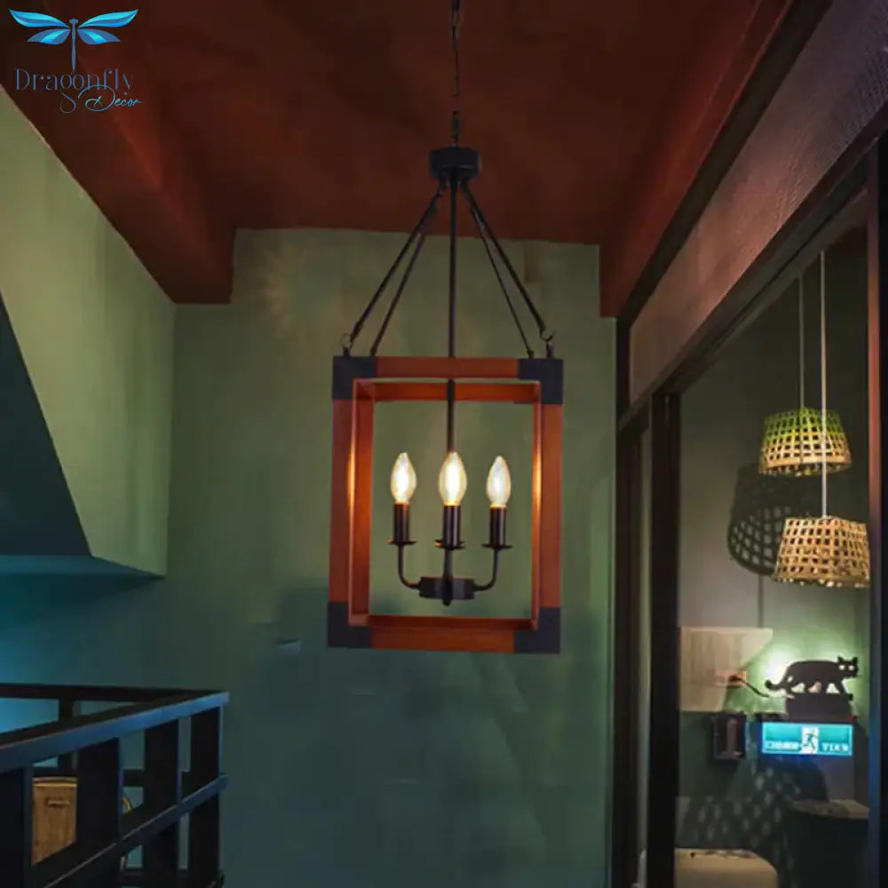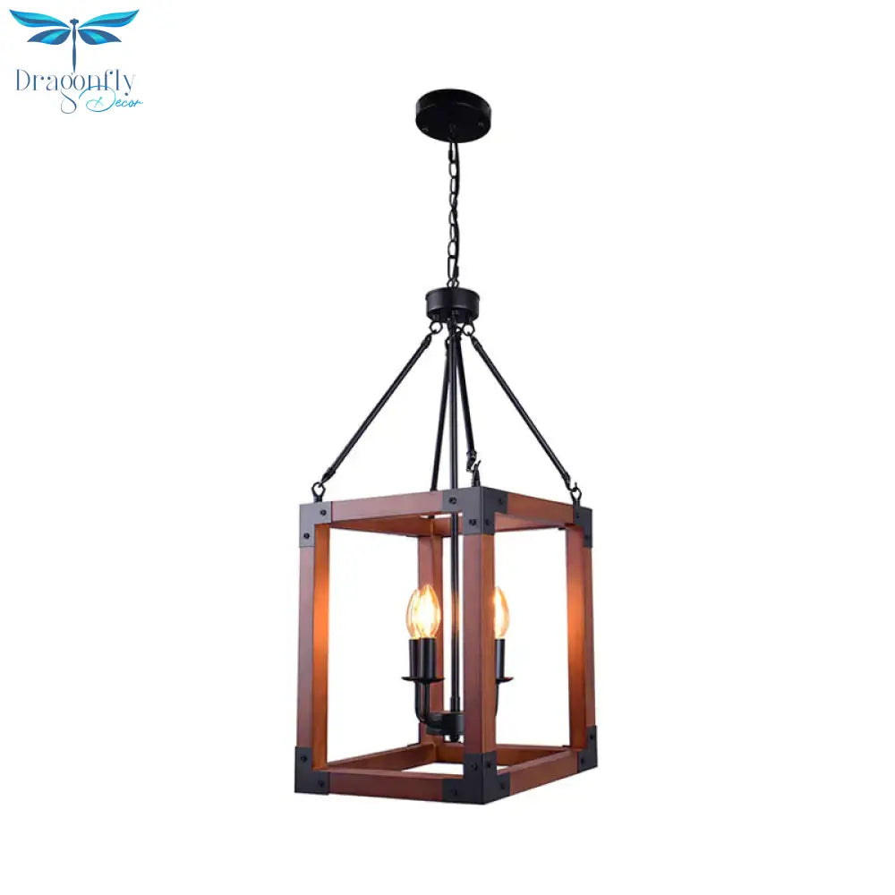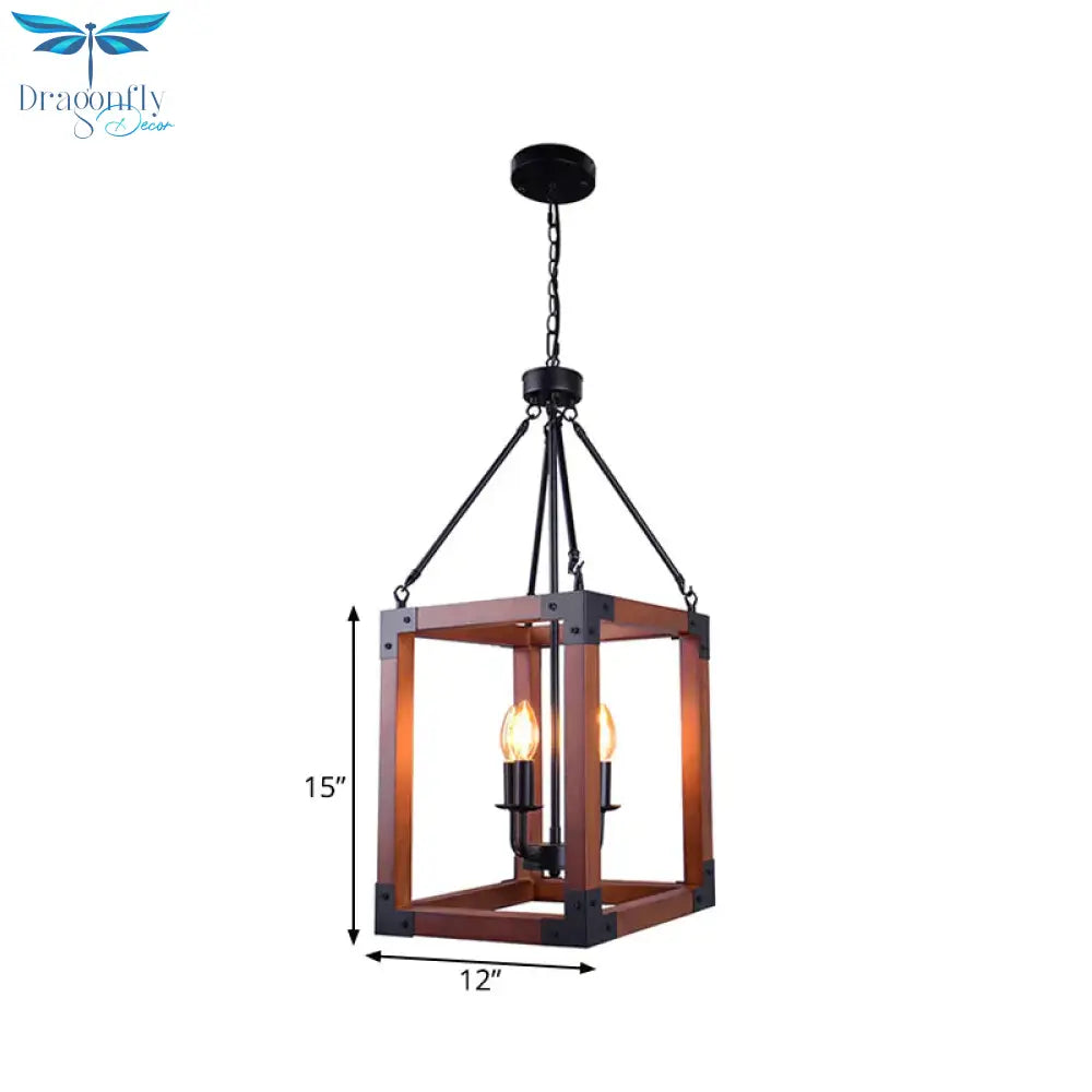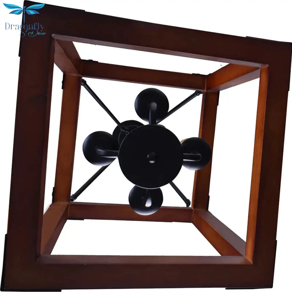 Metal Square Frame Pendant Lighting Fixture Traditional 4 Lights Restaurant Ceiling Chandelier in Dark Wood