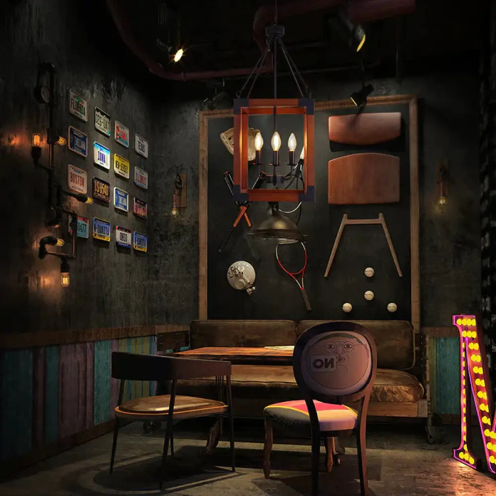 This sophisticated Metal Square Frame Pendant Lighting Fixture combines vintage and contemporary style. It's made from black metal and dark wood for a traditional look, and has 4 adjustable lights for versatile lighting options. Perfect for restaurants and other settings.