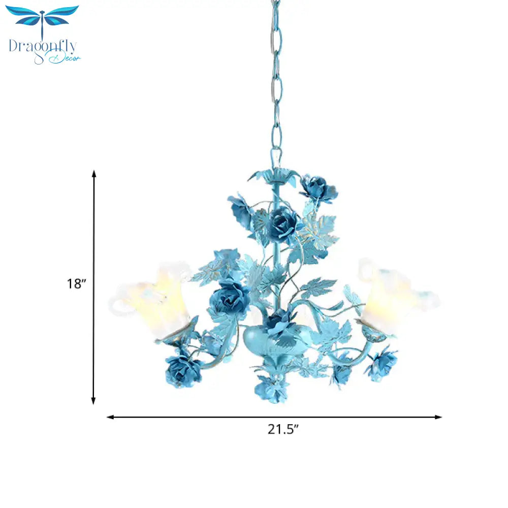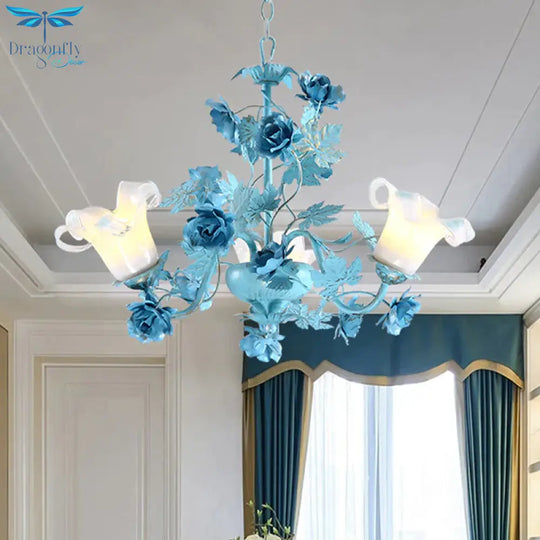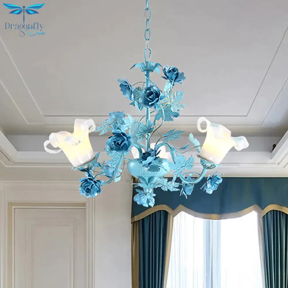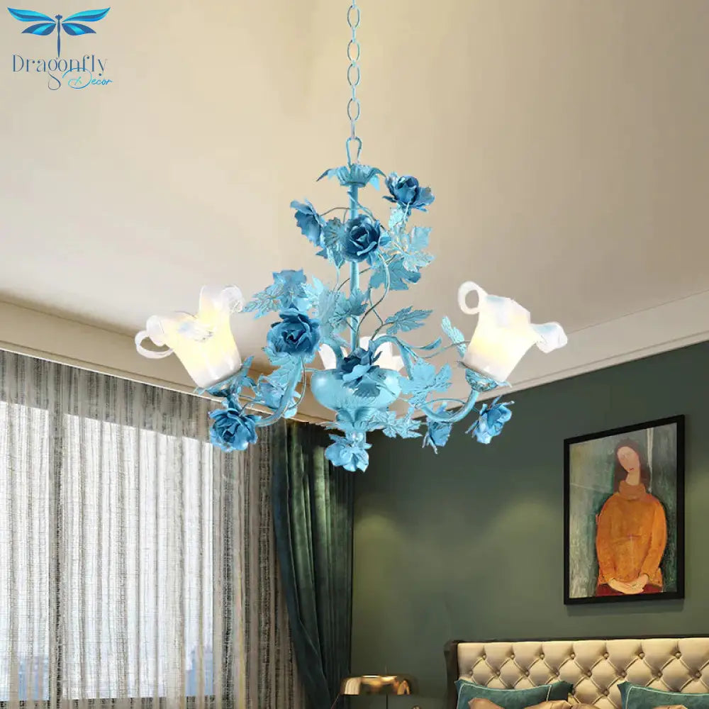 Metal Swooping Arm Suspension Lamp Korean Garden 3/6 Bulbs Bedroom Chandelier with Blue Flower and Leaf