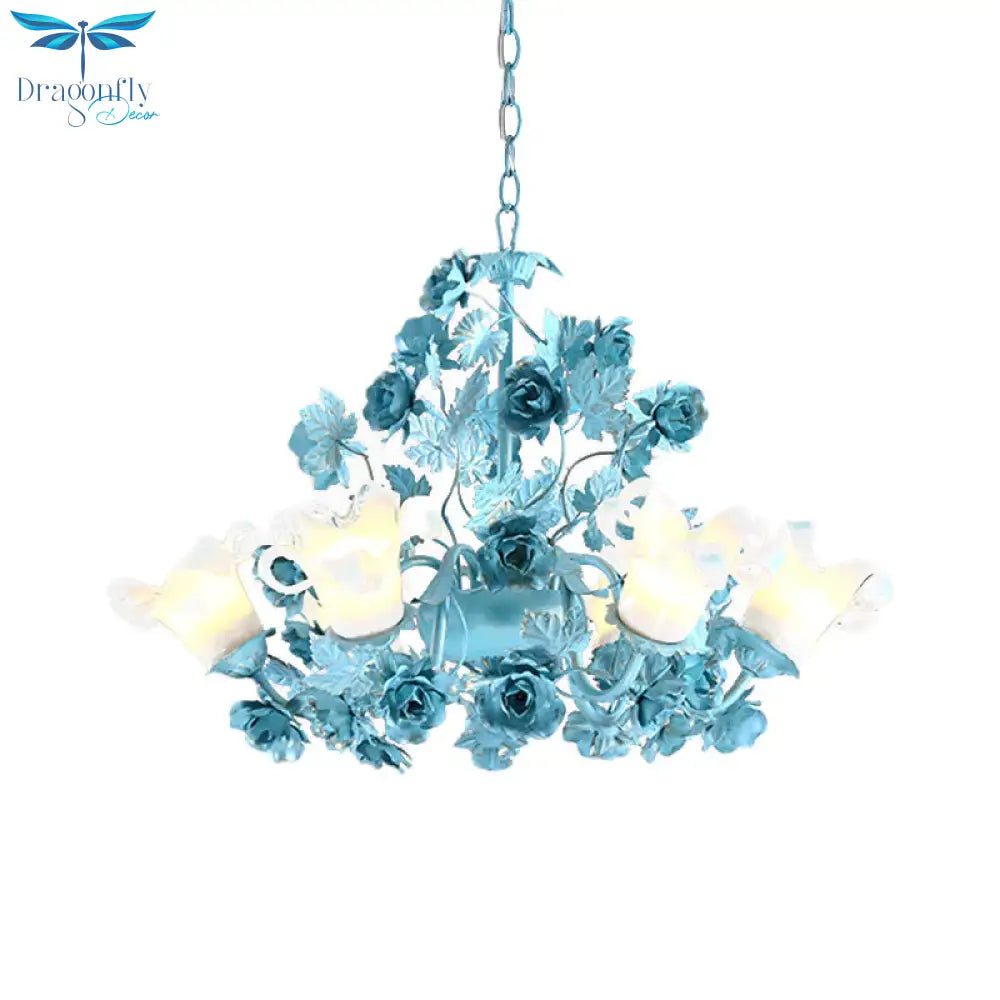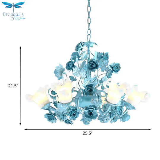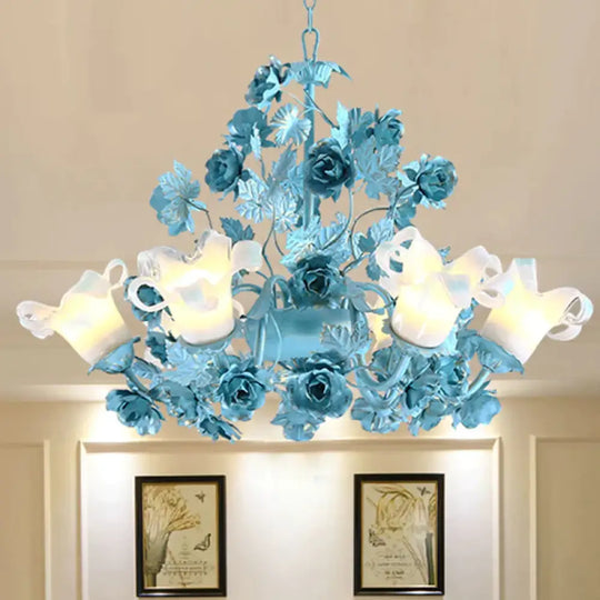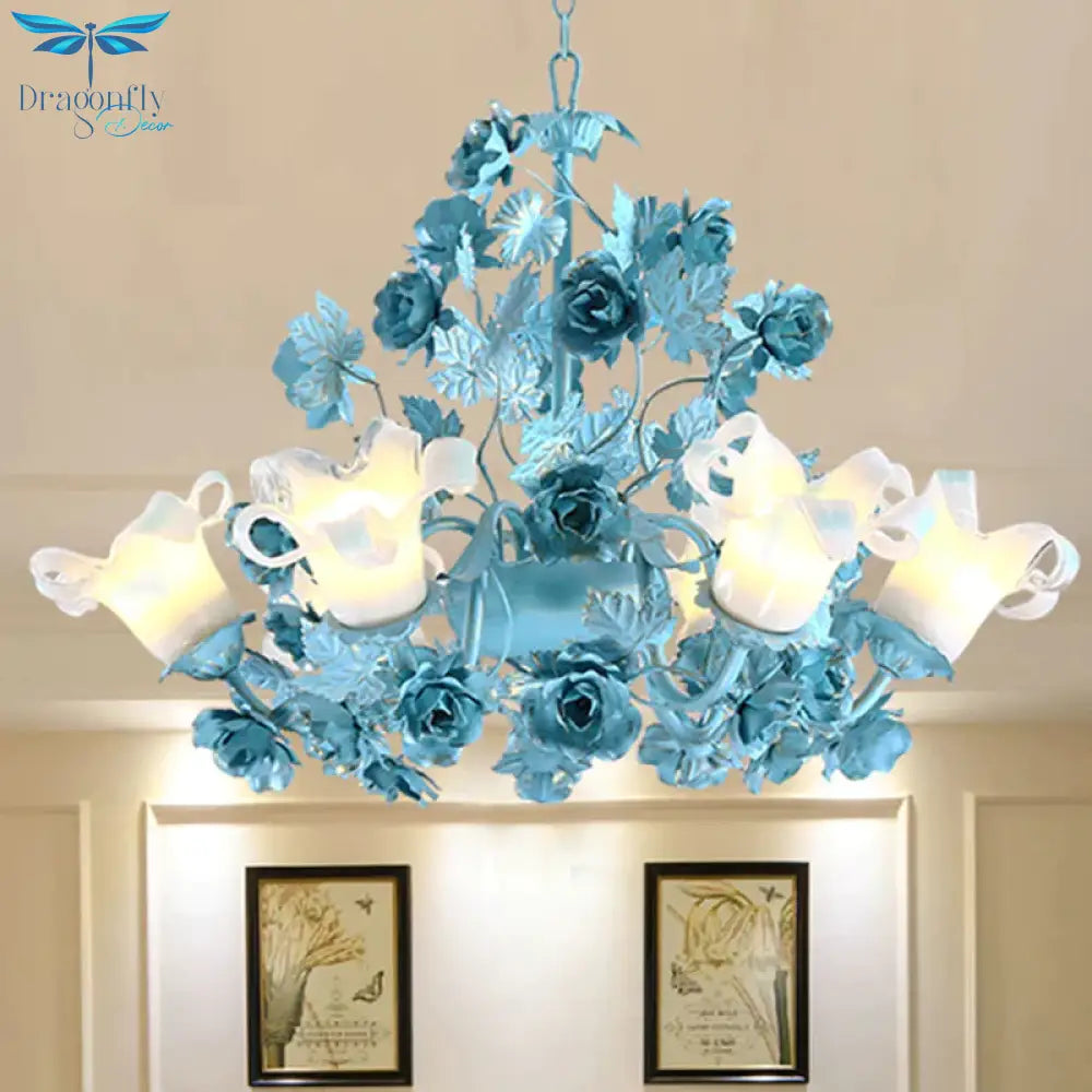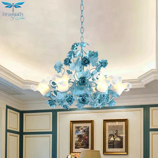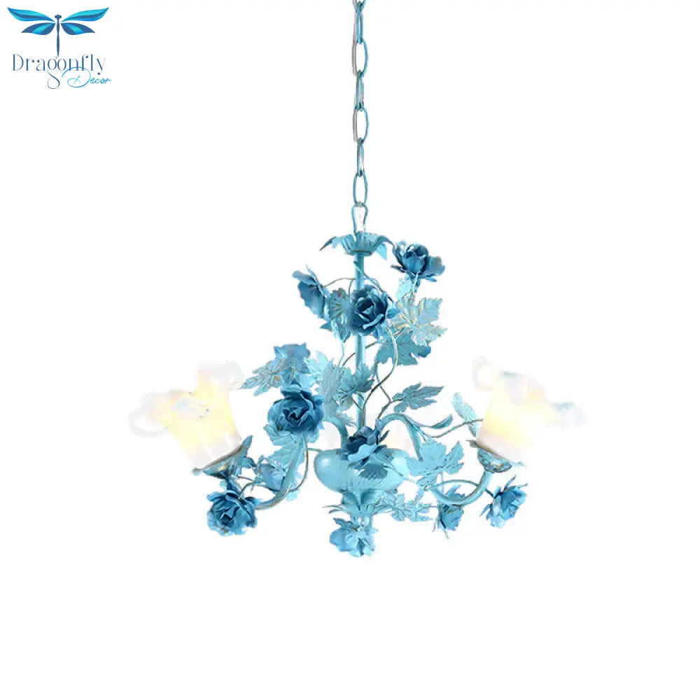 Metal Swooping Arm Suspension Lamp Korean Garden 3/6 Bulbs Bedroom Chandelier with Blue Flower and Leaf