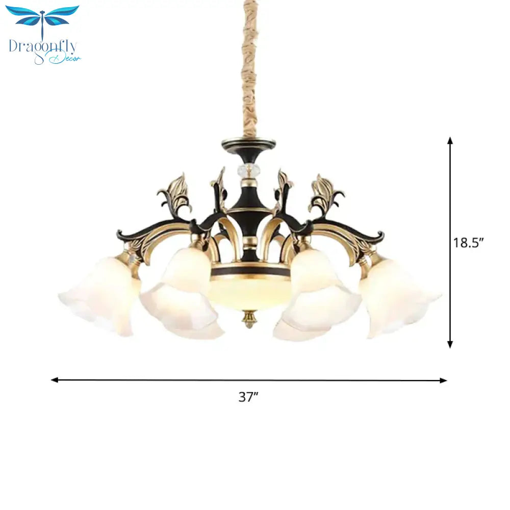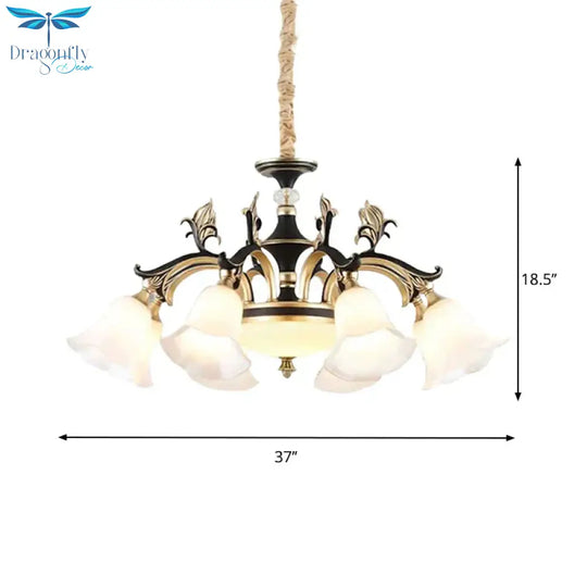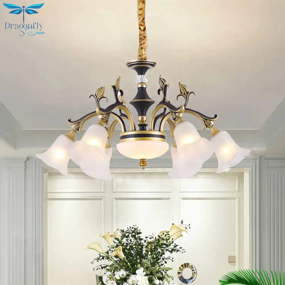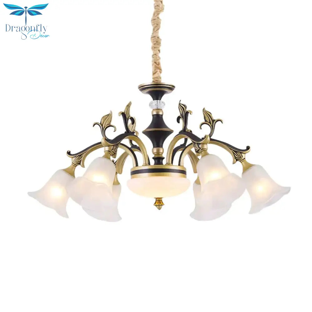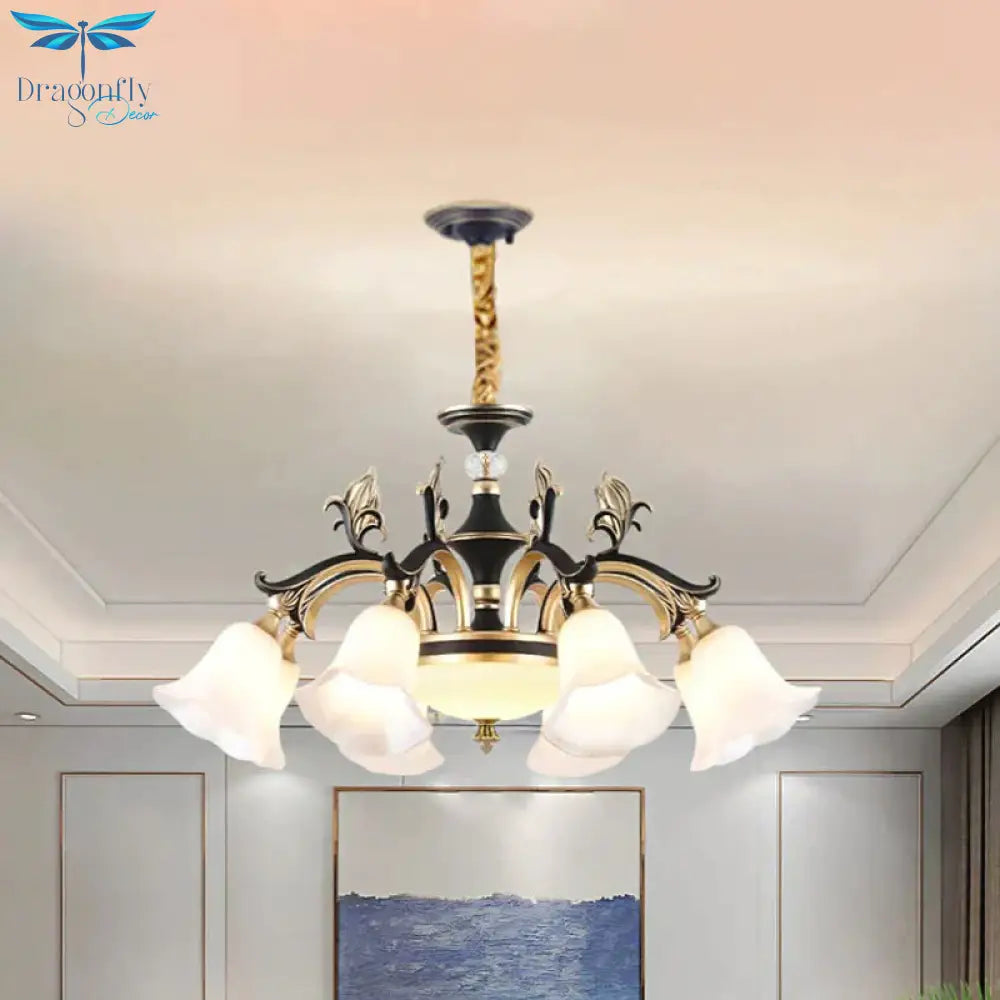 Metallic Black-Gold Suspended Lighting Fixture Curvy Arm 6/8-Light Traditional Style Chandelier with Flower Glass Shade