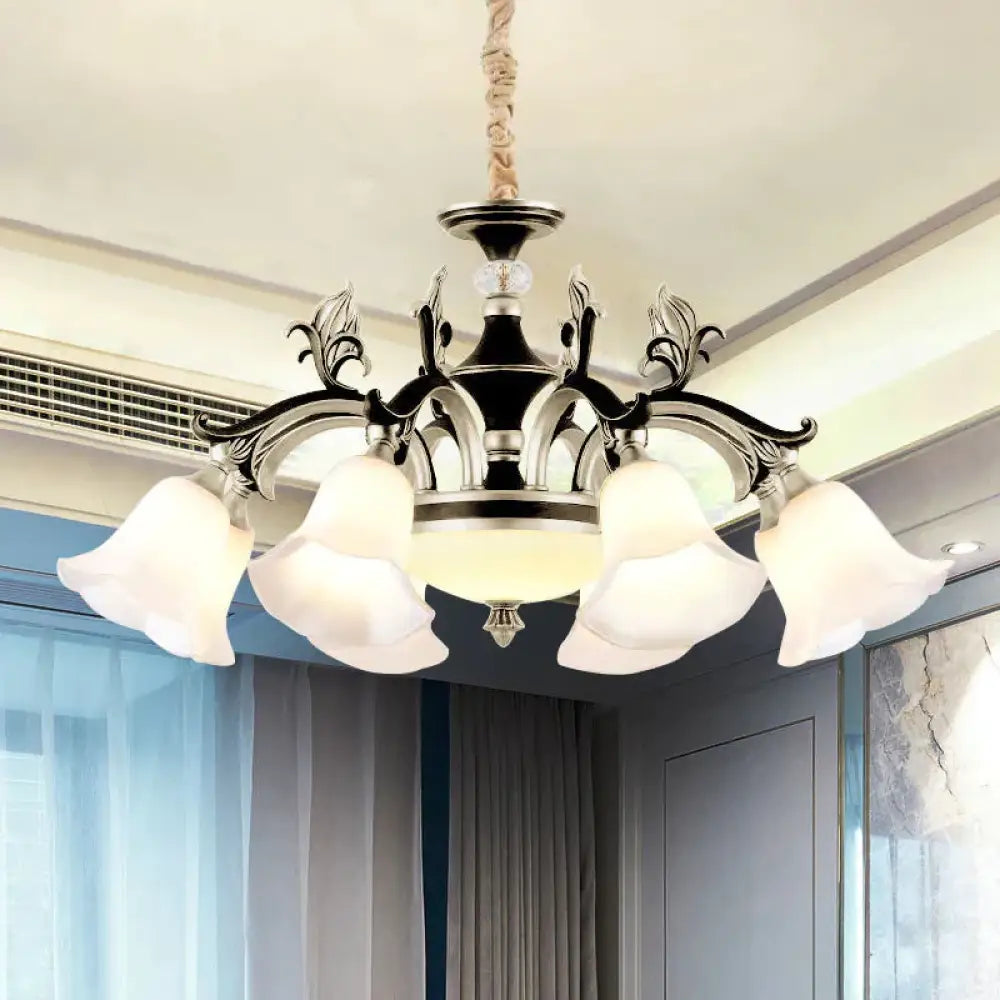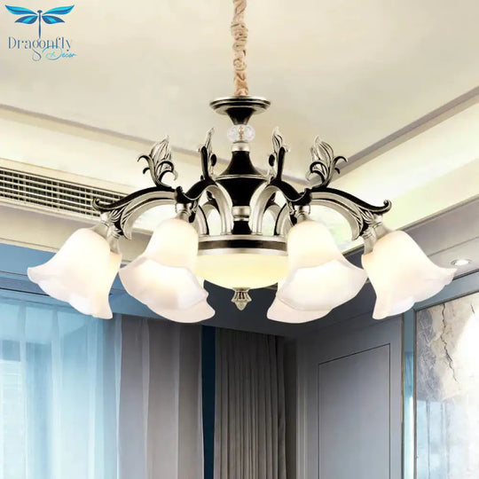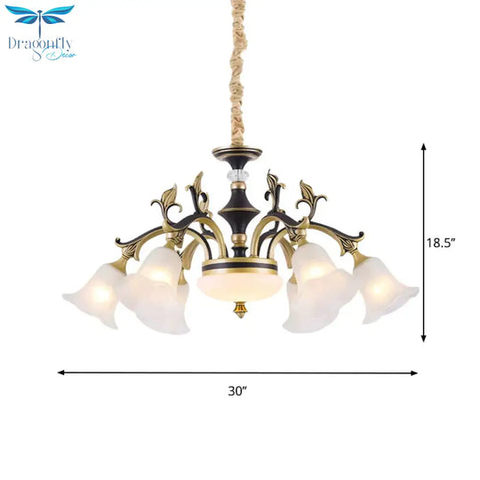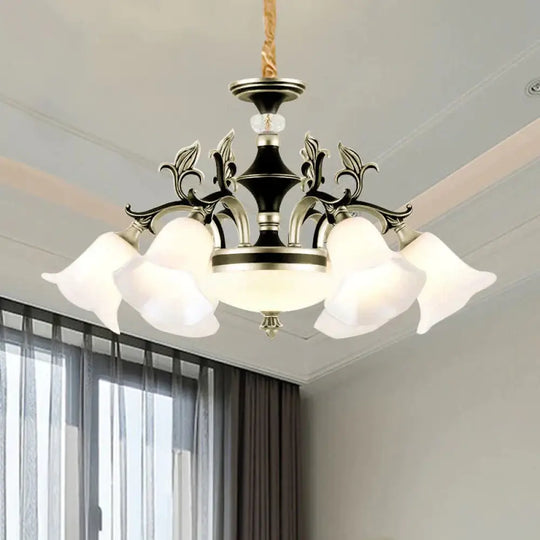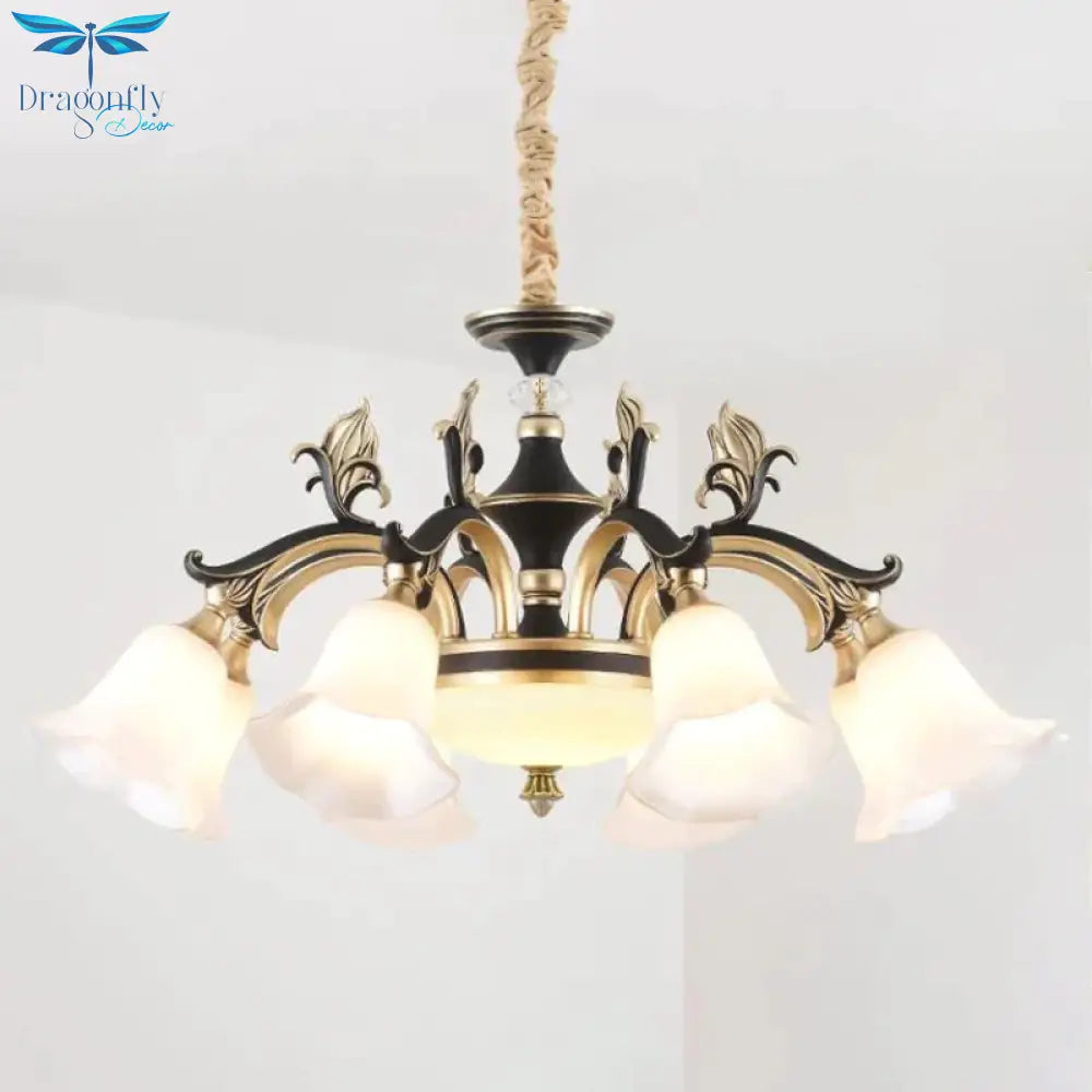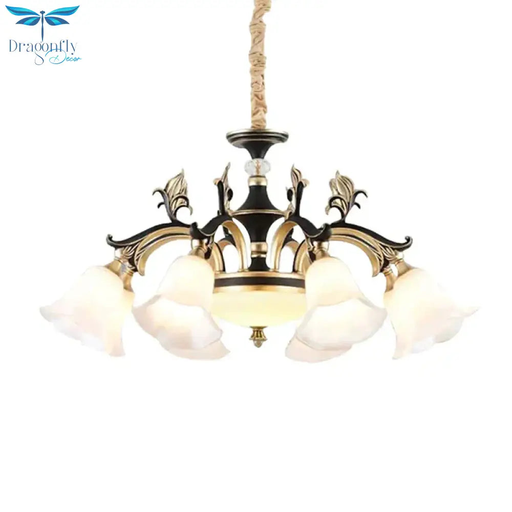 Metallic Black-Gold Suspended Lighting Fixture Curvy Arm 6/8-Light Traditional Style Chandelier with Flower Glass Shade