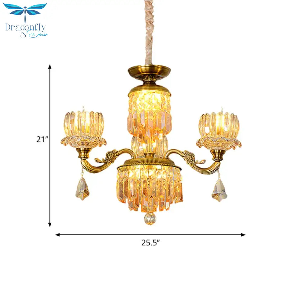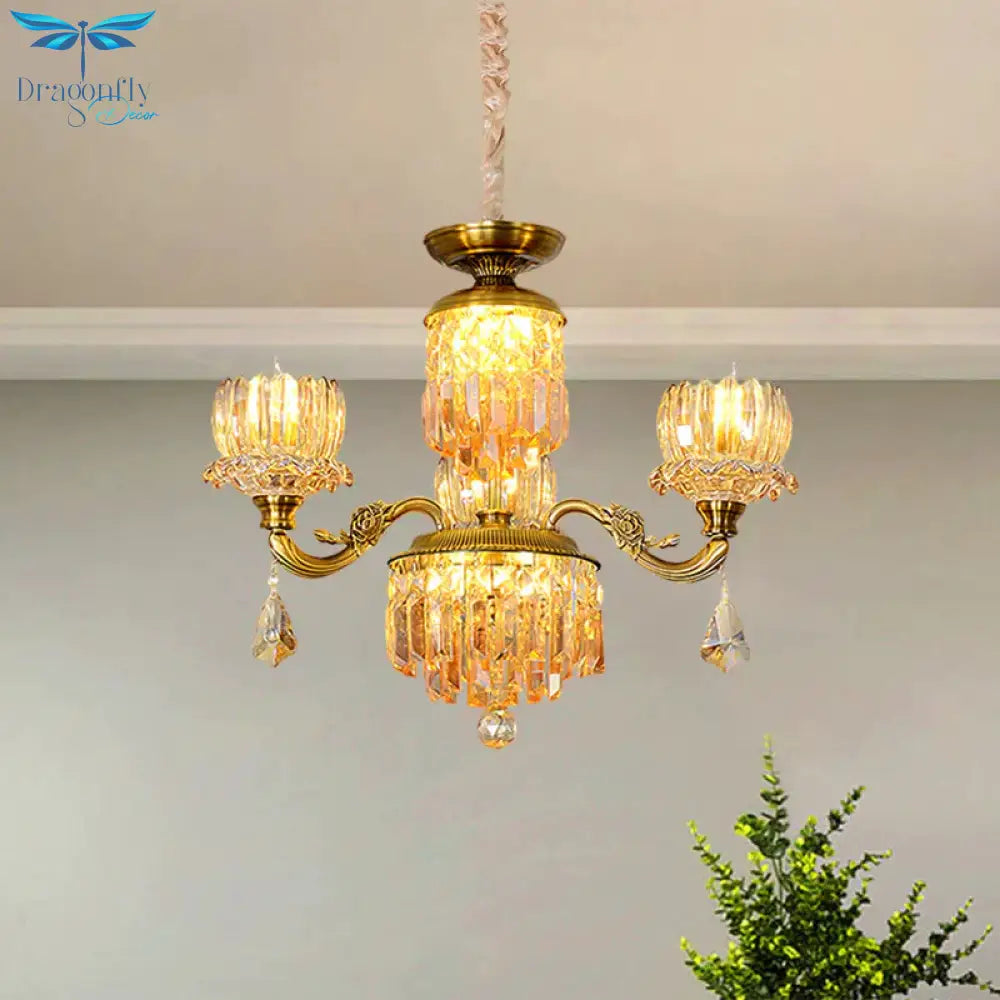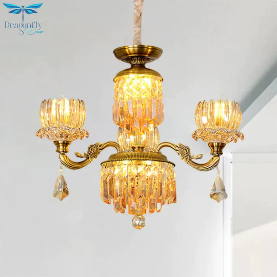 Mid Century Floral Ceiling Chandelier 3 Heads Amber Crystal Pendulum Light in Brass