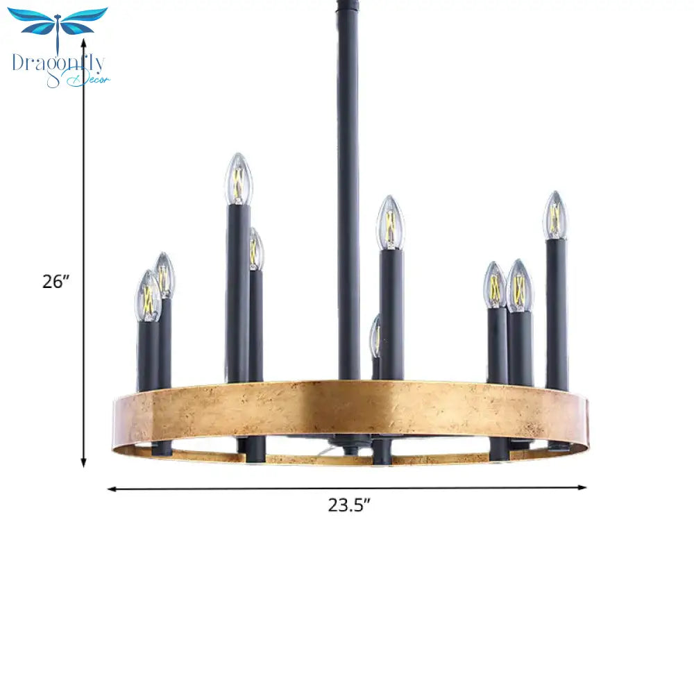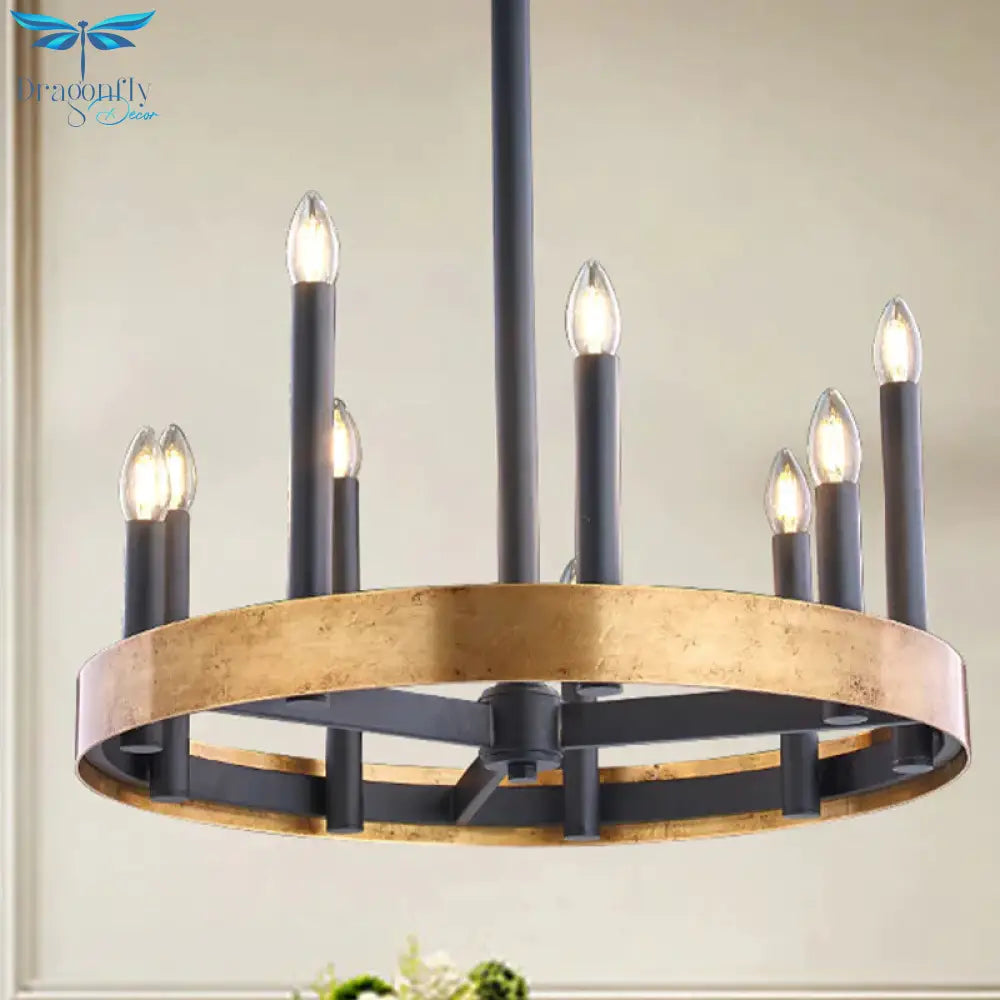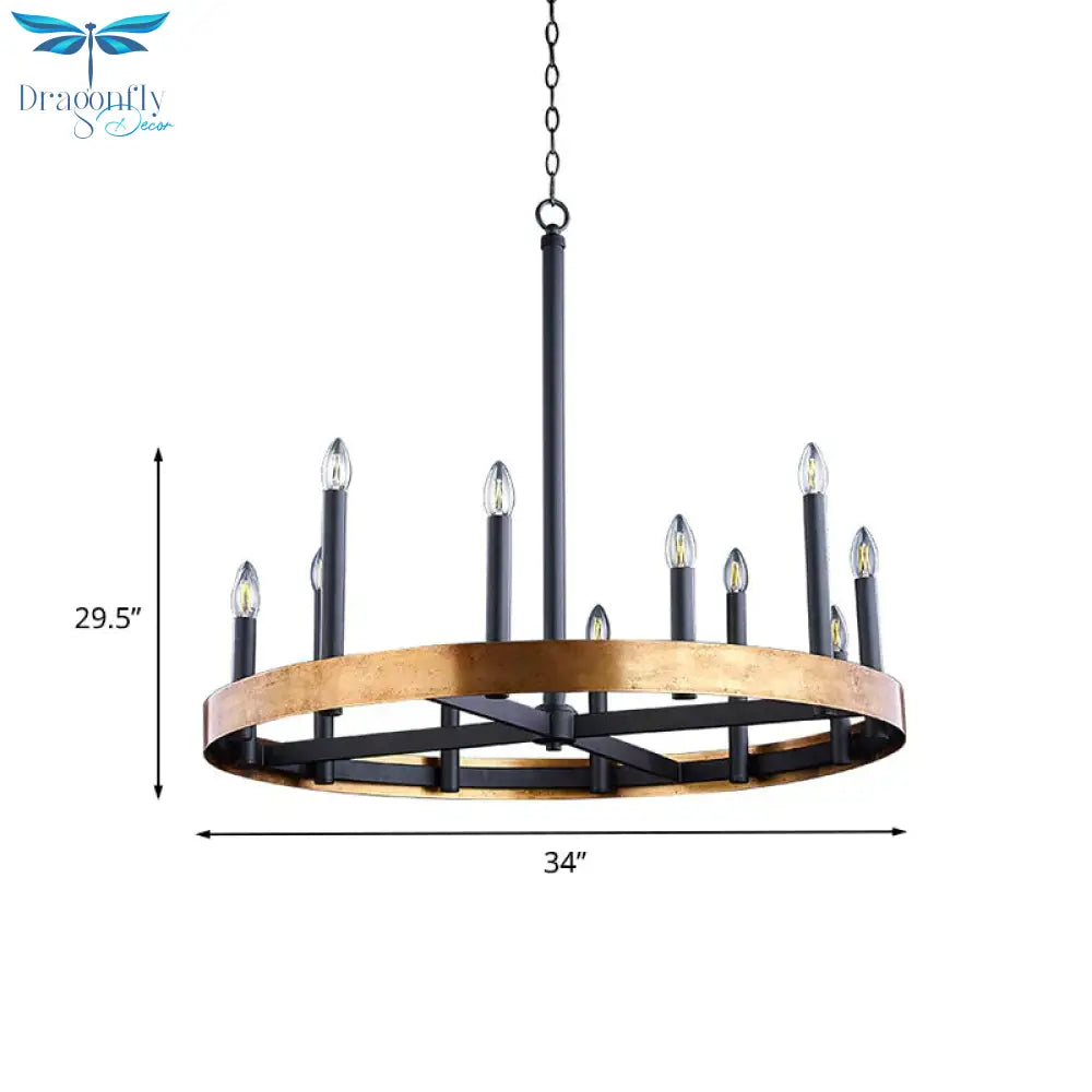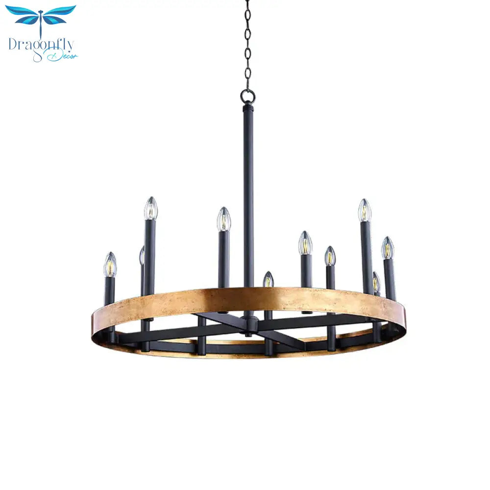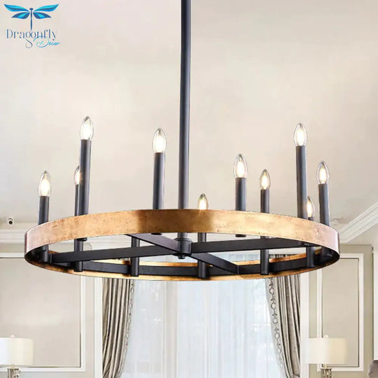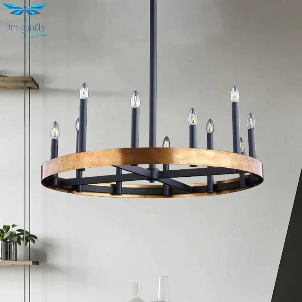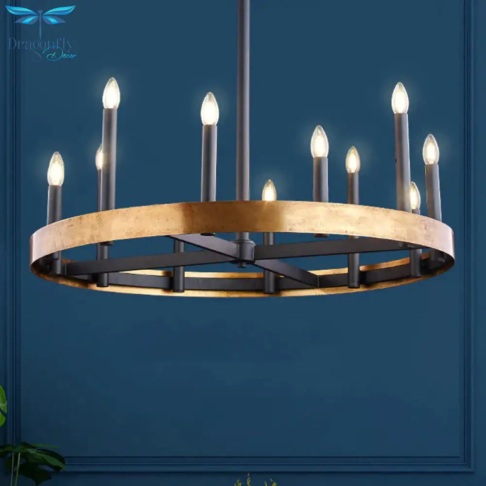 Mid-Century Wheel Chandelier 9/12 Heads Metal Ceiling Suspension Lamp in Black-Gold with Candle Design