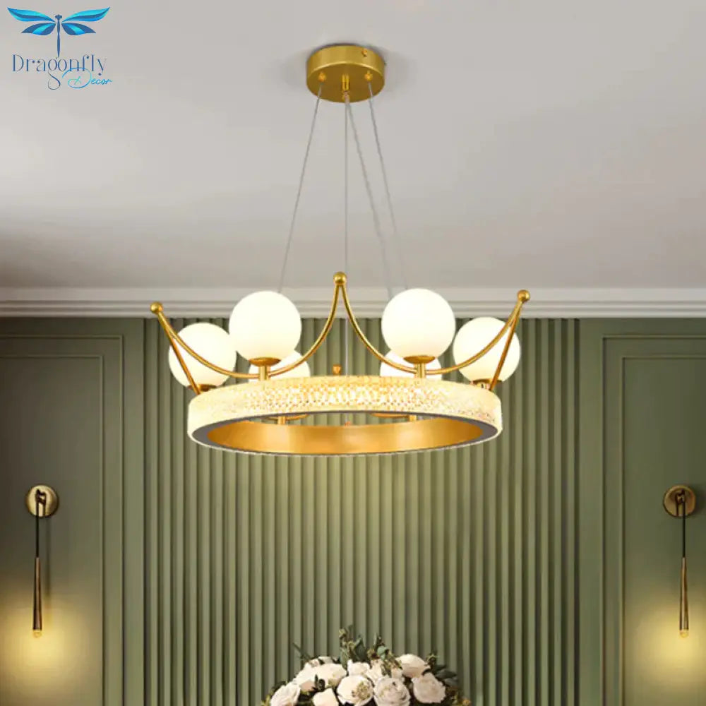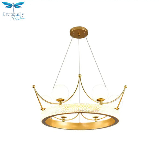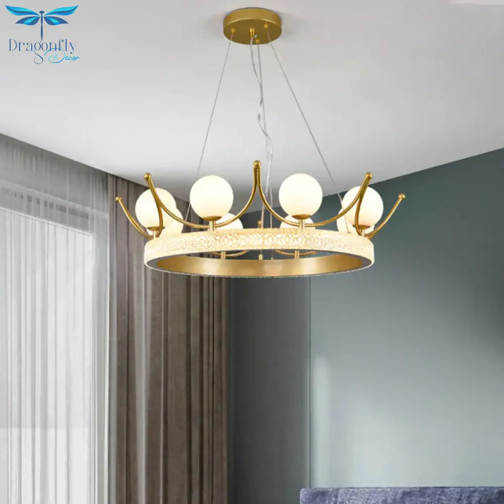 Modern Crown Shape Suspension Lamp Metal 6 Lights Girl Room LED Ceiling Chandelier in Gold with Orb Cream Glass Shade