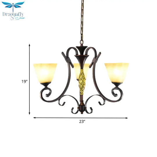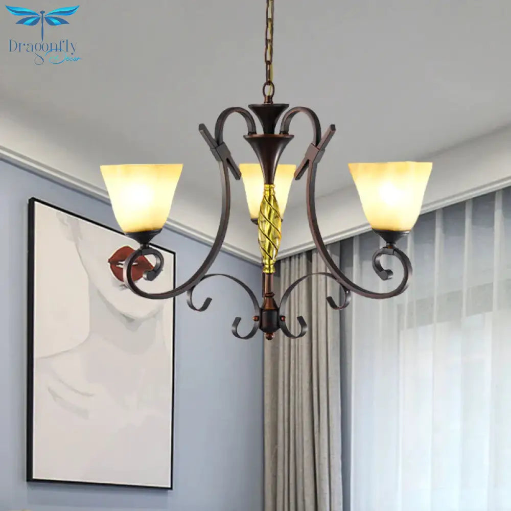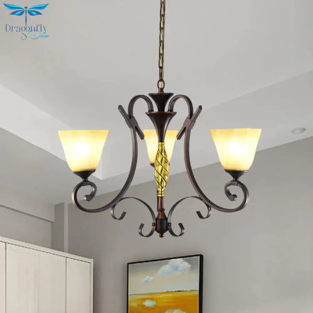 Opal Glass Bell Suspension Lighting Vintage 3-Light Living Room Chandelier with Swirled Arm in Bronze