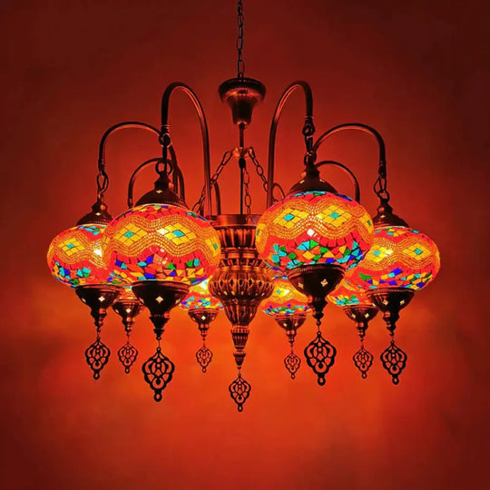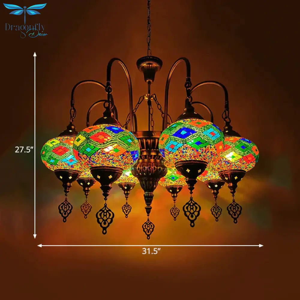 Oval Stained Glass Chandelier Light Fixture Traditional 9 Heads Dining Room Hanging Lamp Kit in Orange/Green