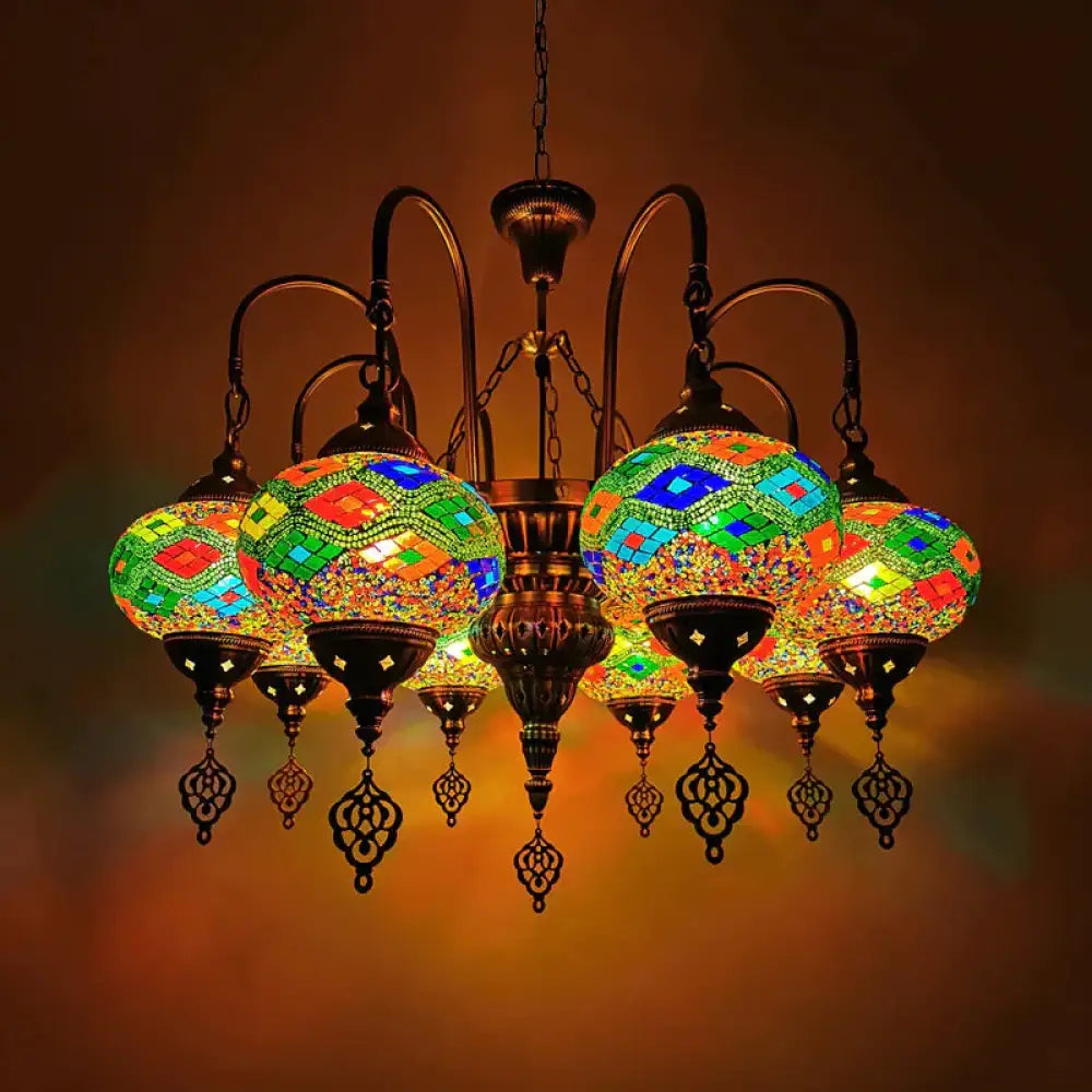 Crafted with meticulous attention to detail, the chandelier features nine heads adorned with stunning stained glass shades in a mesmerizing combination of orange and green. The intricate patterns and delicate curves create a captivating play of light, casting a warm and inviting glow throughout the room.