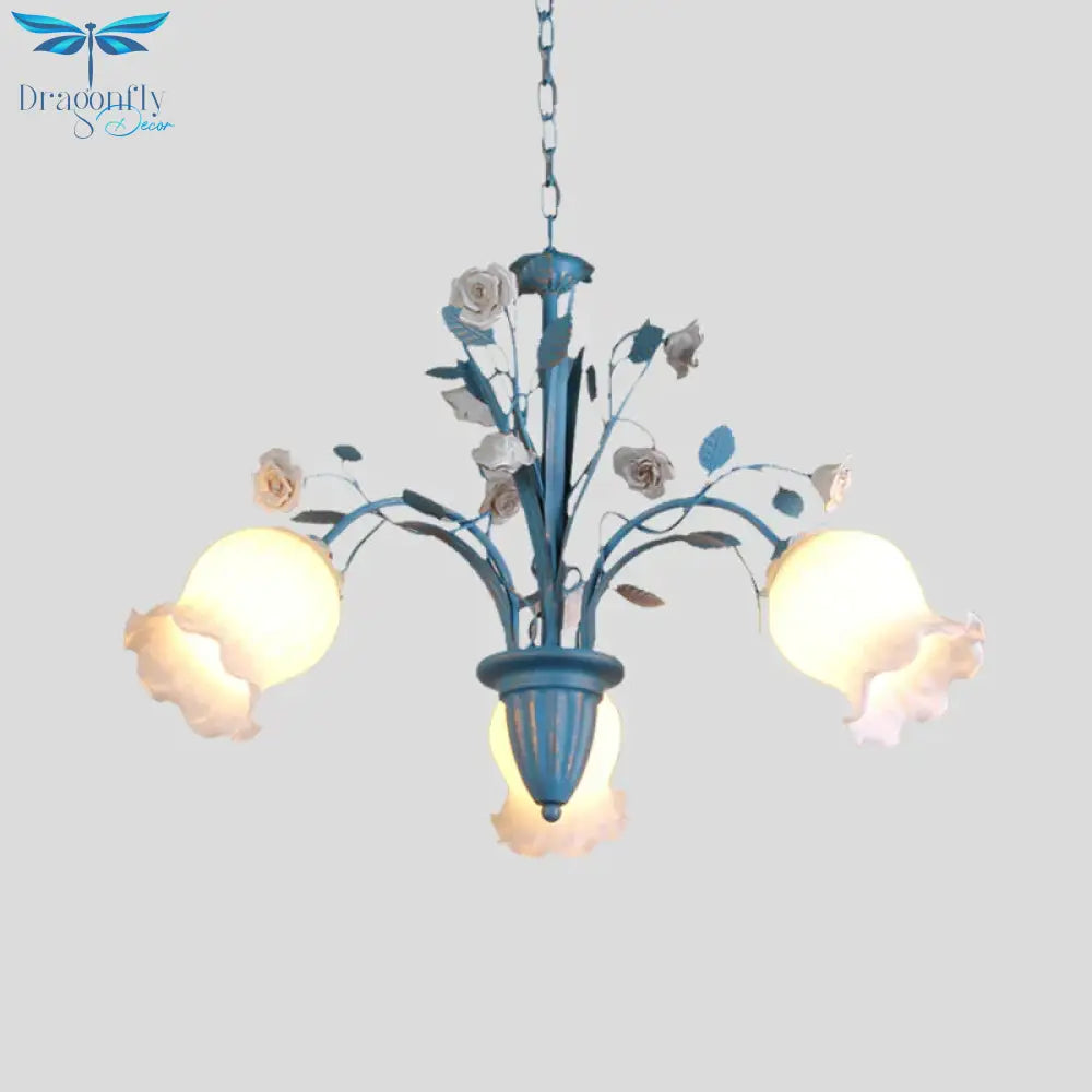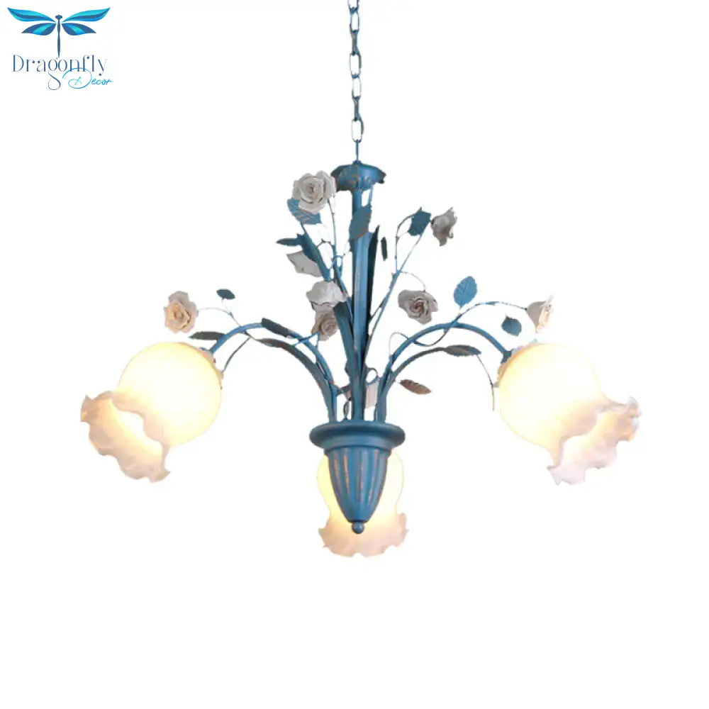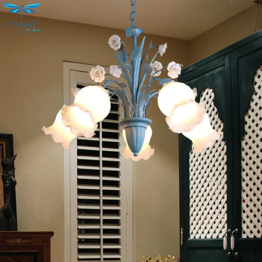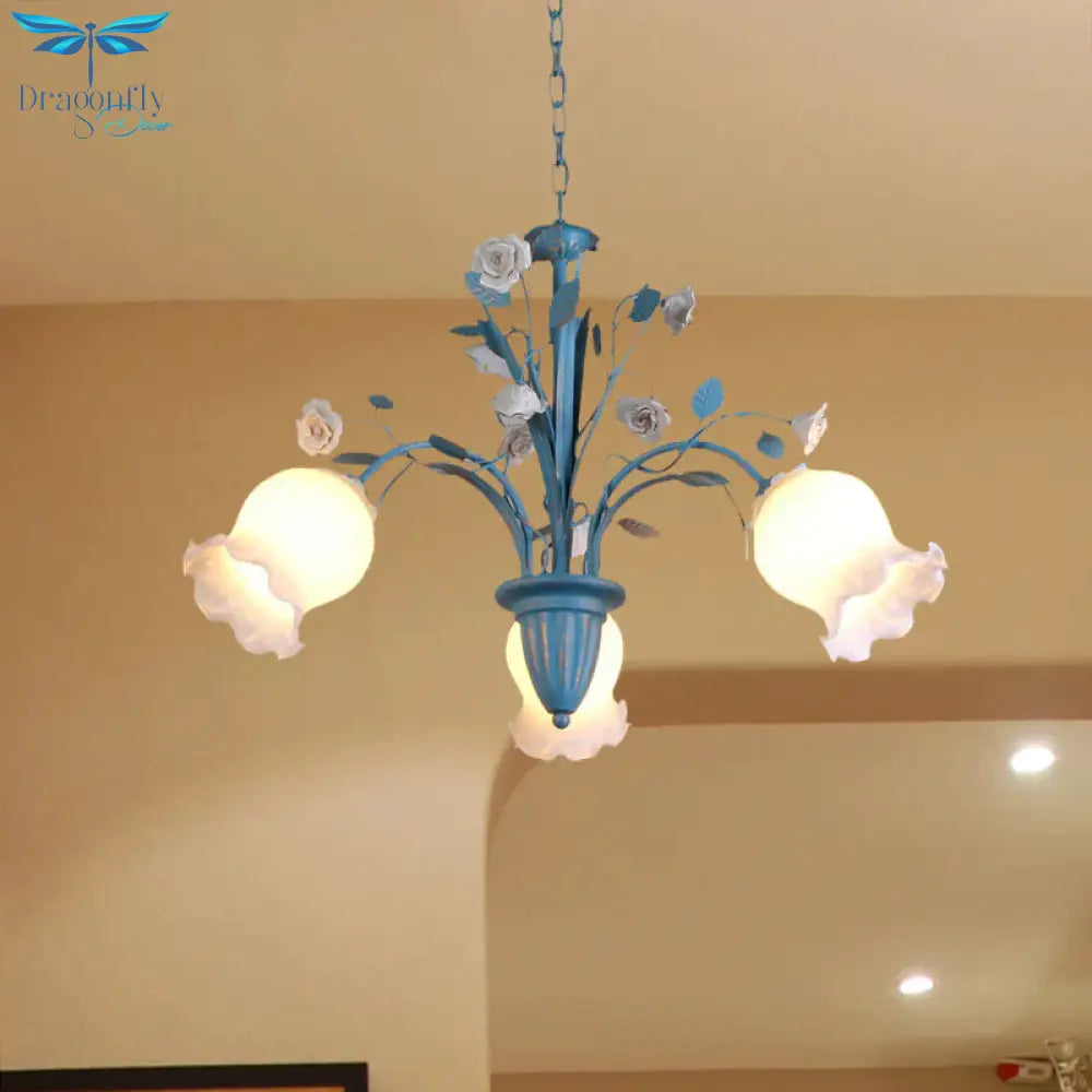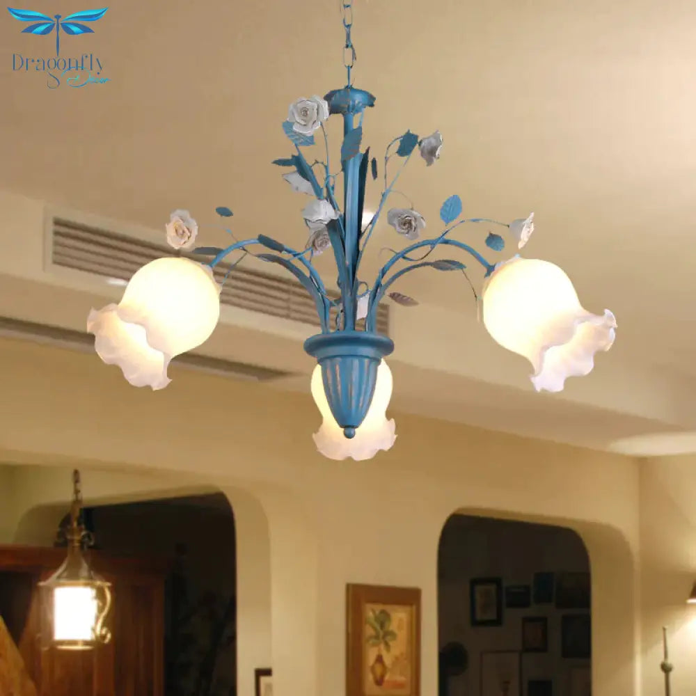 Pastoral Blossom Chandelier Lighting Fixture 3/5/6 Heads White Glass Pendant Ceiling Light in Blue