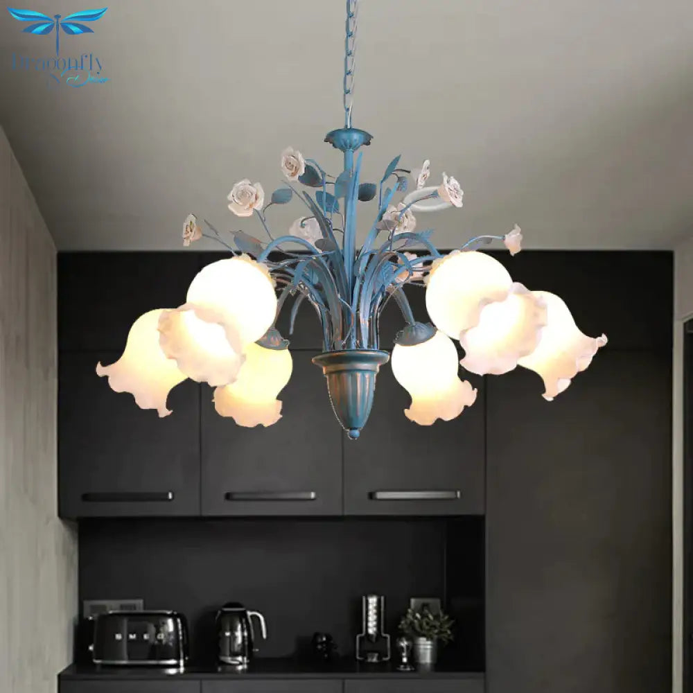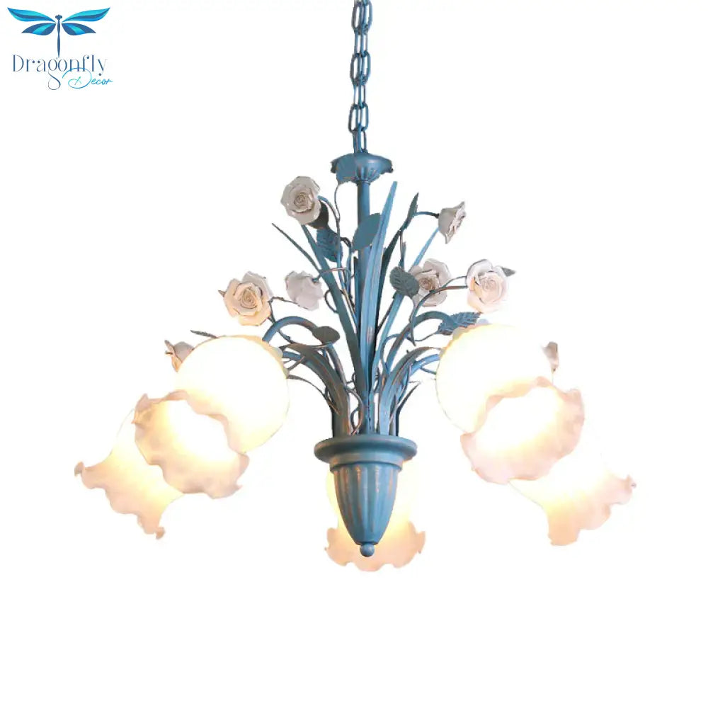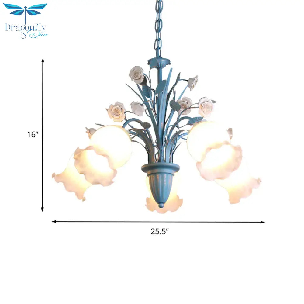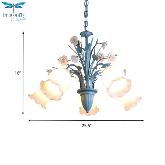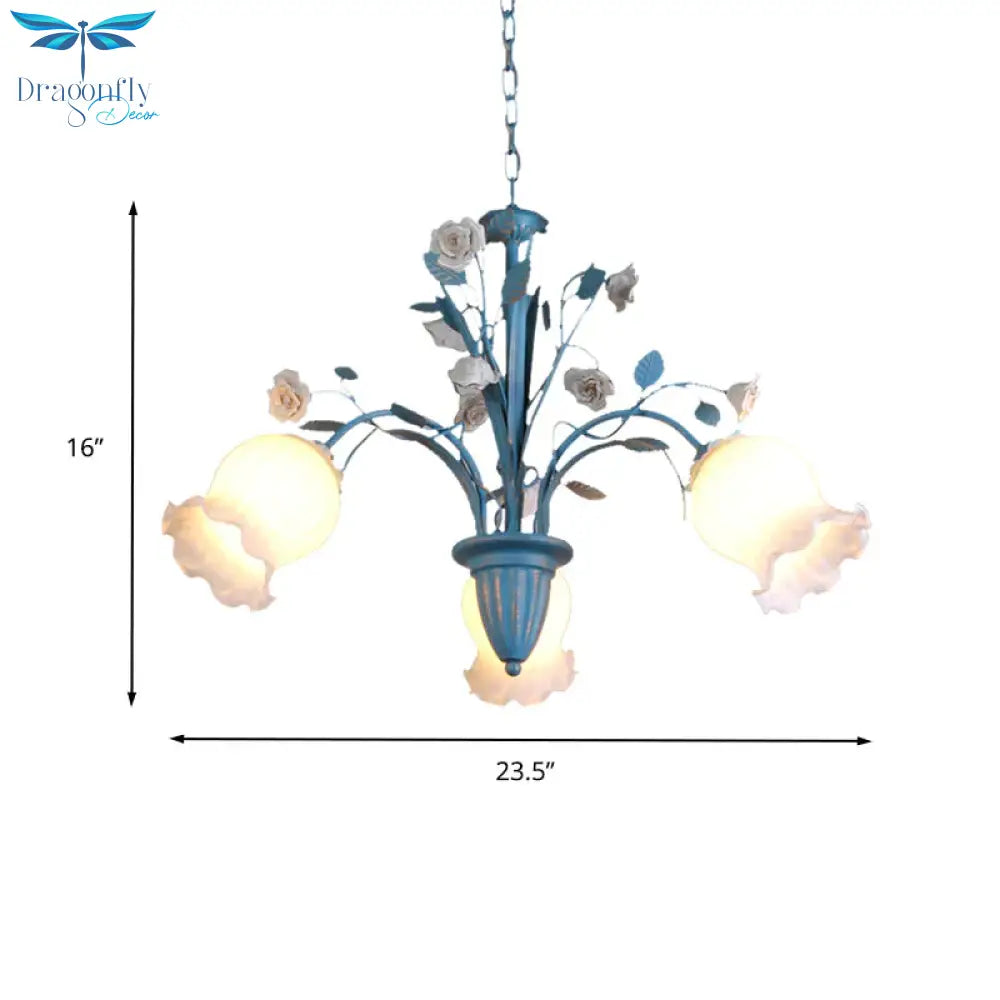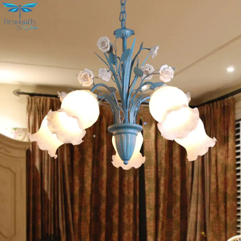 Pastoral Blossom Chandelier Lighting Fixture 3/5/6 Heads White Glass Pendant Ceiling Light in Blue
