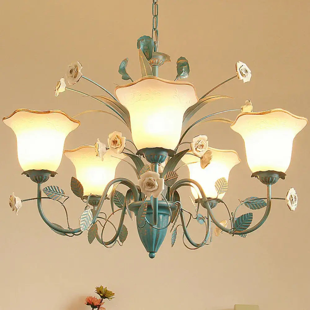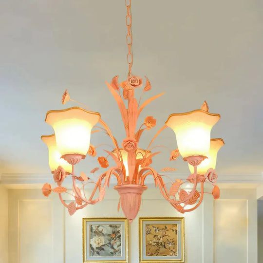 Pink/Blue Blossom Ceiling Chandelier Pastoral Milk Glass 3/5 Lights Dining Room Hanging Light Fixture