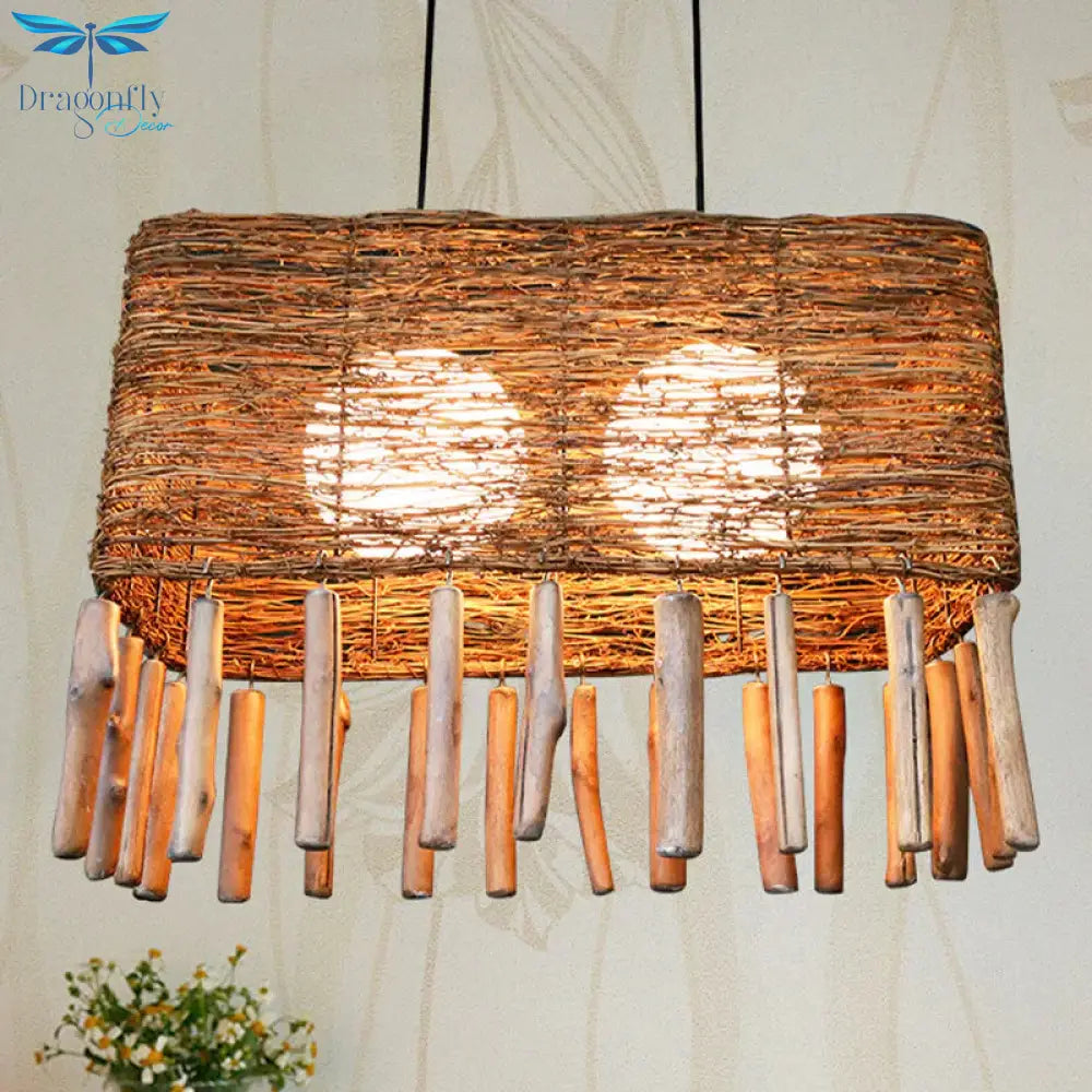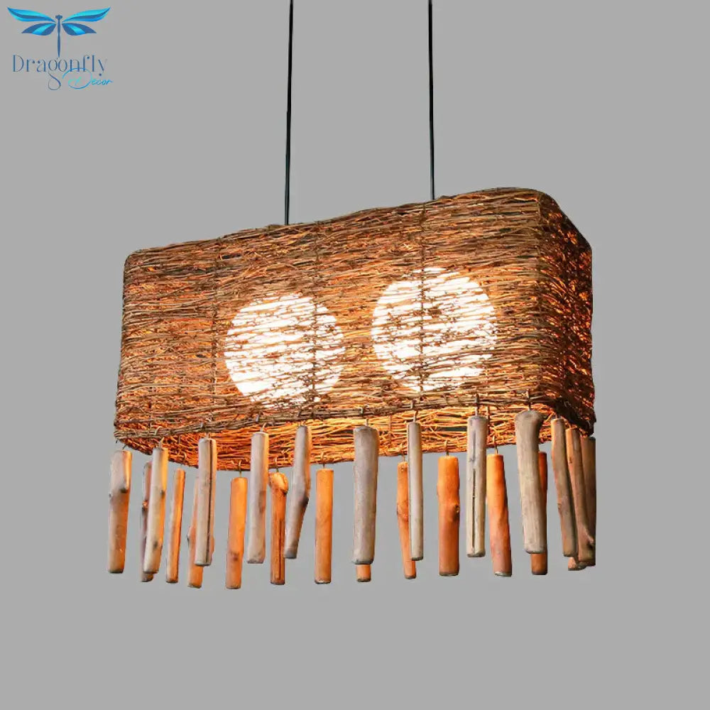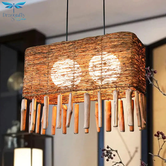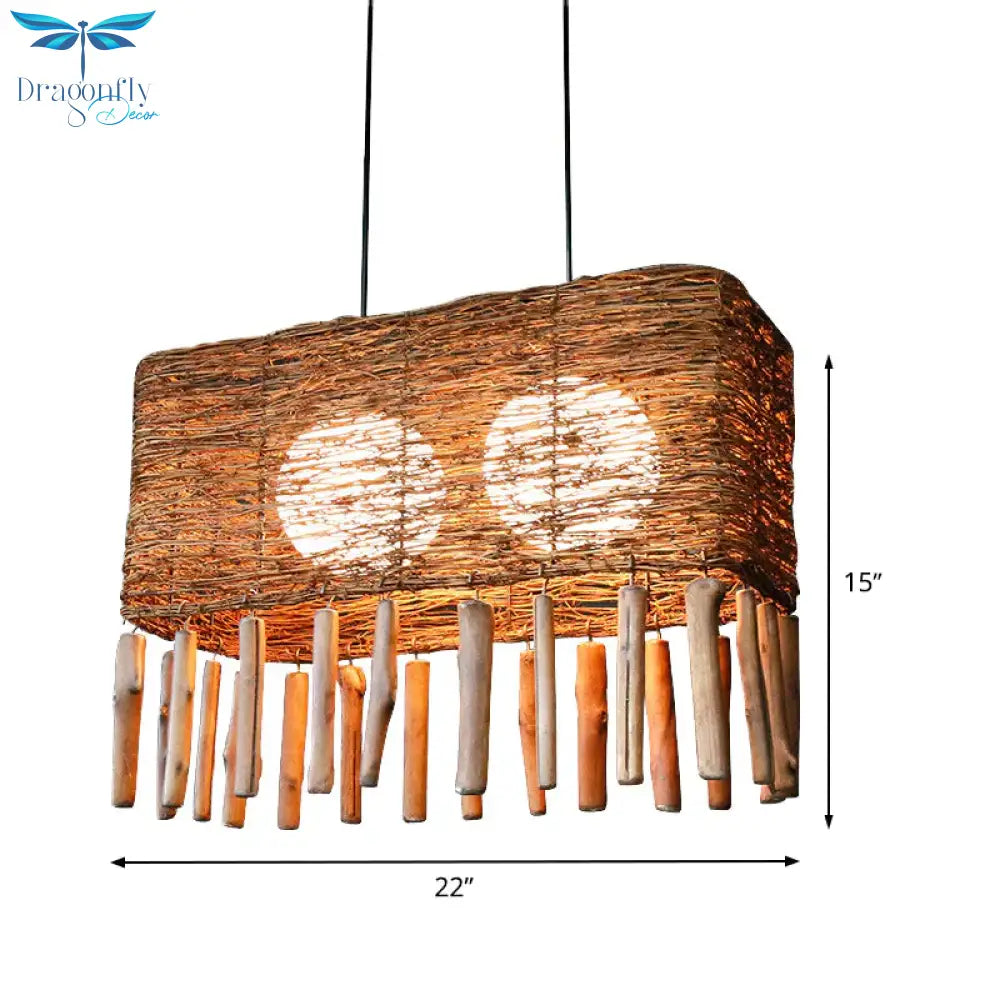 Rectangle Rattan Chandelier Light Chinese 2 Bulbs Brown Suspended Ligh