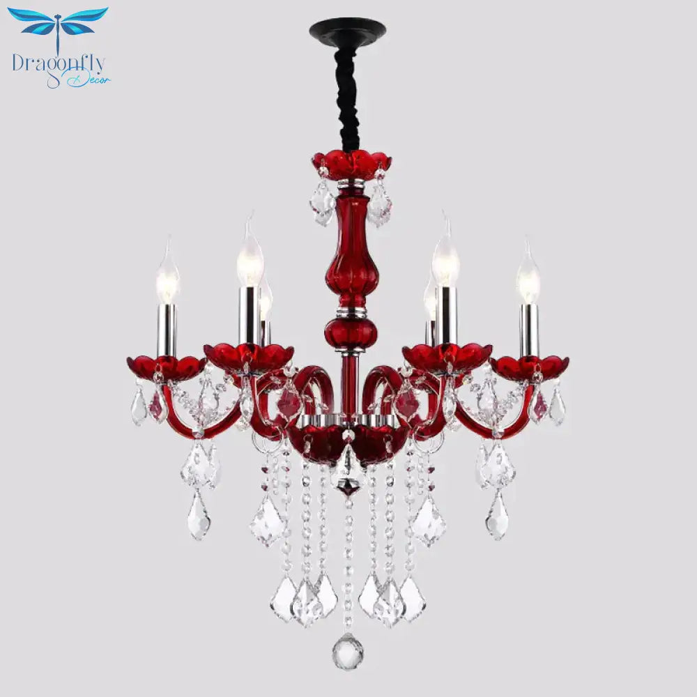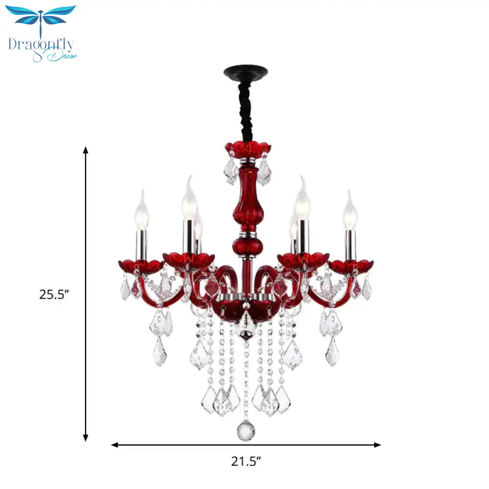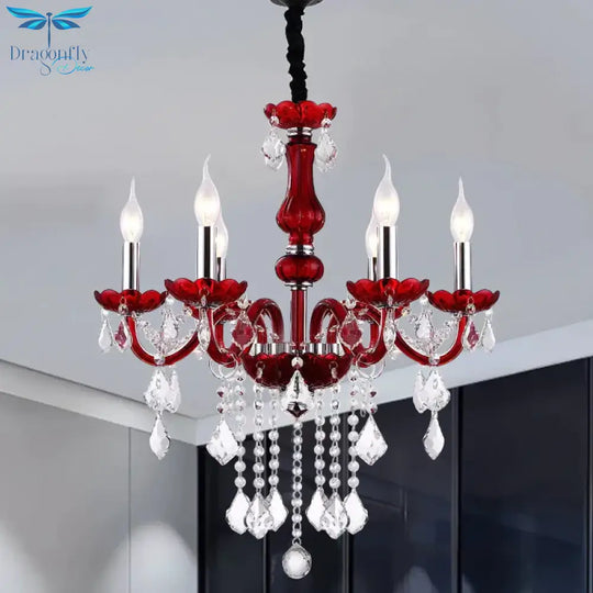 Red Candlestick Hanging Pendant Antique Faceted Crystal 6 Heads Living Room Chandelier