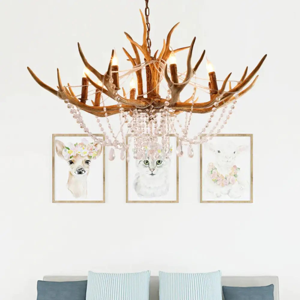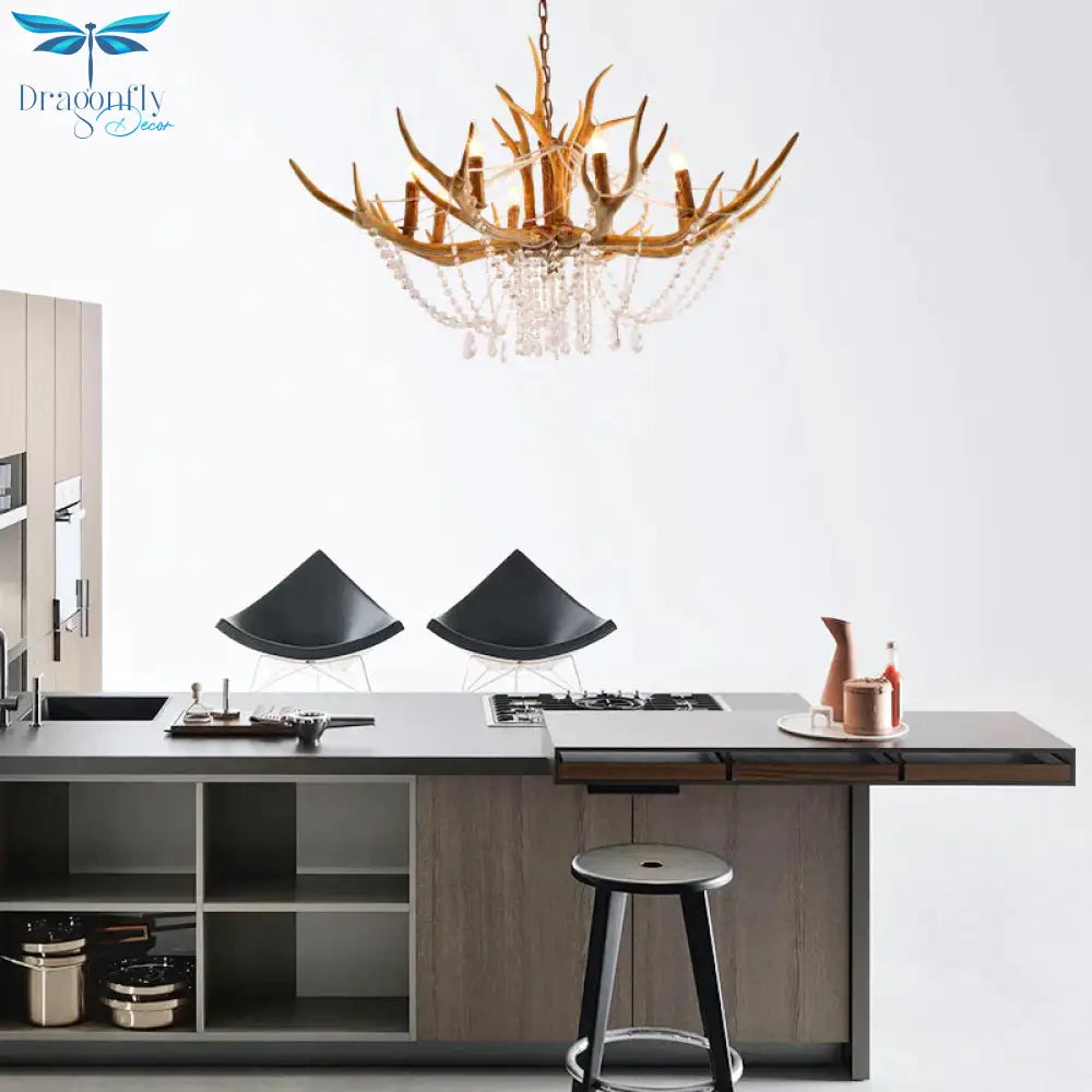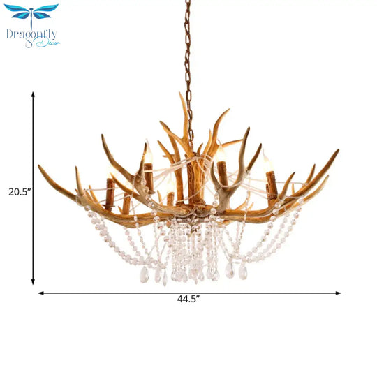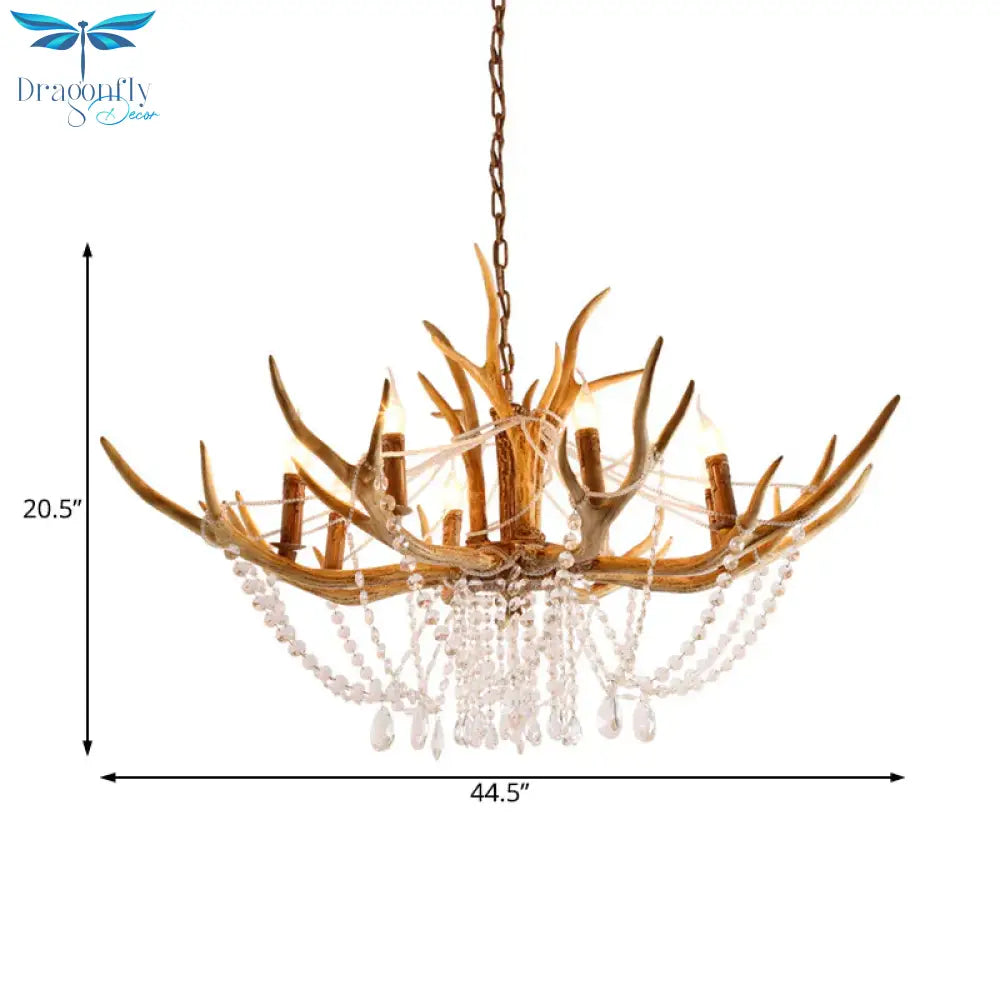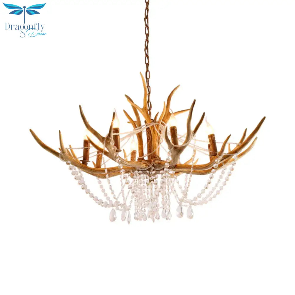 Resin Candle Chandelier Lamp Rustic 8-Head Kitchen Island Pendant Ceiling Light with Cascading Crystal in Brown