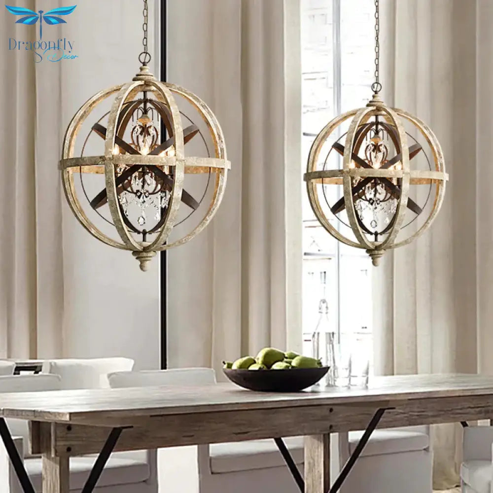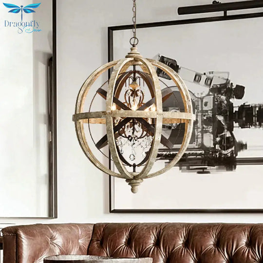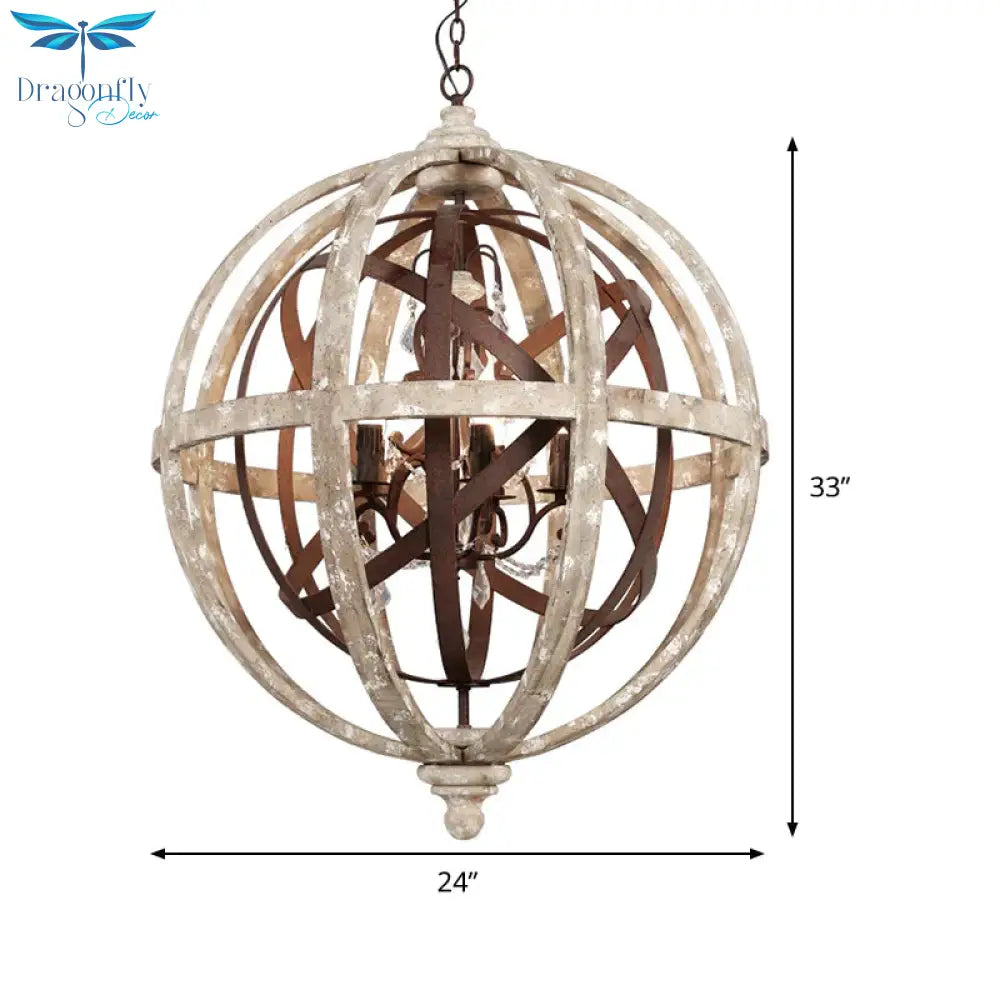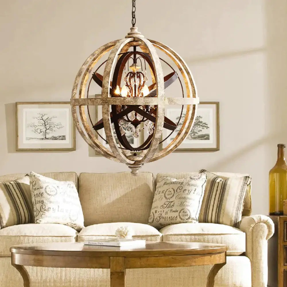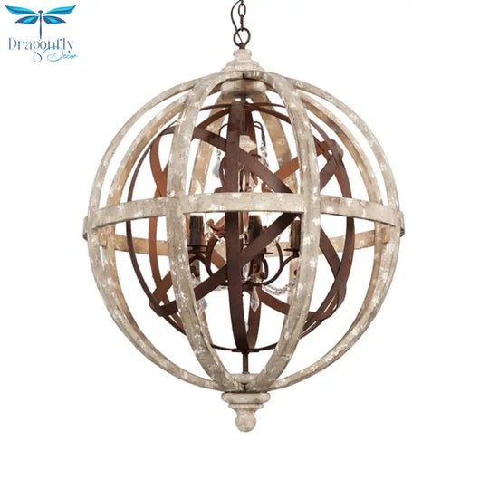 Retro 5 Heads Chandelier Lamp Rust Laser-Cut Ceiling Pendant Light with Wood Shade for Living Room