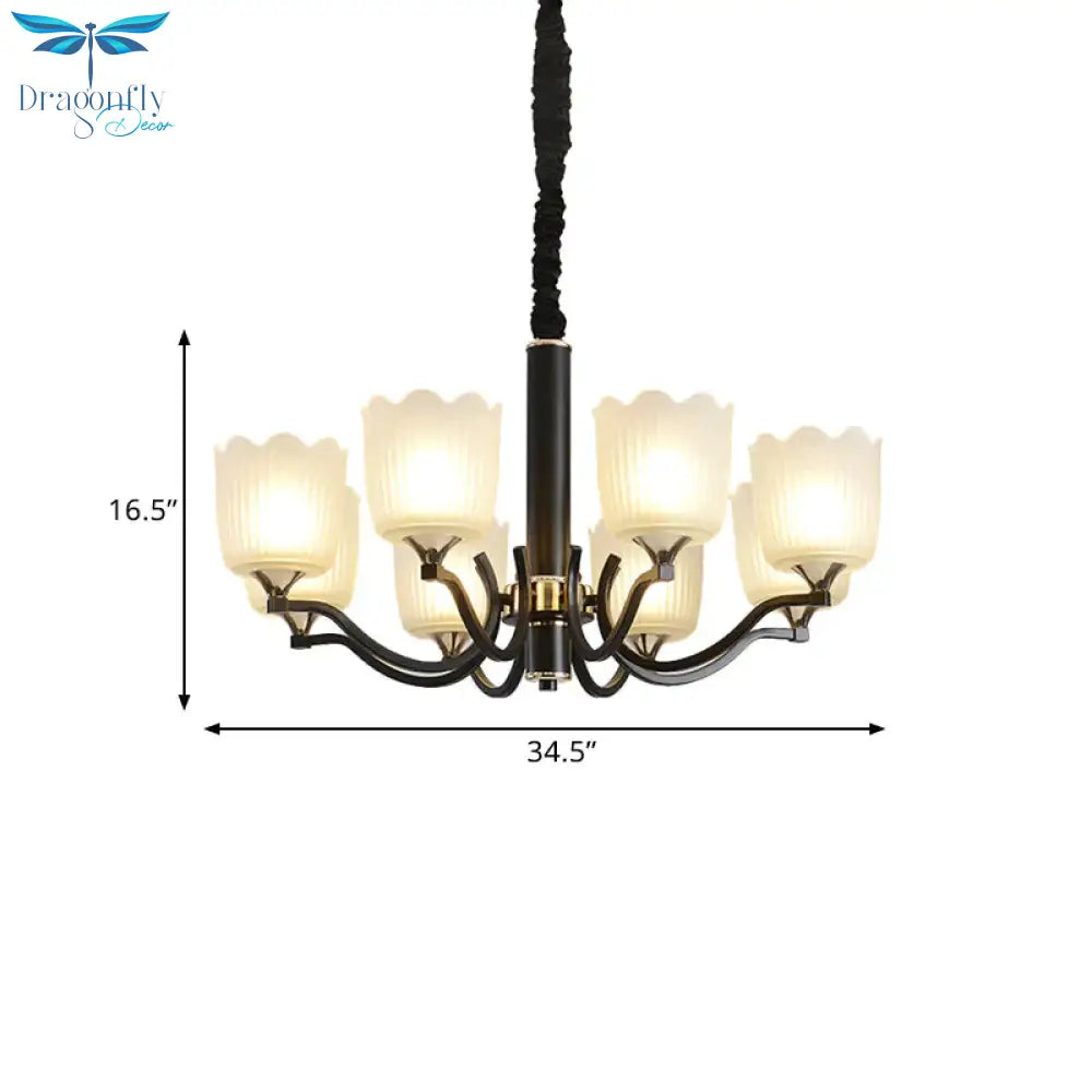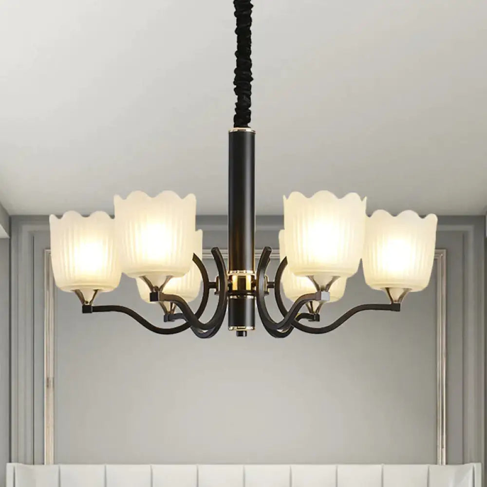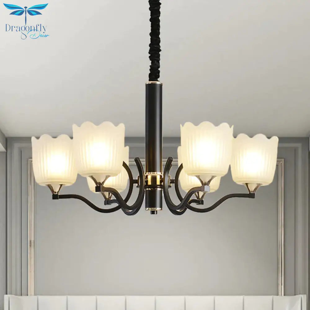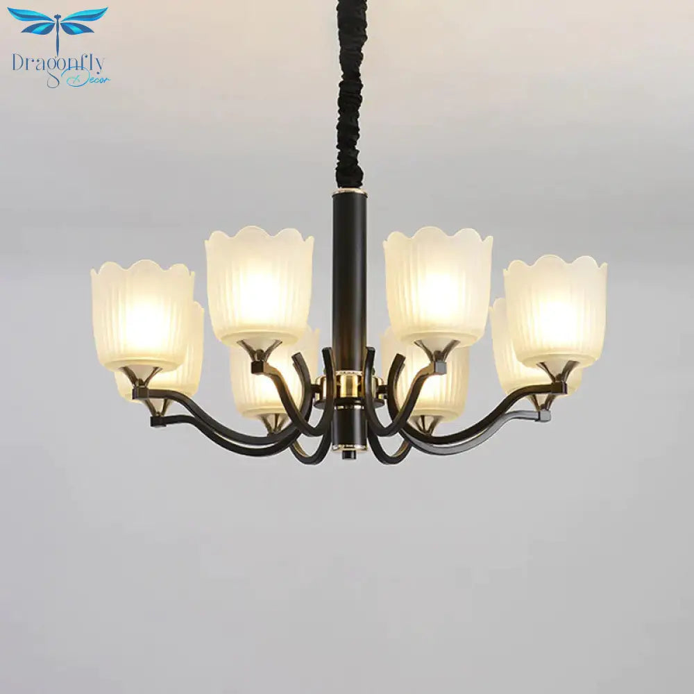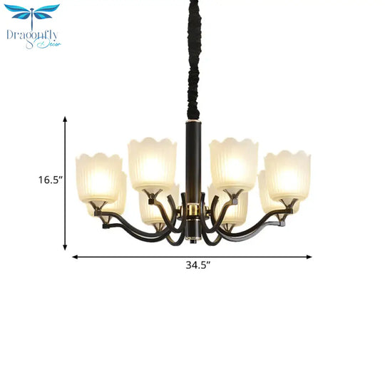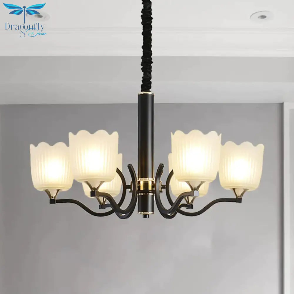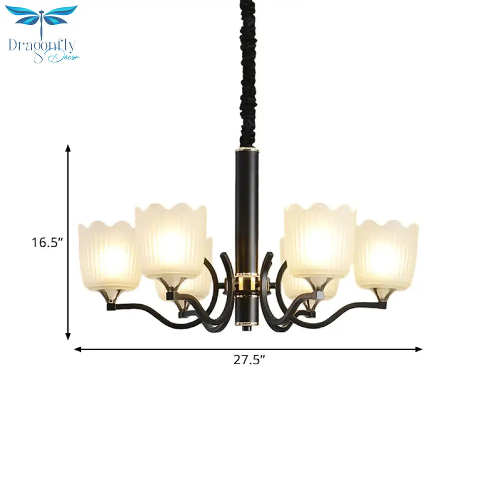 Scalloped Cup Shape Living Room Pendant Traditional Opal Ribbed Glass 3/6/8-Bulb Black Ceiling Chandelier